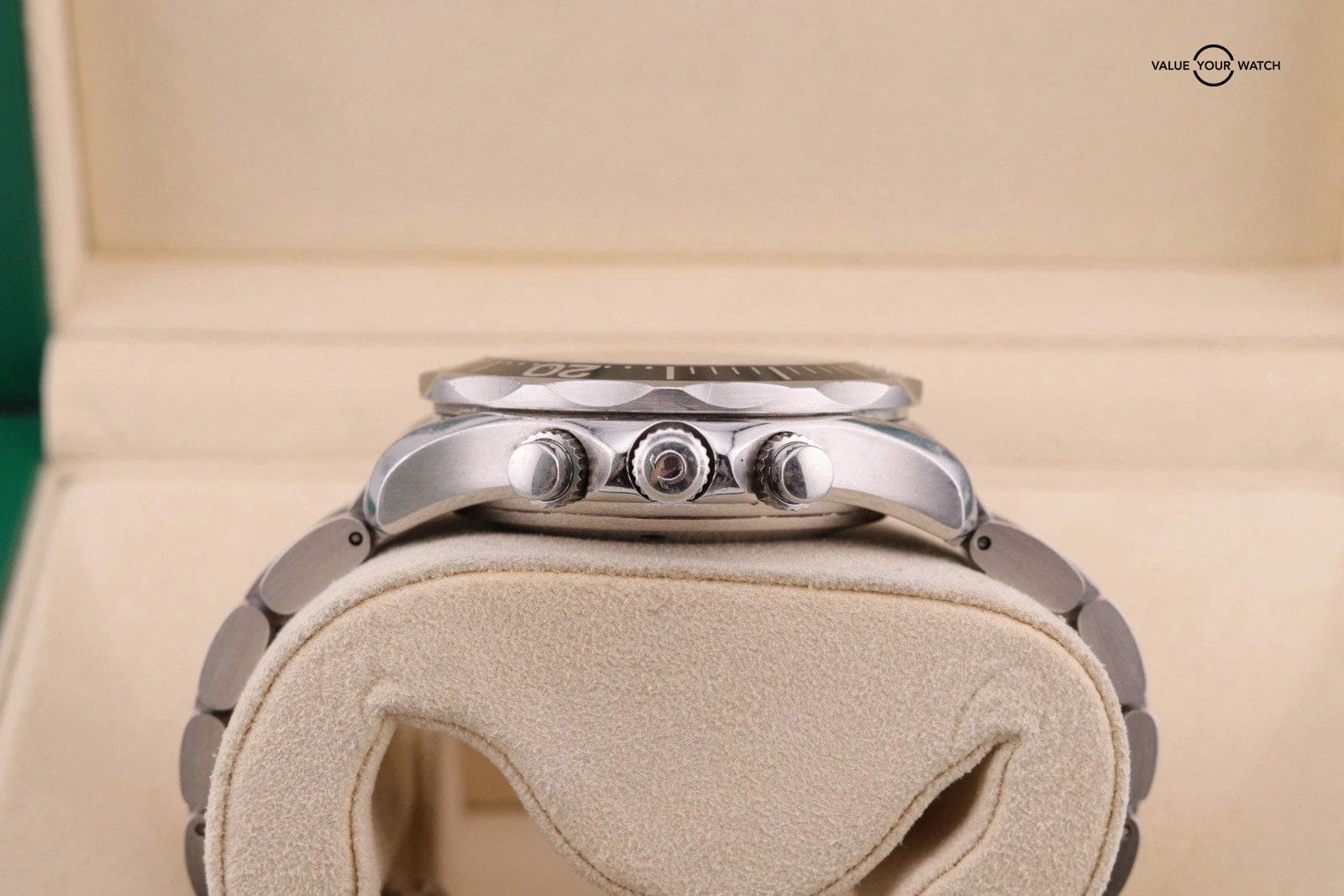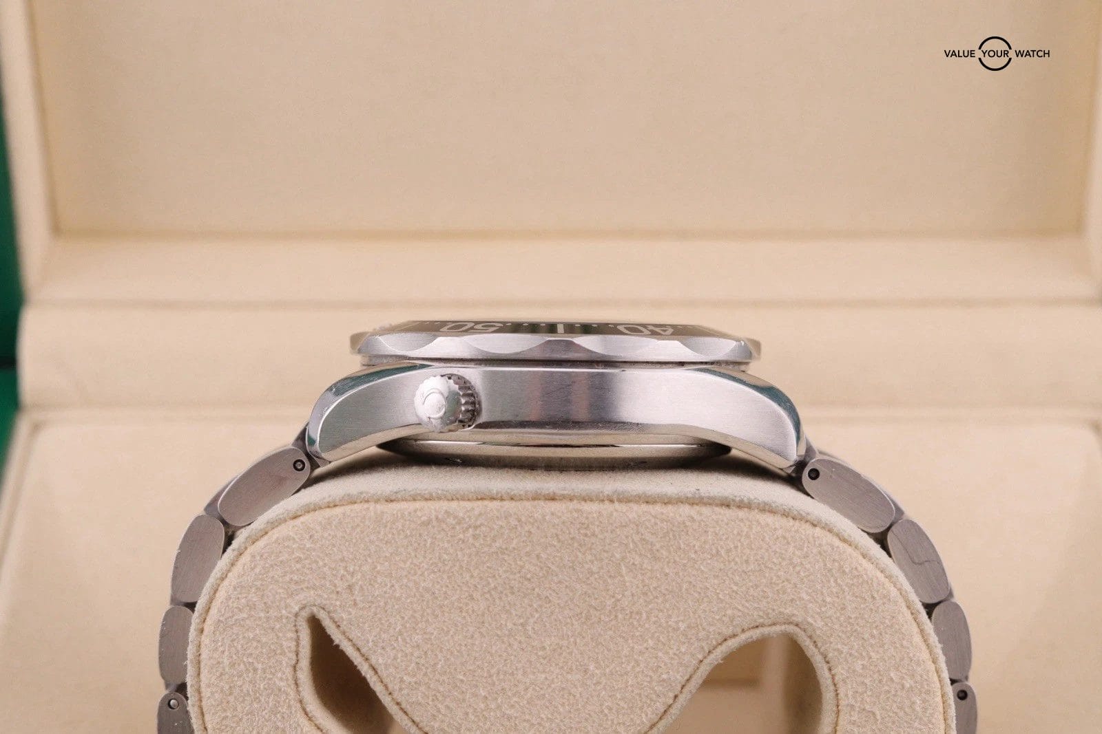 Powered by the Omega Caliber 1164 automatic movement, it offers chronograph functionality, a 44-hour power reserve, and a screw-down crown with helium escape valve. The black aluminum unidirectional bezel and 300m water resistance make it a reliable diver’s companion.