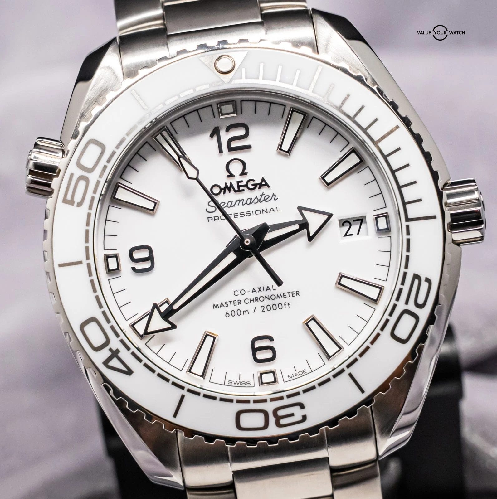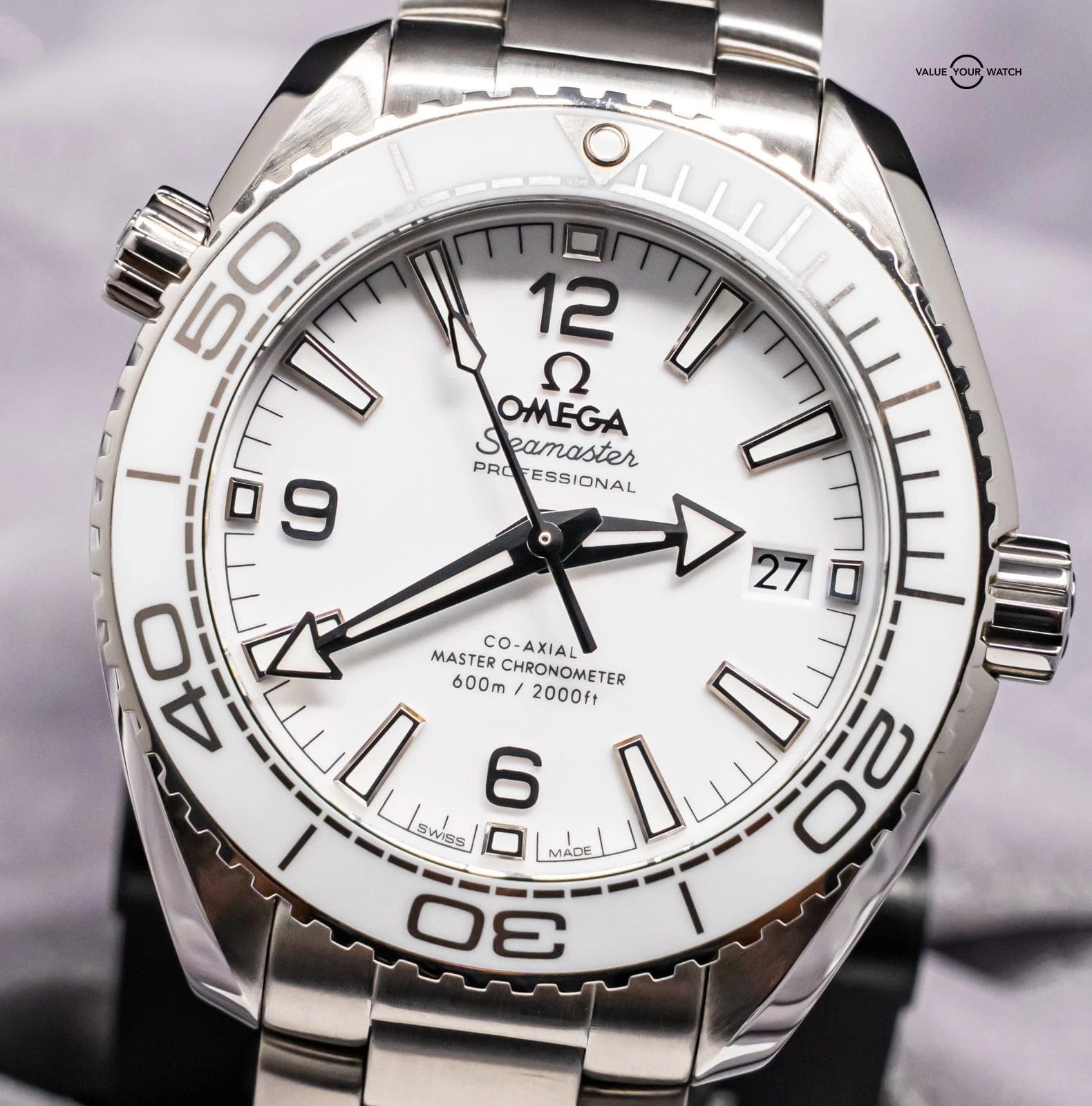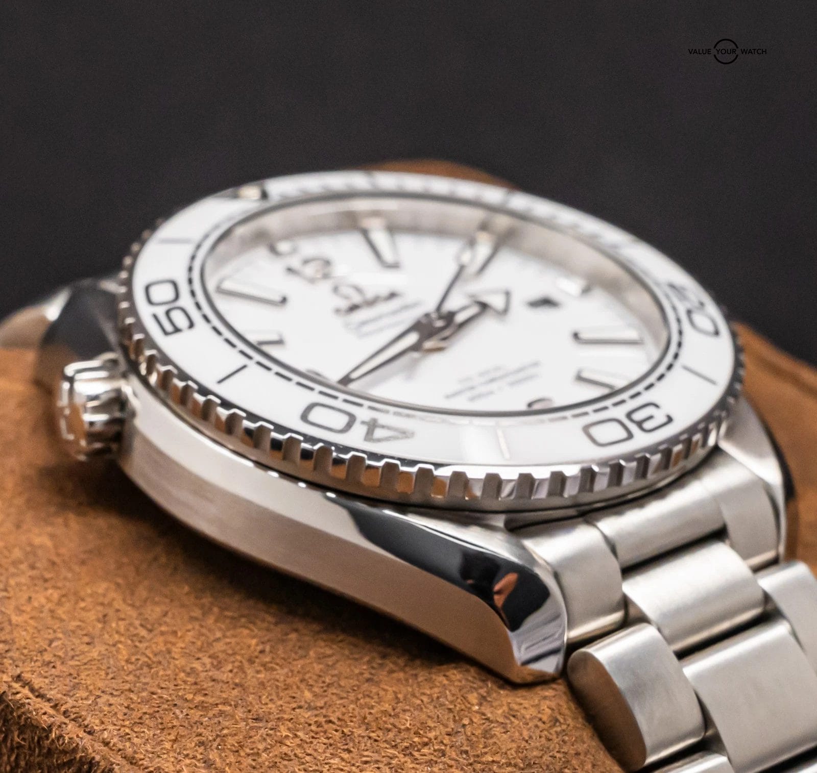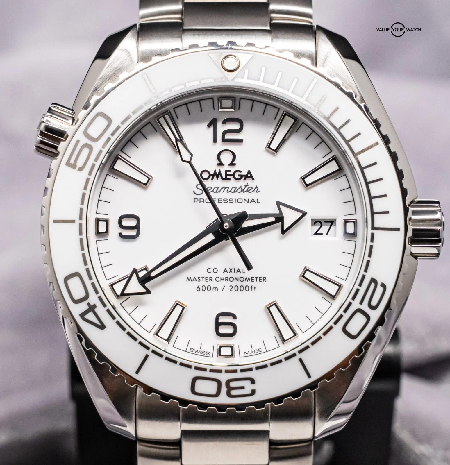 STUNNING Omega Seamaster Planet Ocean 600M in 39.5 mm RARE White! Powered by the Master Co-Axial 8800 and is KILLER White Ceramic Bezel combined with the White Dial, Bracelet, and Stainless Steel Case. The watch comes with Omega boxes and papers including the international warranty card, master chronometer card, and the pictogram card. Purchased from an Omega Authorized Dealer in December 2020. Super desirable Omega, perfect for everyday wear. Can easily be dressed up or down with the white color combination and steel case!