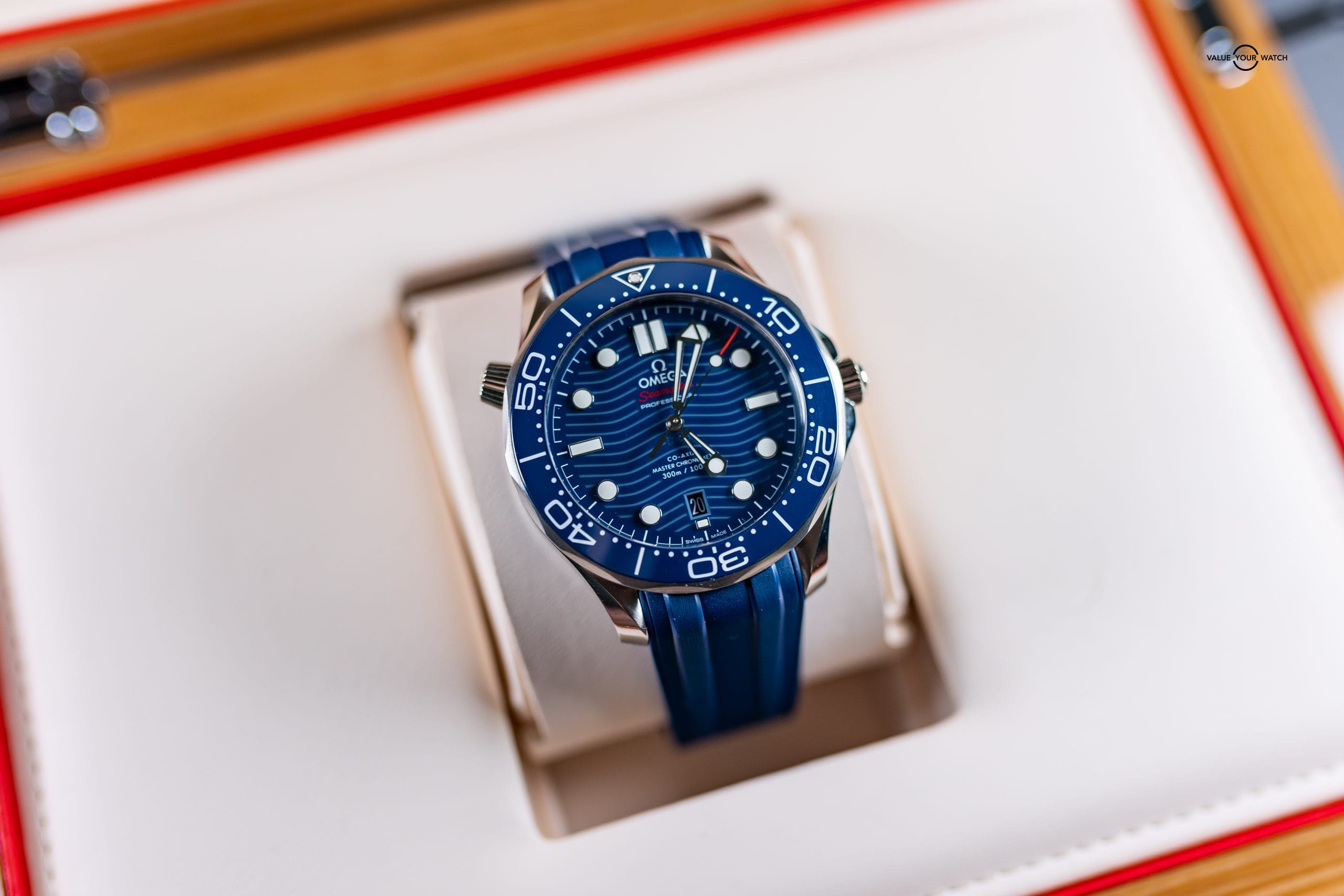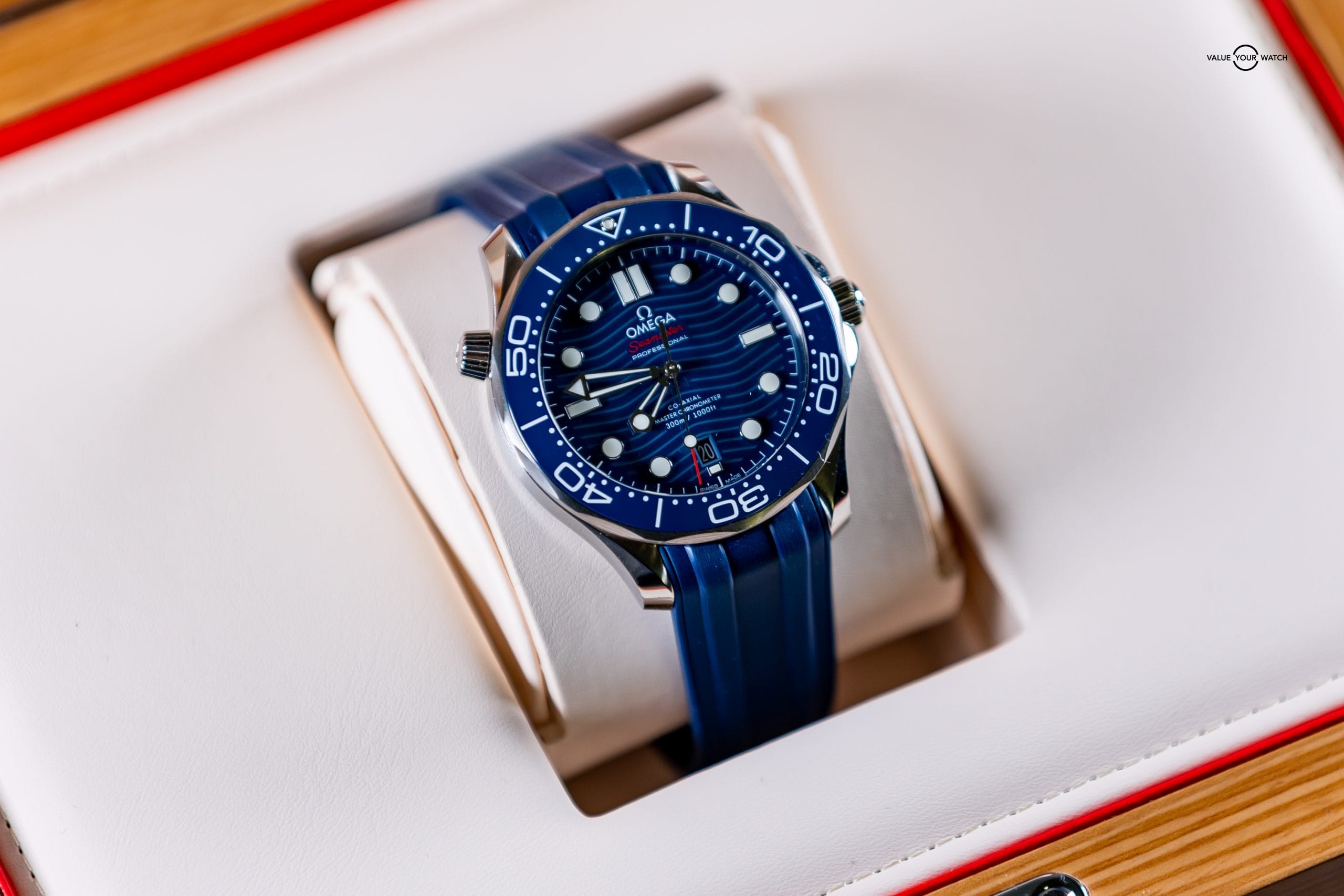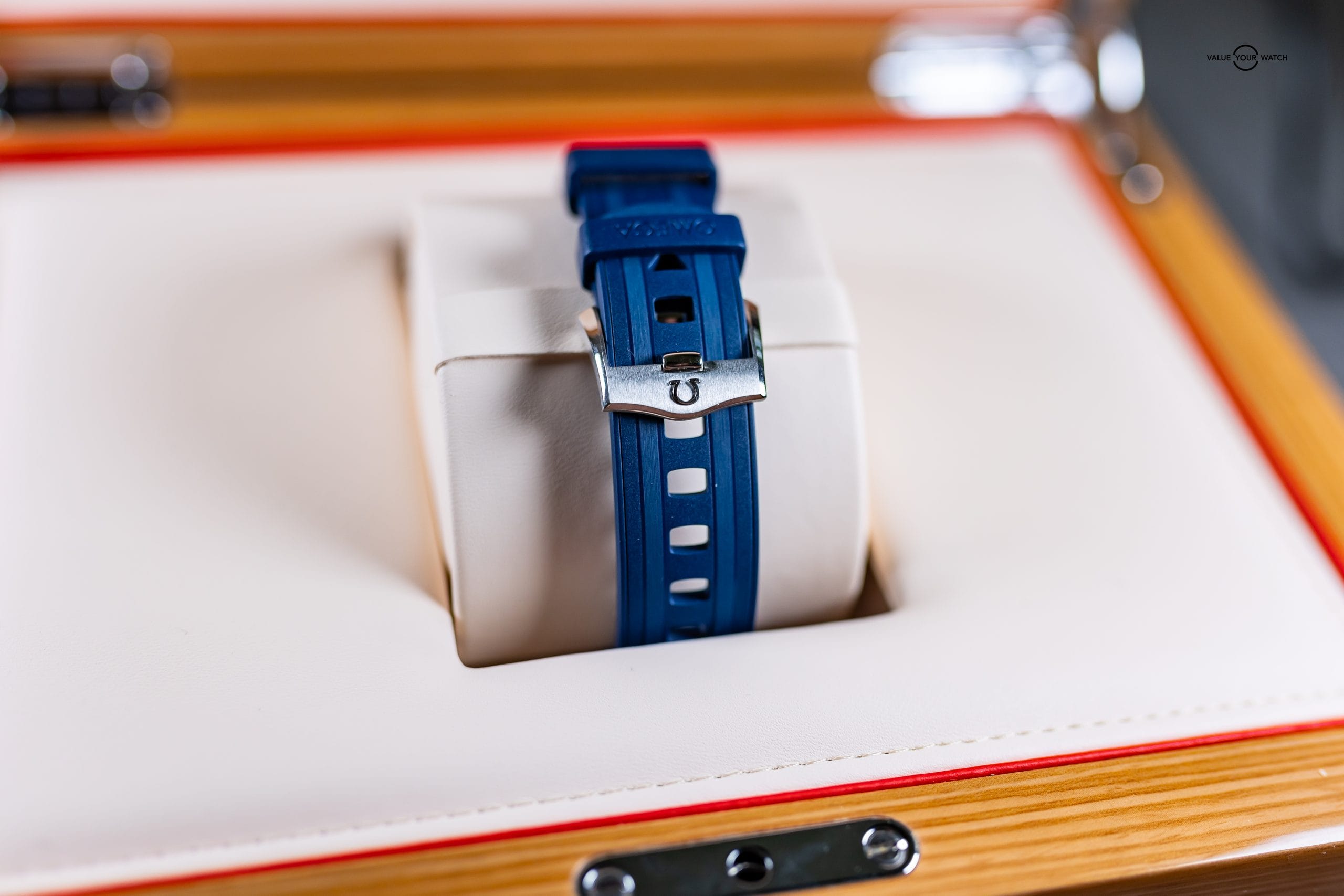 Selling a New Omega Seamaster in Blue with the Omega Rubber bracelet. This is a complete set, completely unworn with protective covers still in place.