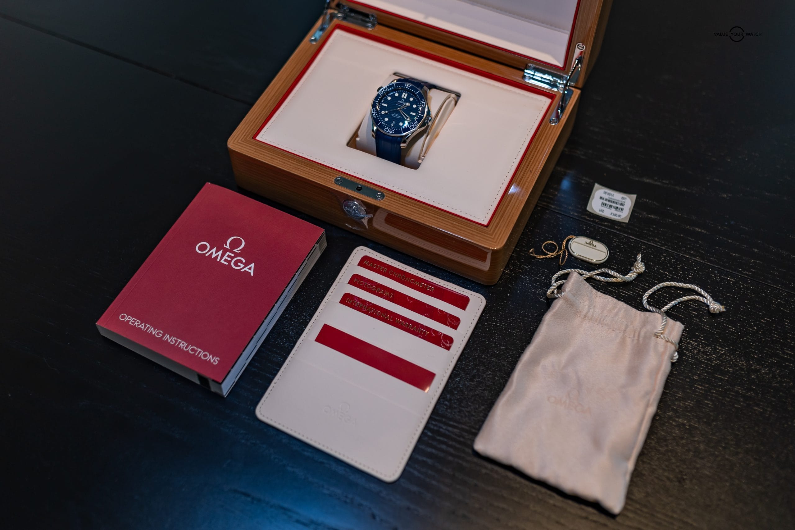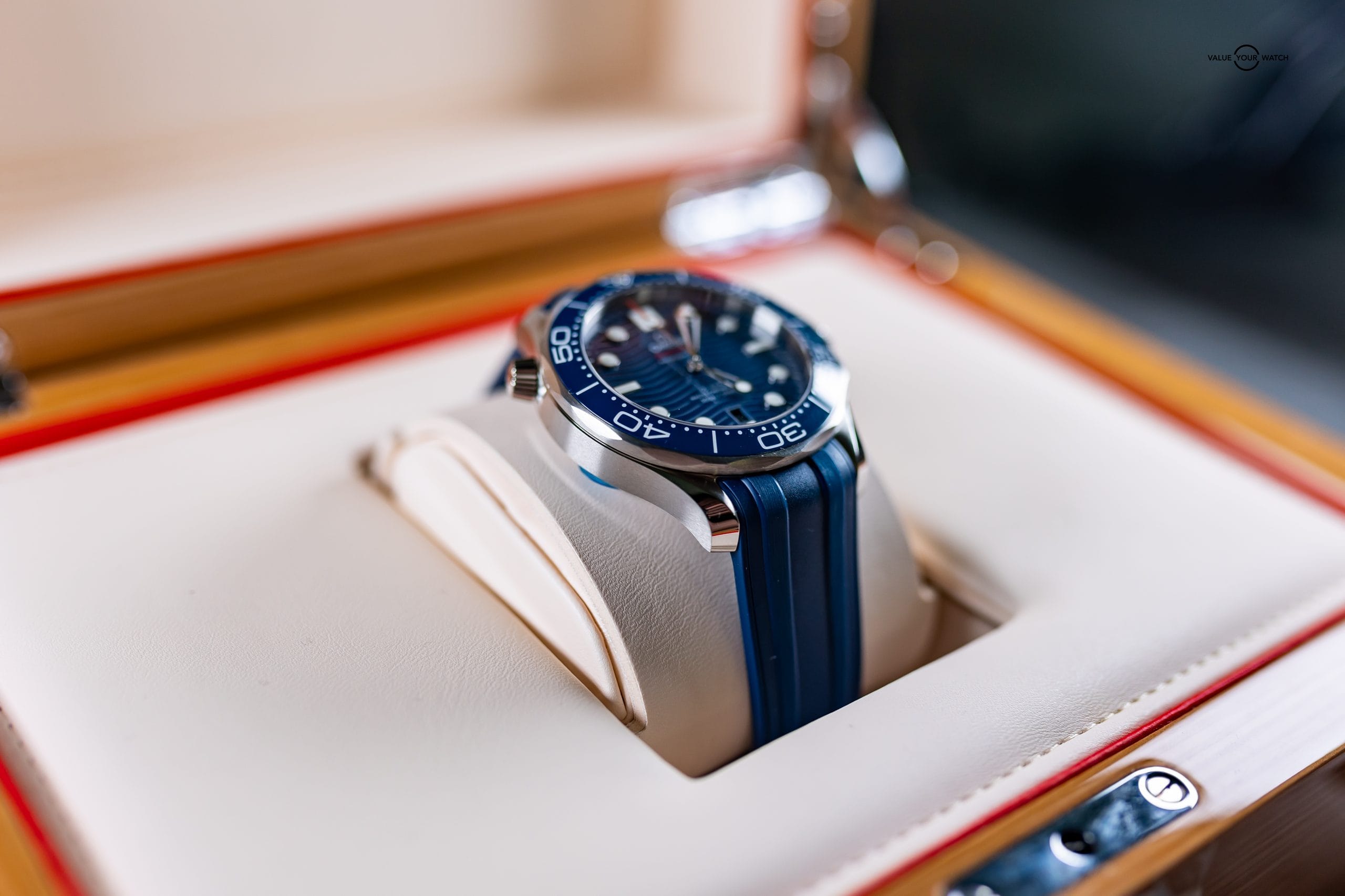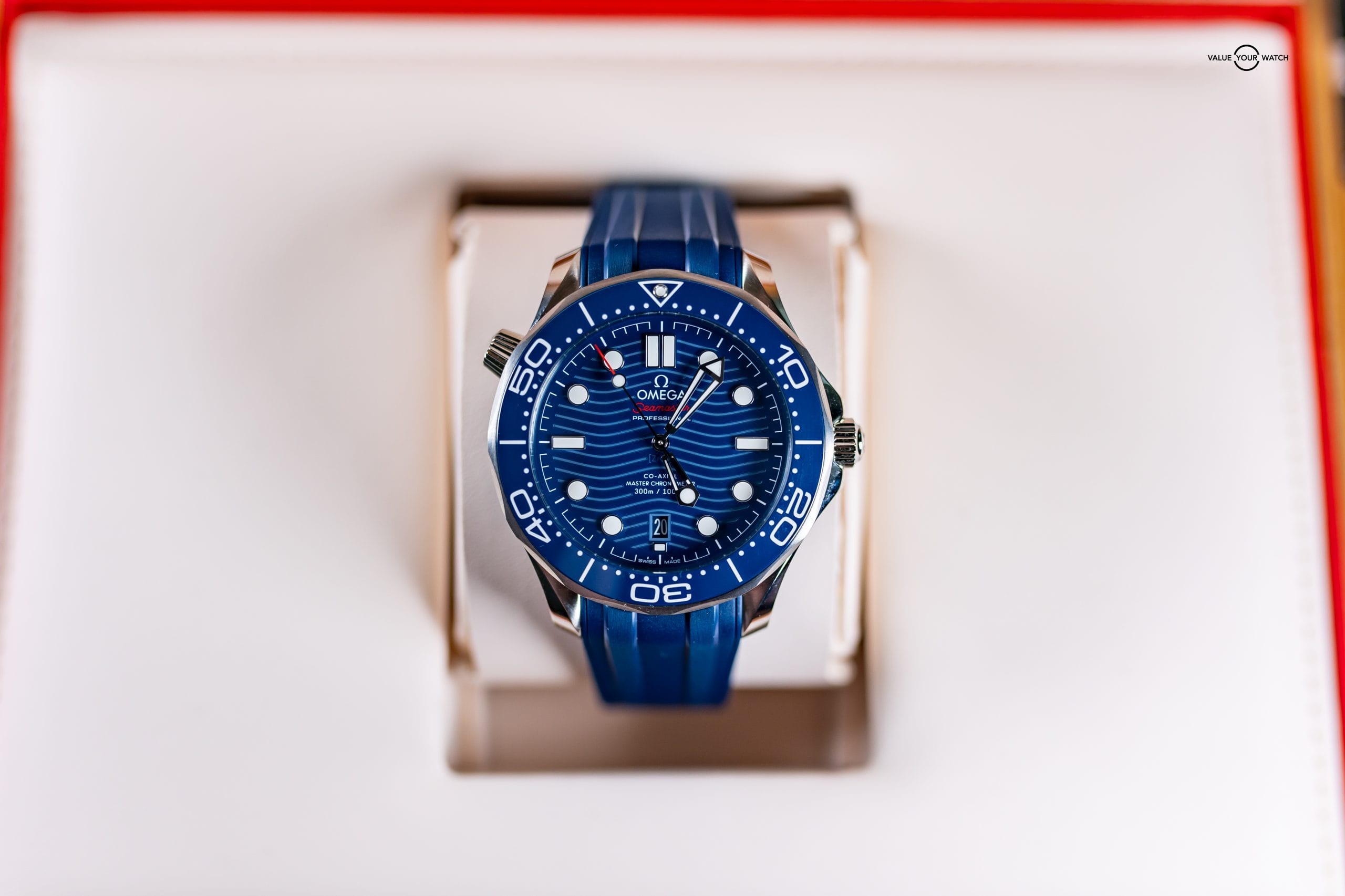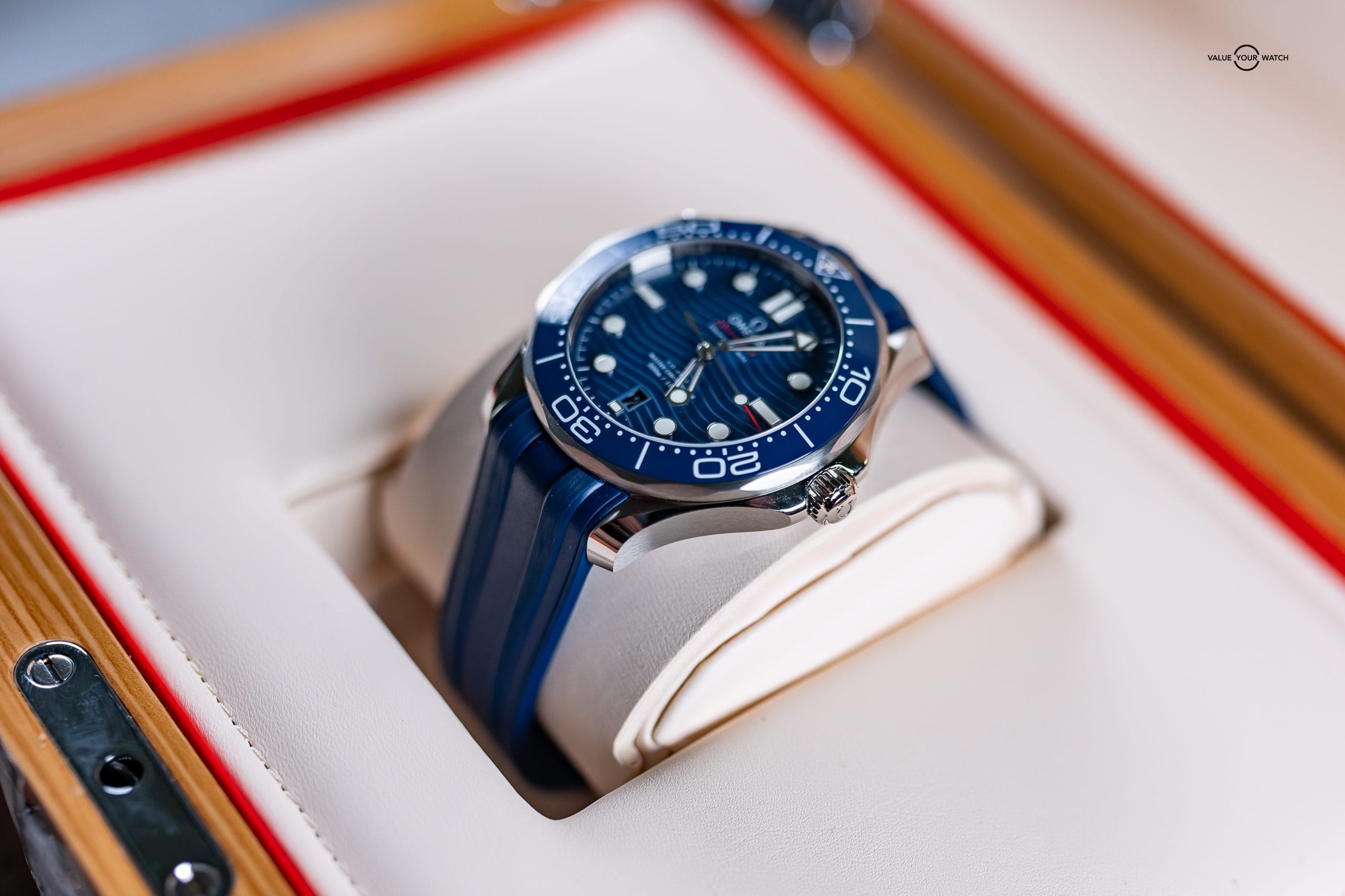 Selling a New Omega Seamaster in Blue with the Omega Rubber bracelet. This is a complete set, completely unworn with protective covers still in place.