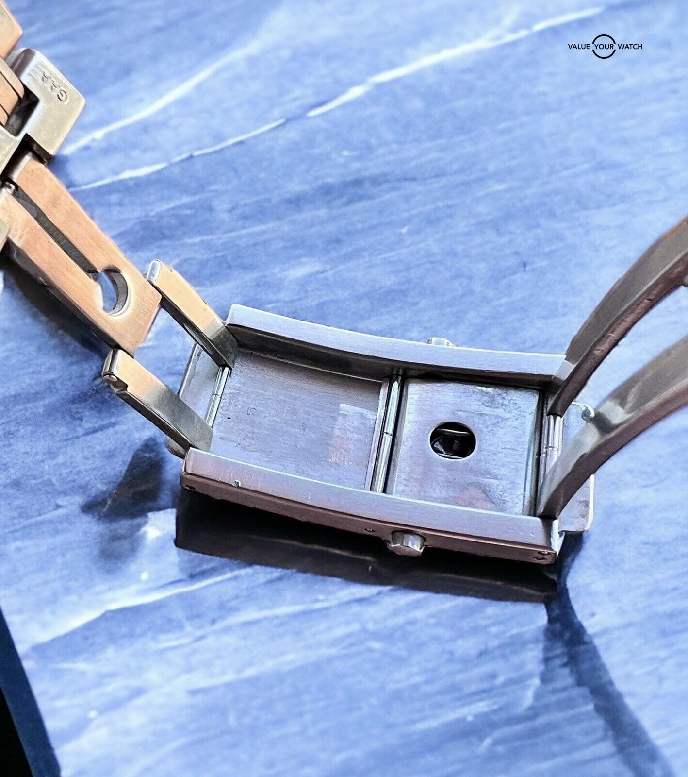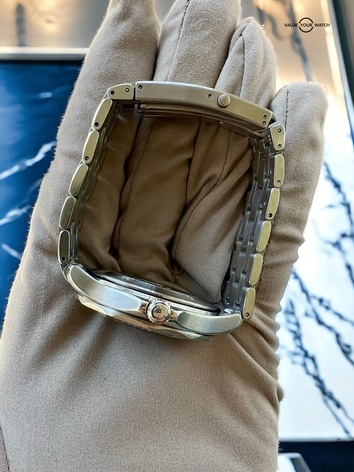 This watch is in good pre owned condition but does have some signs of wear. Please see the photos for exact condition and do not hesitate to reach out with any concerns. It will fit approximately a 7.25” wrist. I can help with sourcing additional links if needed.