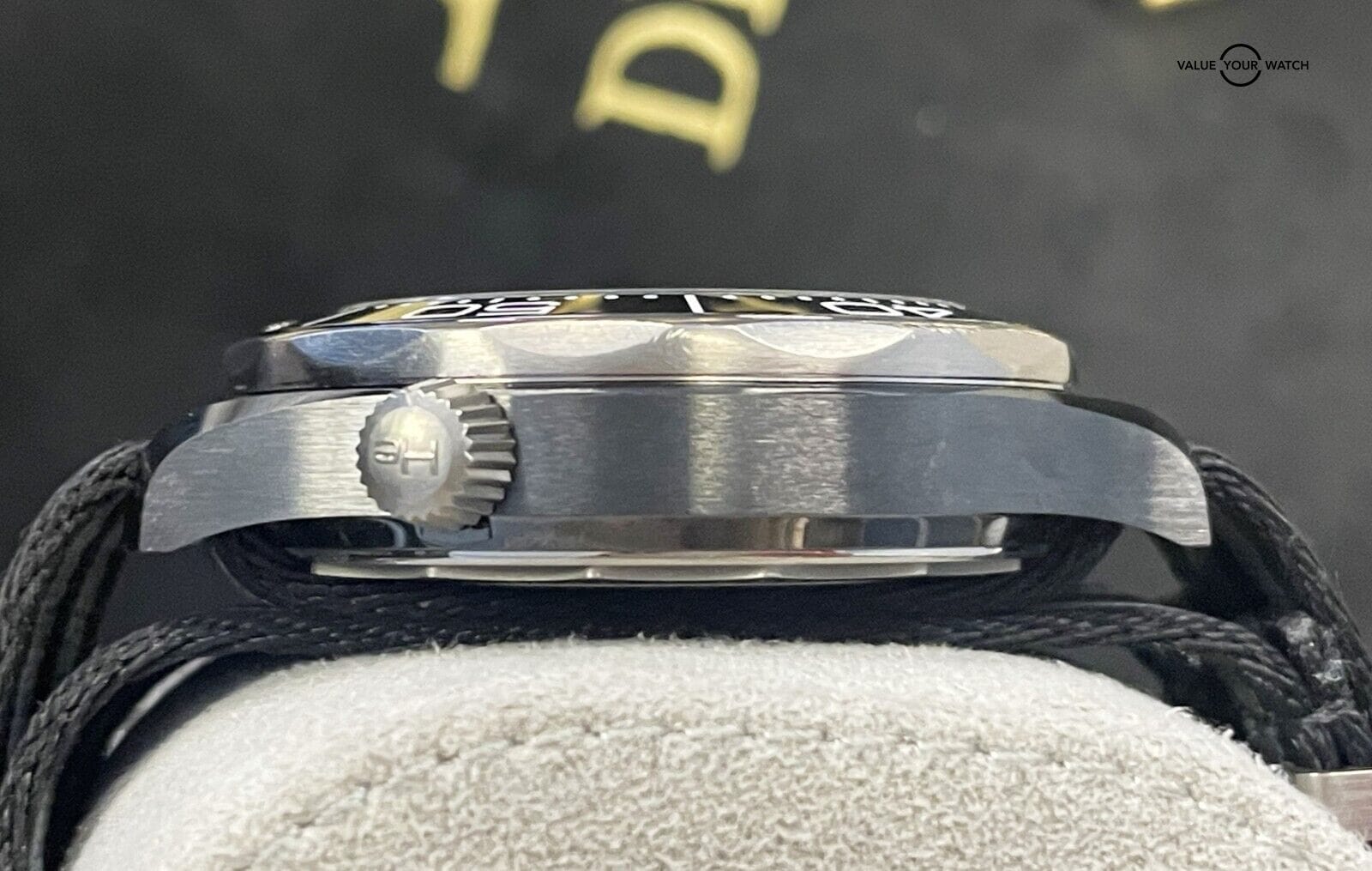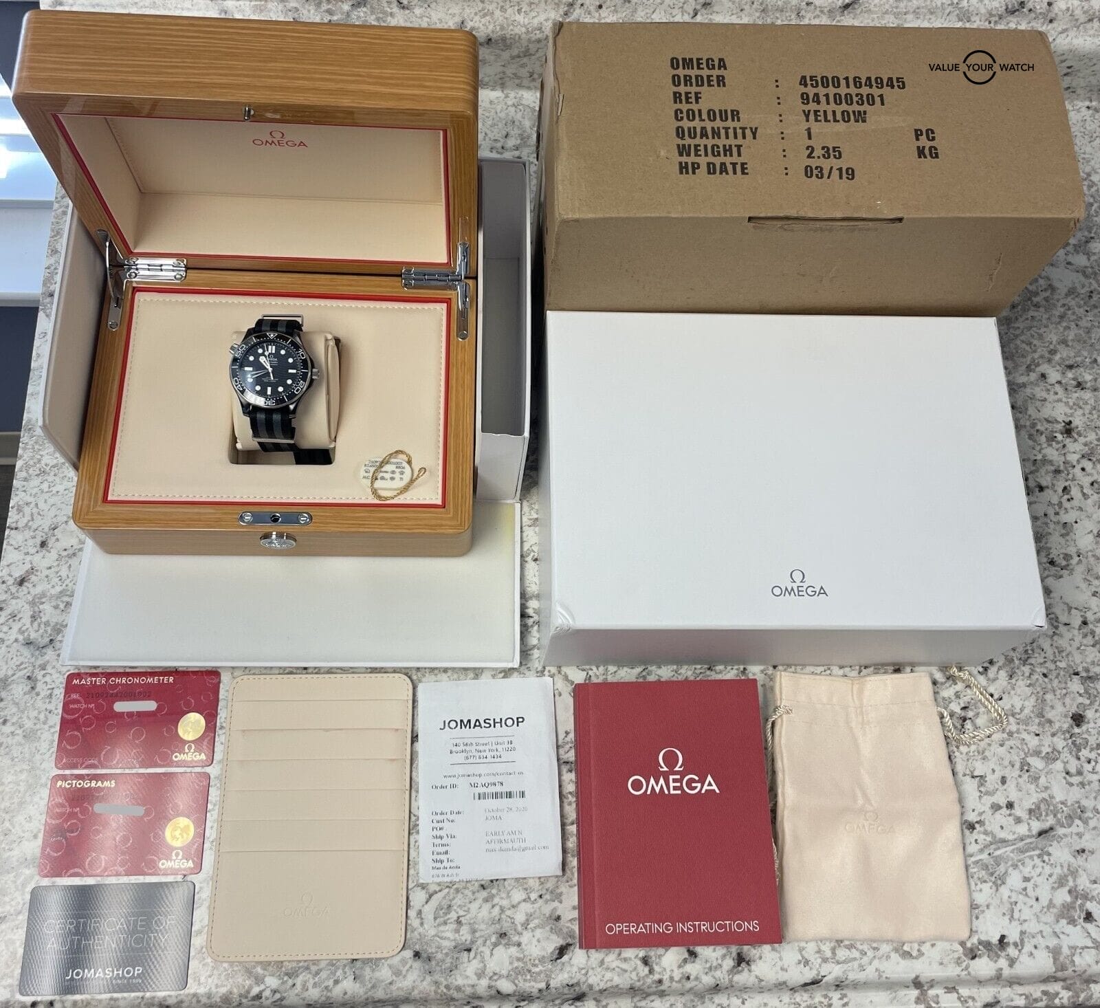 This beautiful timepiece comes complete with the outer cardboard box (shows wear), outer white box, inner pearwood box, hangtags, instruction booklet, and original Pictogram and Master Chronometer Card. The watch was originally purchased through Jomashop and comes with that original receipt (Dated in 2020). The watch is in nice pre-owned condition. The titanium bezel shows some light wear on edges, crystal has some typical AR wear, and the ceramic bezel insert has a few light hairlines that can be seen under a loupe. The nato strap has a little wear but still plenty of life left in it. Pay close attention to the pictures as they accurately describe the condition. Mechanically the watch is functioning as it should. Serial numbers and names are blurred in photos only for privacy reasons.