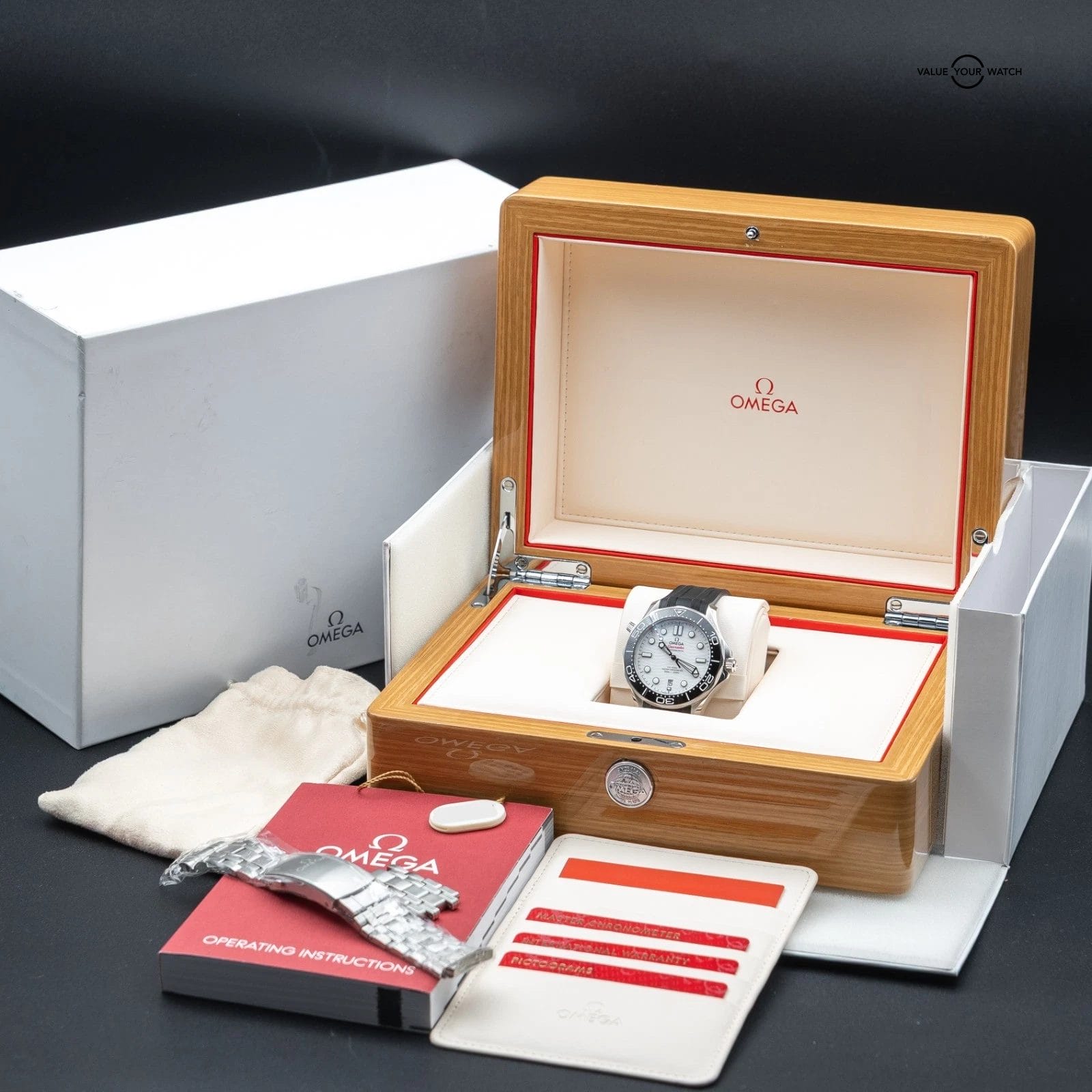Absolutely stunning modern diver in the white dial and comes with both the bracelet and the factory strap and clasp…everything you need and so much value! The new Omega Master Chronometer movement is incredibly mechanically accurate, as well as being a work of art that you can enjoy through the open case-back. Whether at home in the pool, casual, or at work, it covers all your wearing needs.