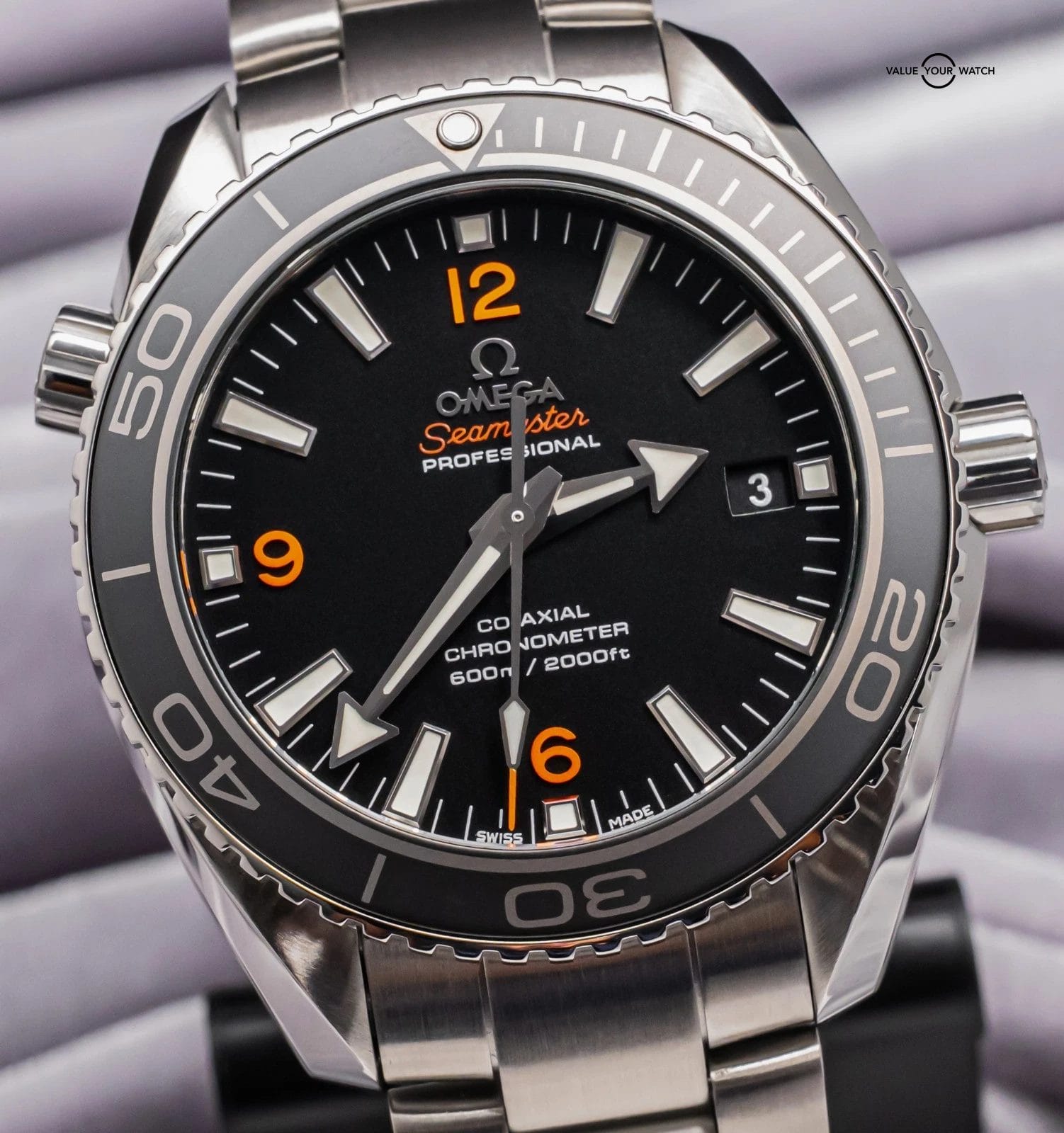 STUNNING Omega Seamaster Planet Ocean 42 mm with Black Dial on Bracelet! Arrives with the original Omega boxes & papers including the international warranty card and pictogram card. Originally purchased at an Omega Authorized Dealer in May 2016. Super classic and desirable Omega; perfect for everyday wear and incredibly iconic with the orange numeral accents. Can easily be dressed up or down with the black color combination and steel bracelet!