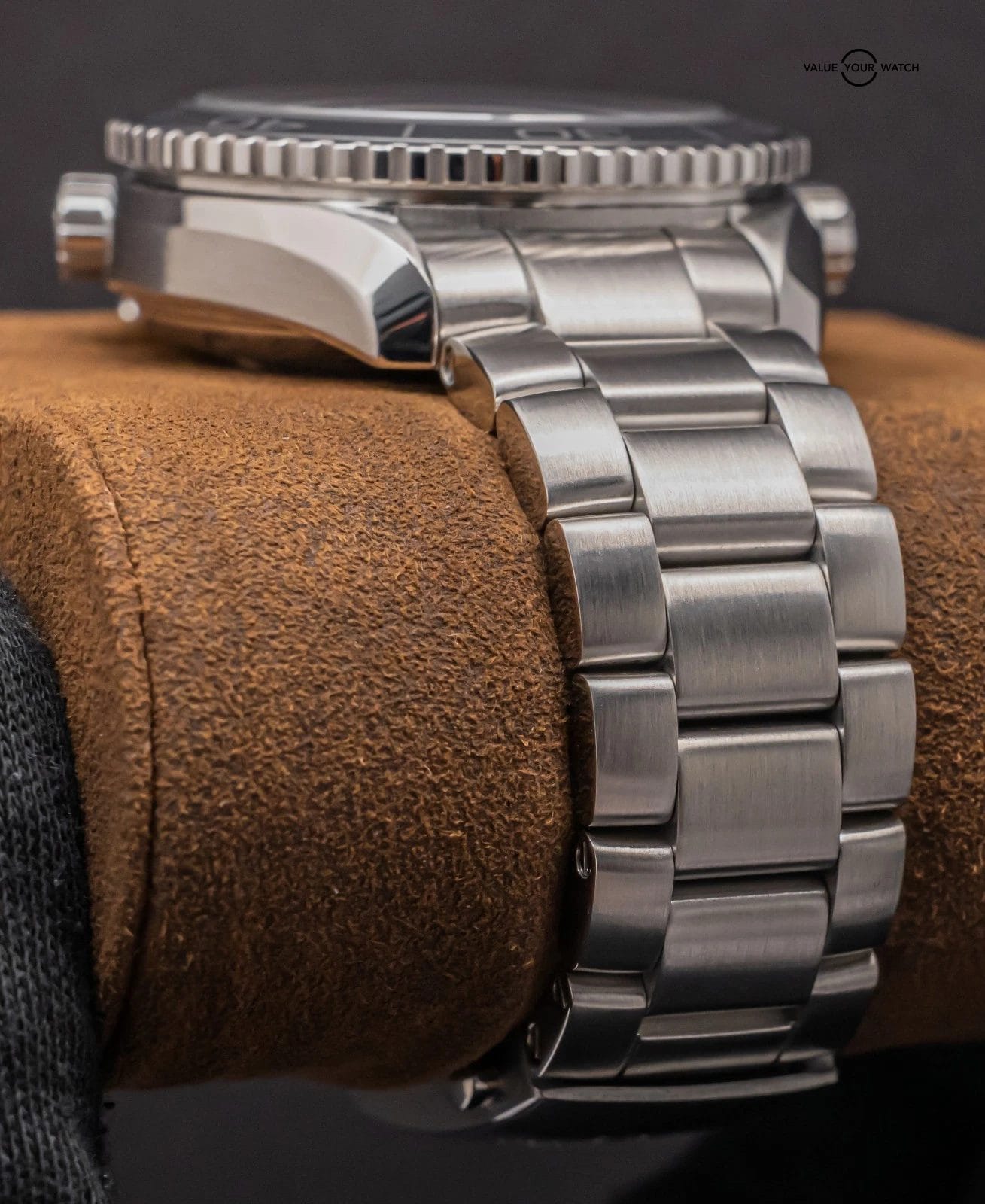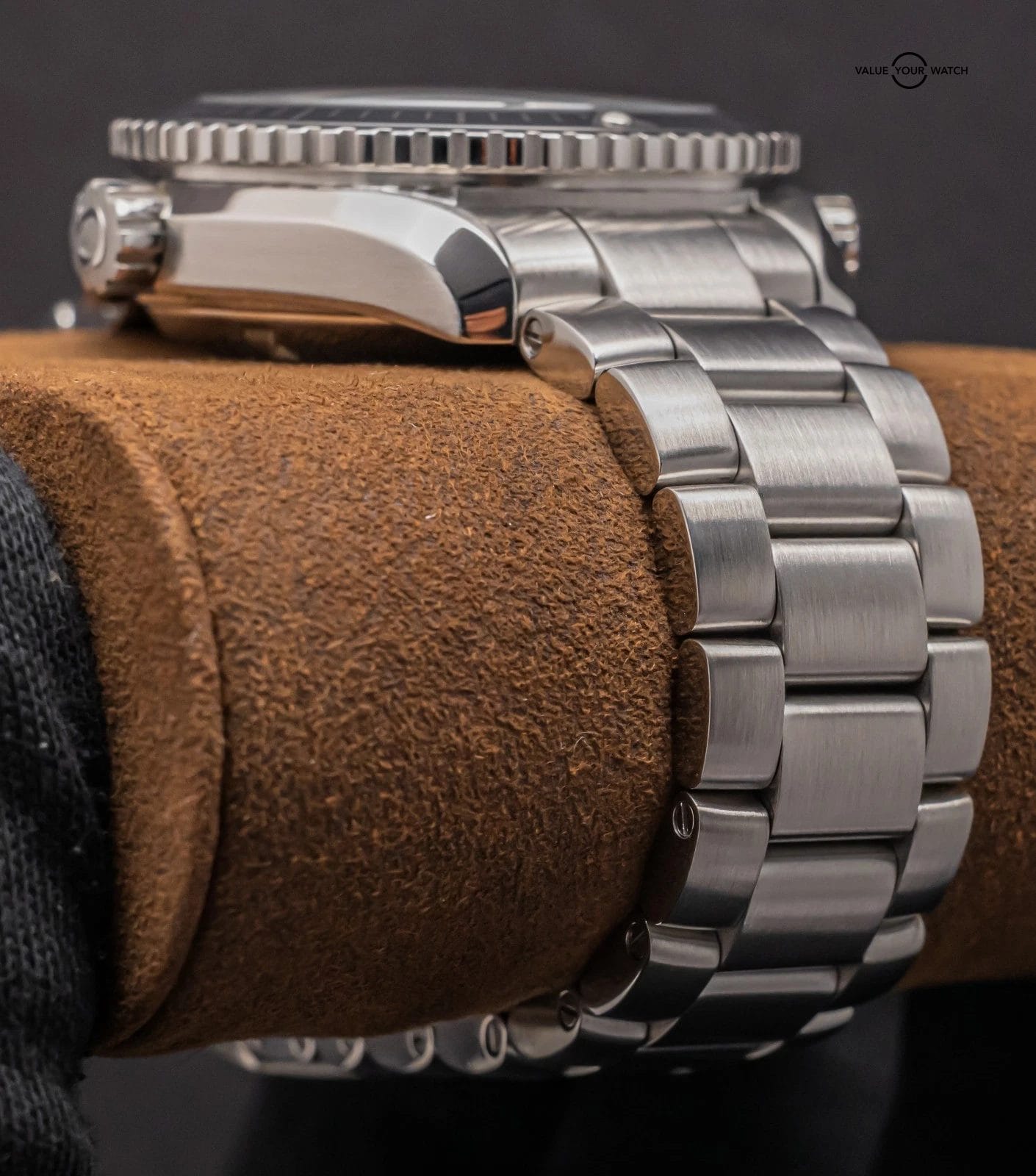 Do not hesitate to contact me with any questions. I sell over 700 watches per year, have fantastic reviews online, and thousands of references; I seek a very simple and pleasant buying experience for my clients through fostering relationships in the watch community. The serials have been blurred for privacy. The bracelet can accommodate a 7.75 inch wrist at maximum without additional links before utilizing the diver extension.