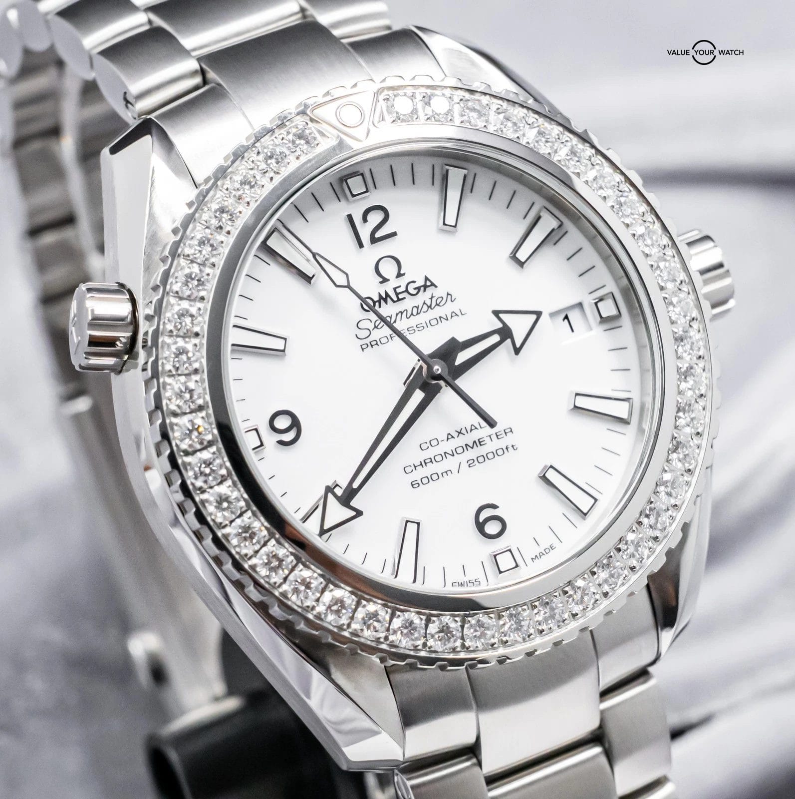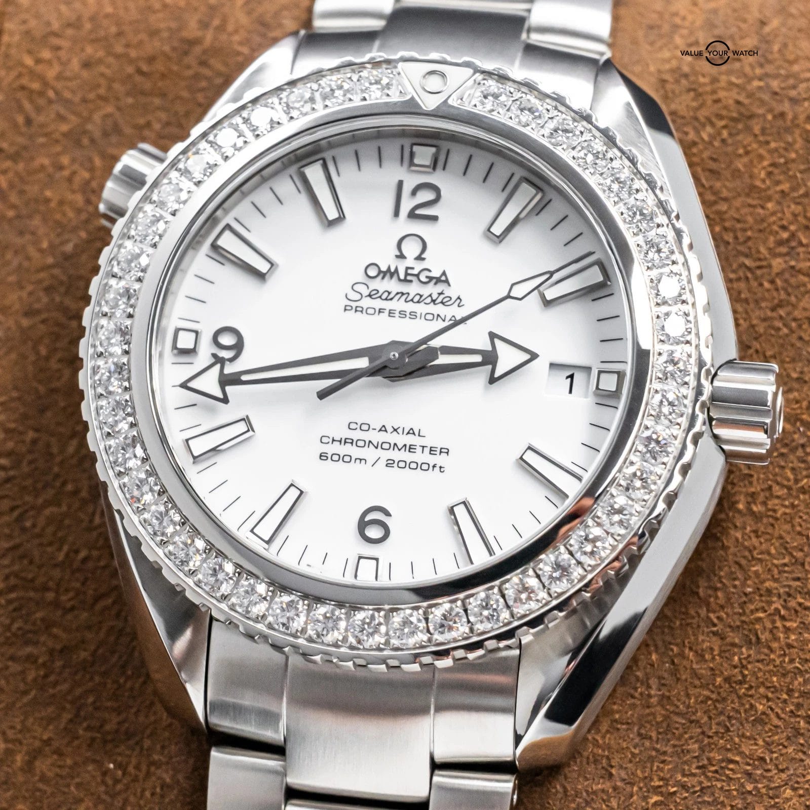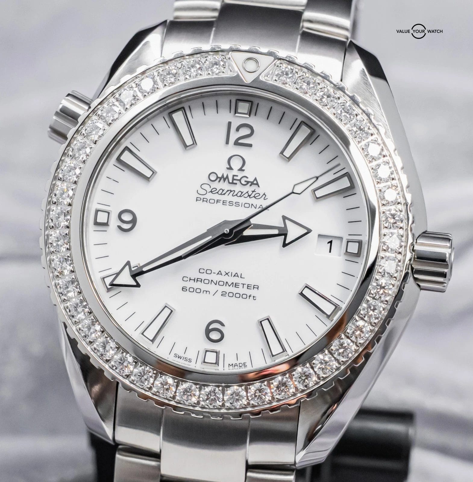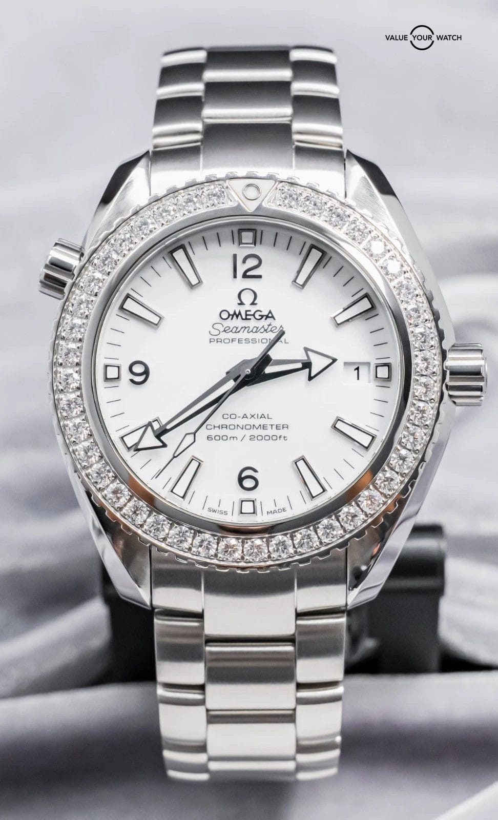 STUNNING Omega Planet Ocean 600M 42 mm in Stainless Steel with the *INCREDIBLY RARE* Factory-Omega-Set Diamond Bezel and White Dial on Brushed Stainless Steel Bracelet! Housing the In-House Omega 9300 Movement and arrives with original Omega boxes. To say that this model is rare, is an understatement, as I’ve never seen another for sale. Super high original MSRP at $17,200. As we speak, this is the only one for sale globally!