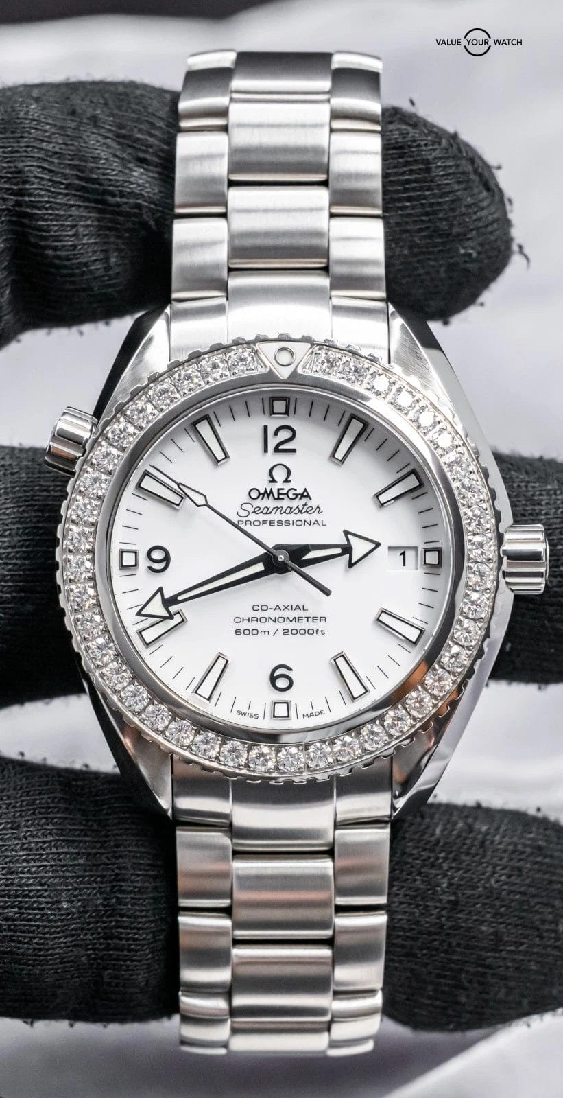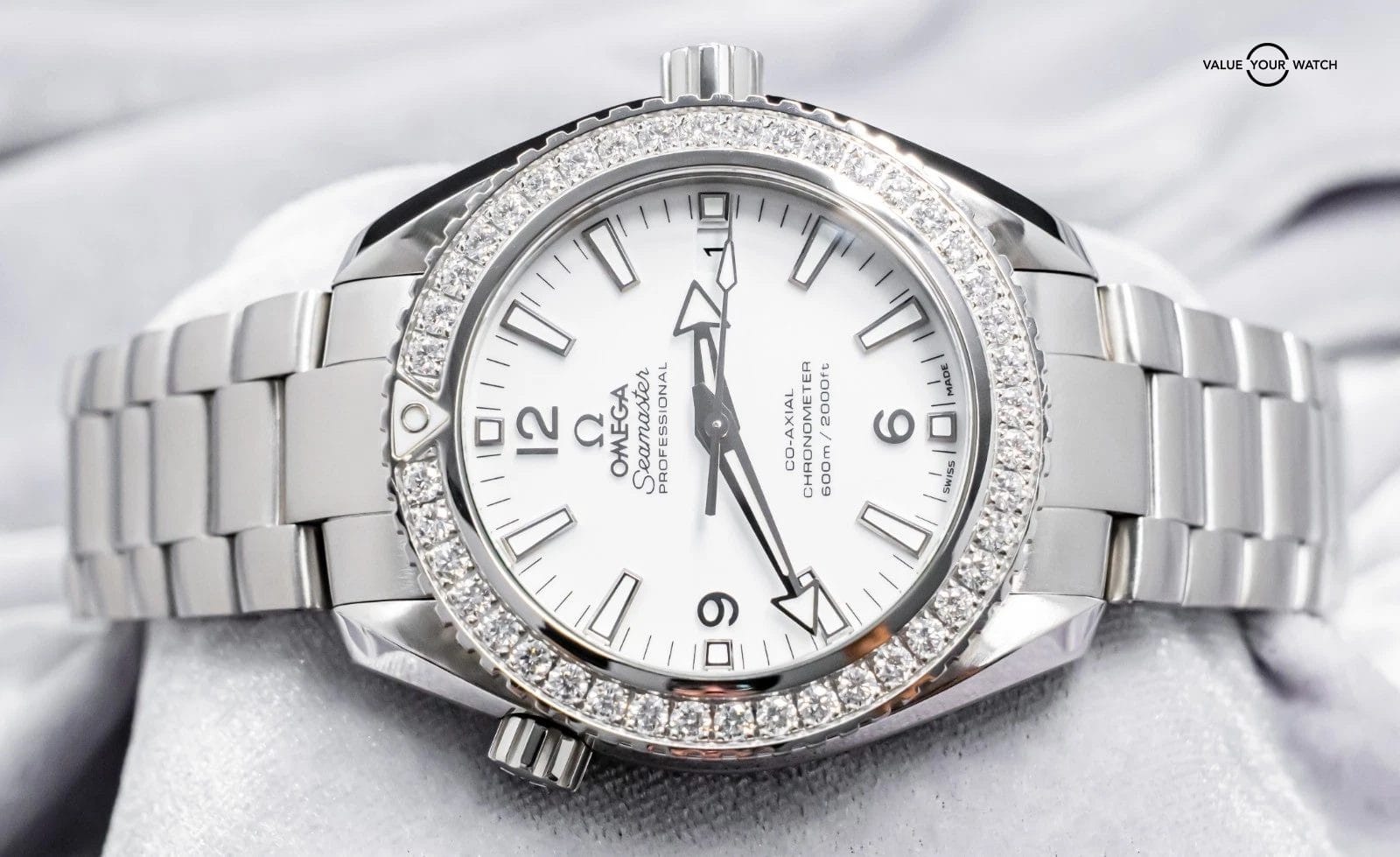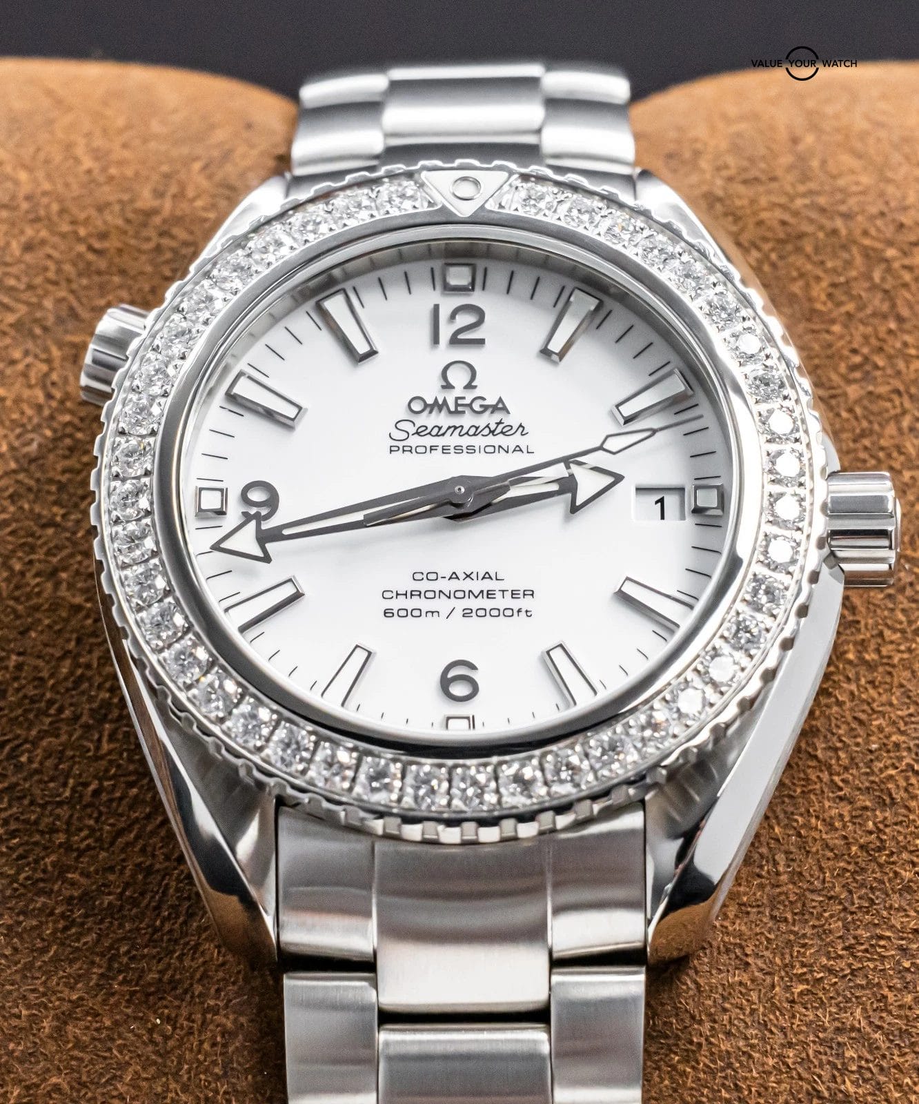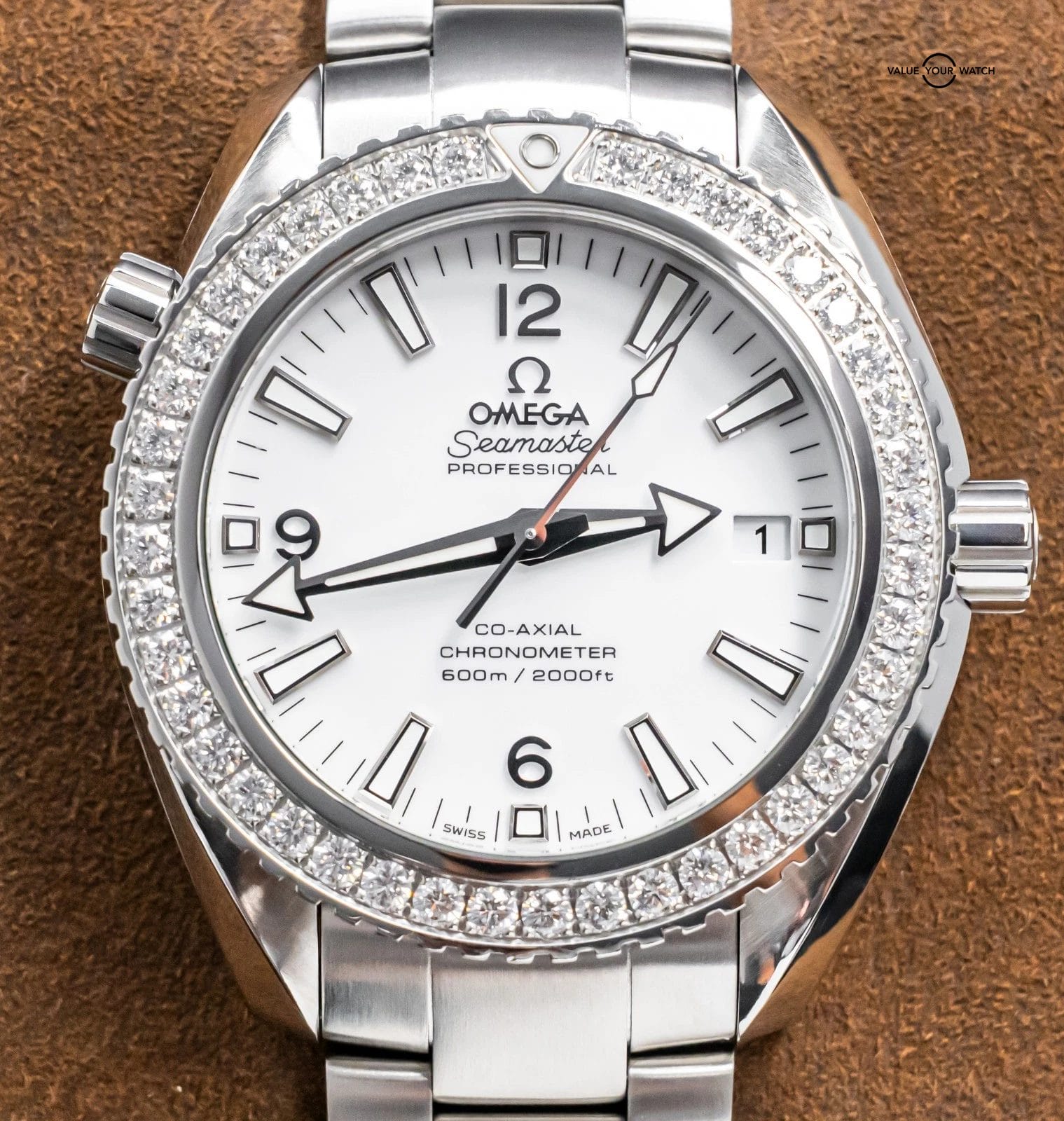 STUNNING Omega Planet Ocean 600M 42 mm in Stainless Steel with the *INCREDIBLY RARE* Factory-Omega-Set Diamond Bezel and White Dial on Brushed Stainless Steel Bracelet! Housing the In-House Omega 9300 Movement and arrives with original Omega boxes. To say that this model is rare, is an understatement, as I’ve never seen another for sale. Super high original MSRP at $17,200. As we speak, this is the only one for sale globally!