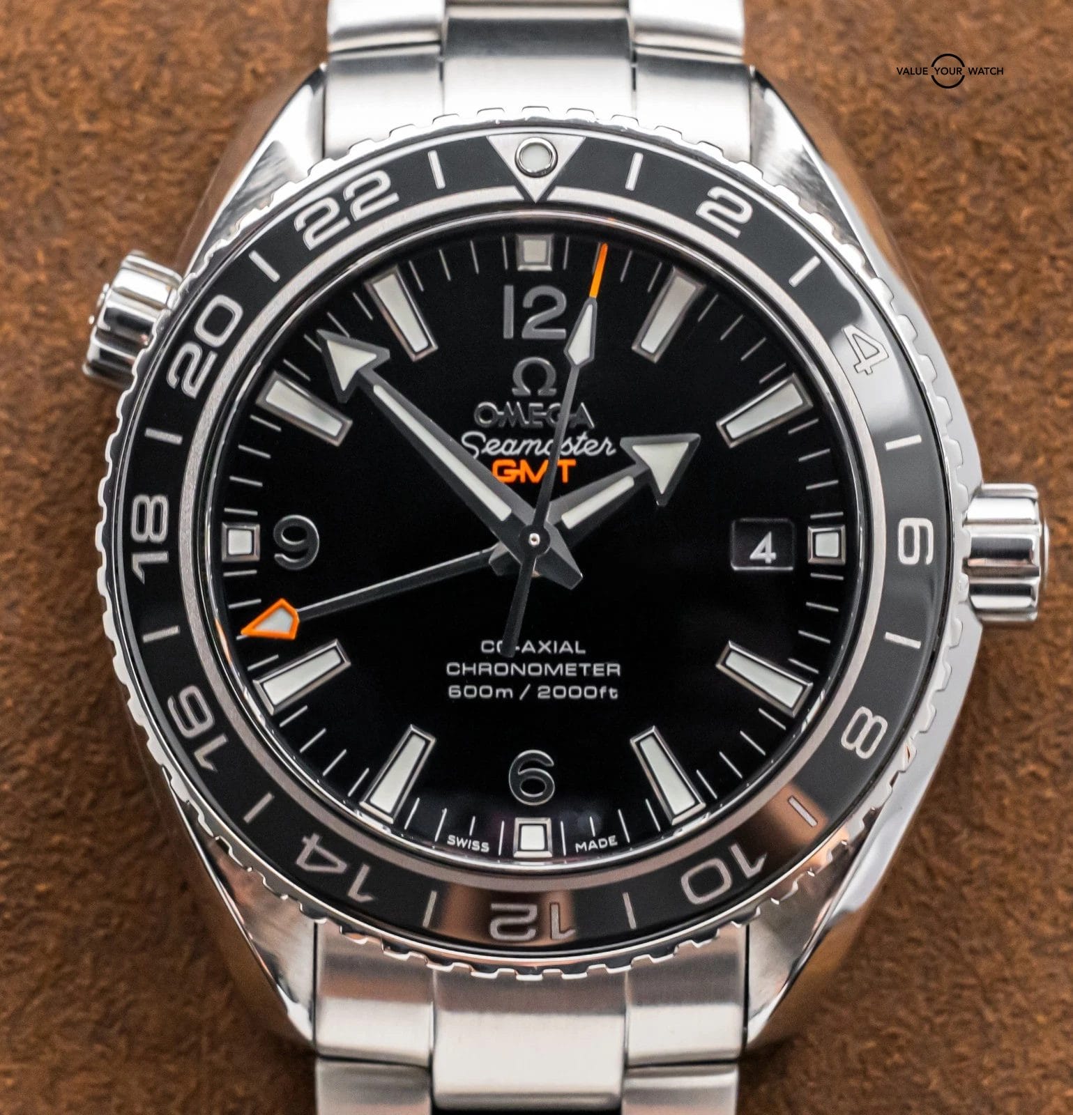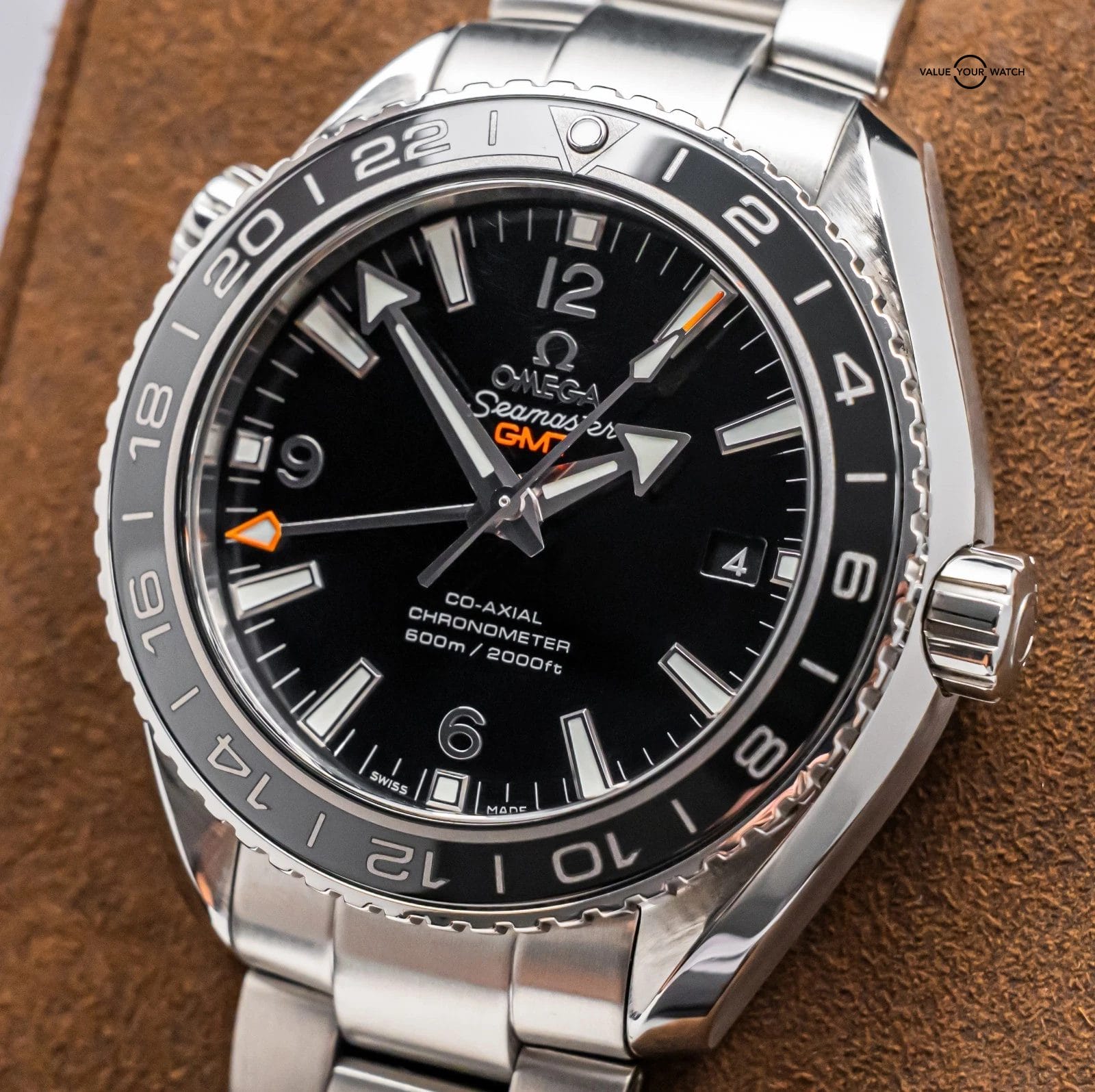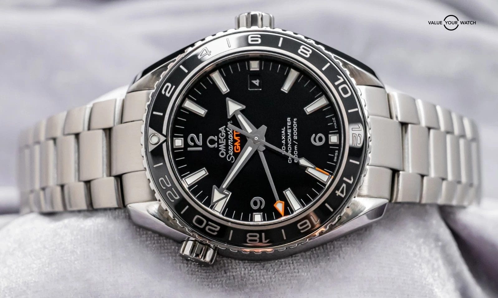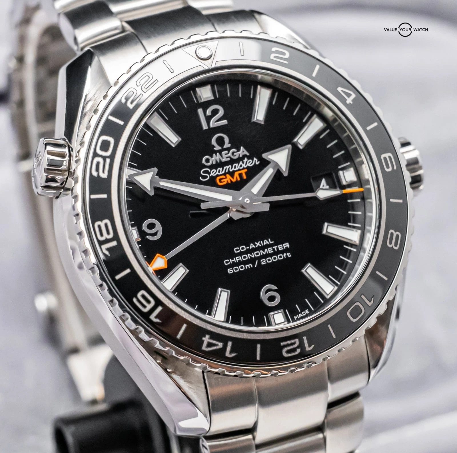 STUNNING Omega Seamaster Planet Ocean 600M GMT in Stainless Steel 43.5 mm with Black Ceramic Bezel & Black Dial on Bracelet! Arrives with original Omega papers including the international warranty card and pictogram card. Originally purchased from a local Omega Authorized Dealer in November 2019. I’ve owned around 50 Planet Oceans, and this is the first Planet Ocean GMT- I must say, I am impressed. The Black Ceramic Bezel, contrasting from the Stainless Steel Case, Silver Numerals, and Orange Accents drives arguably one of the classiest Planet Oceans I have ever seen!
