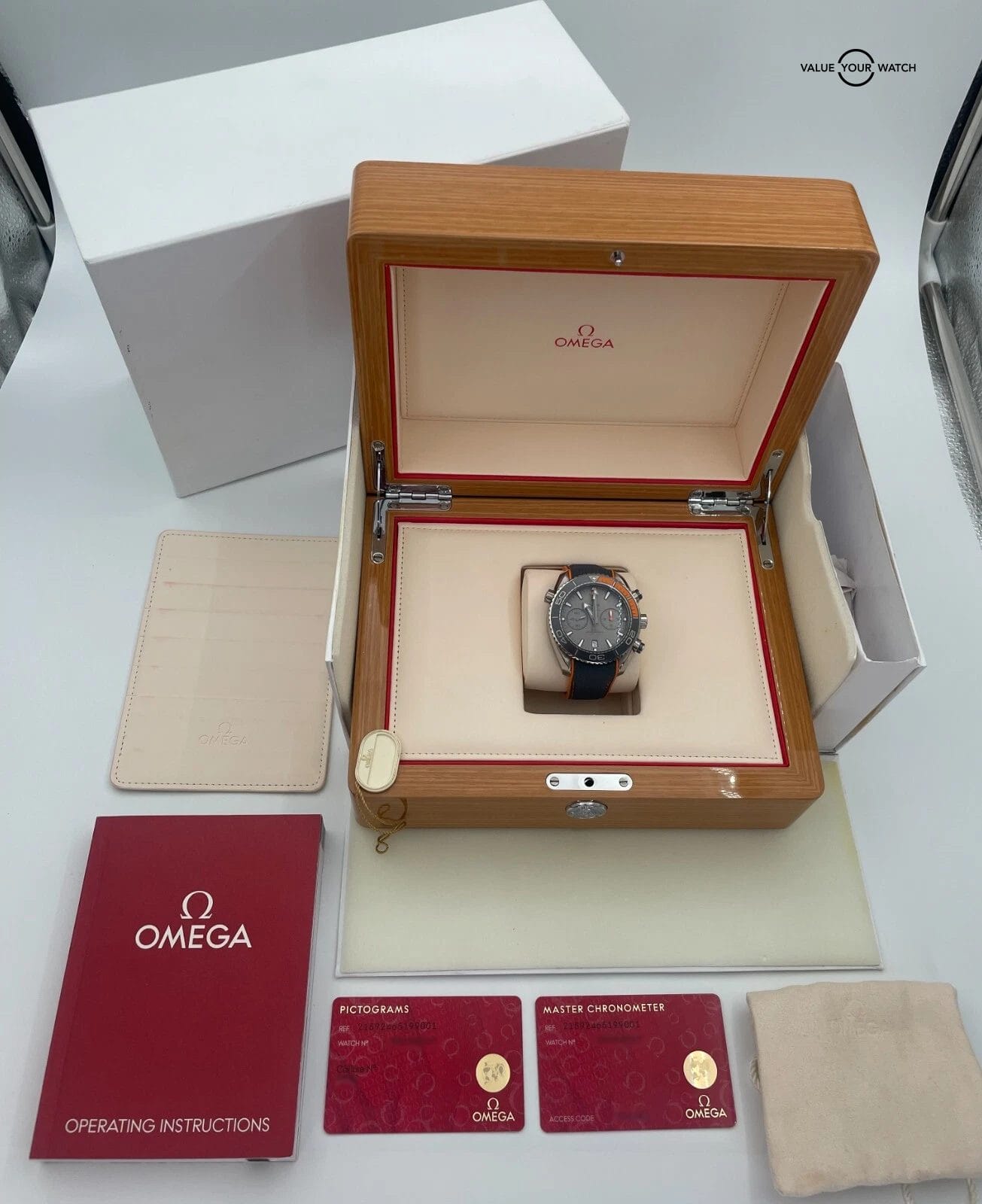 This beautiful timepiece comes with the outer white box, inner pearwood box, hangtag, instruction manual, and pictogram/chronometer card. The watch is in excellent pre-owned condition with typical cosmetic wear on the case and clasp. The crystal is clean with no nicks or scratches. Do not miss your chance to own this classic timepiece. Serial numbers and names are blurred in photos only for privacy reasons. Mechanically the watch is functioning as it should.