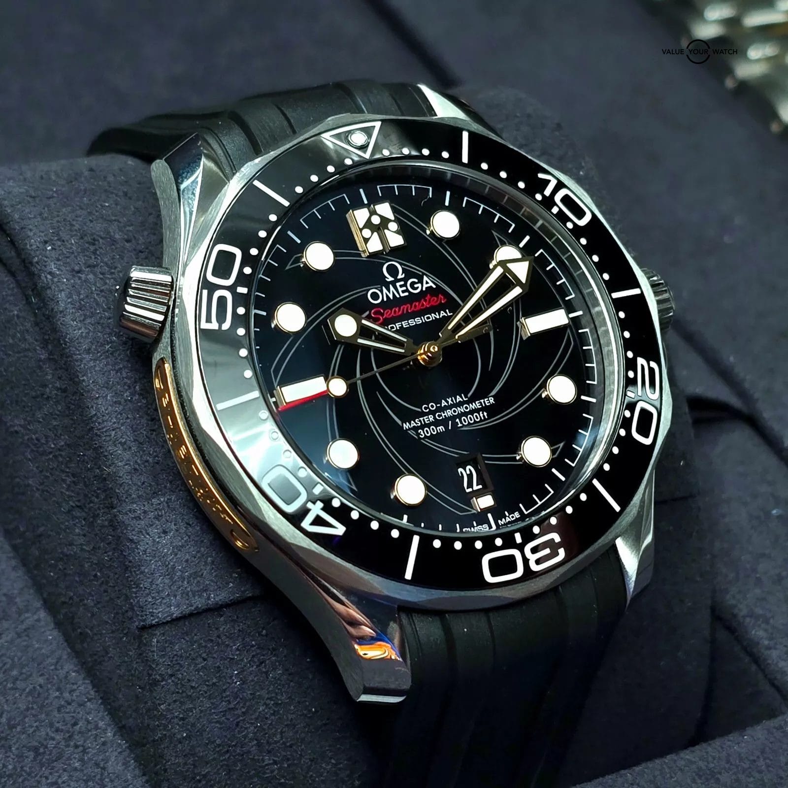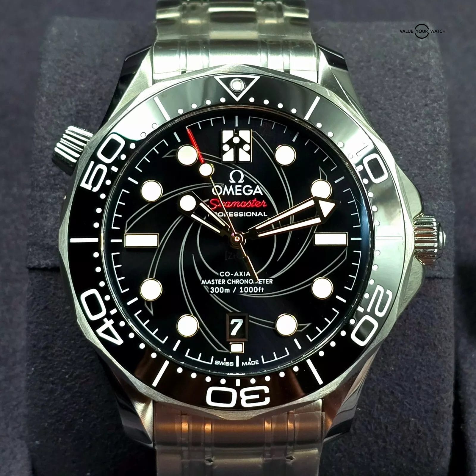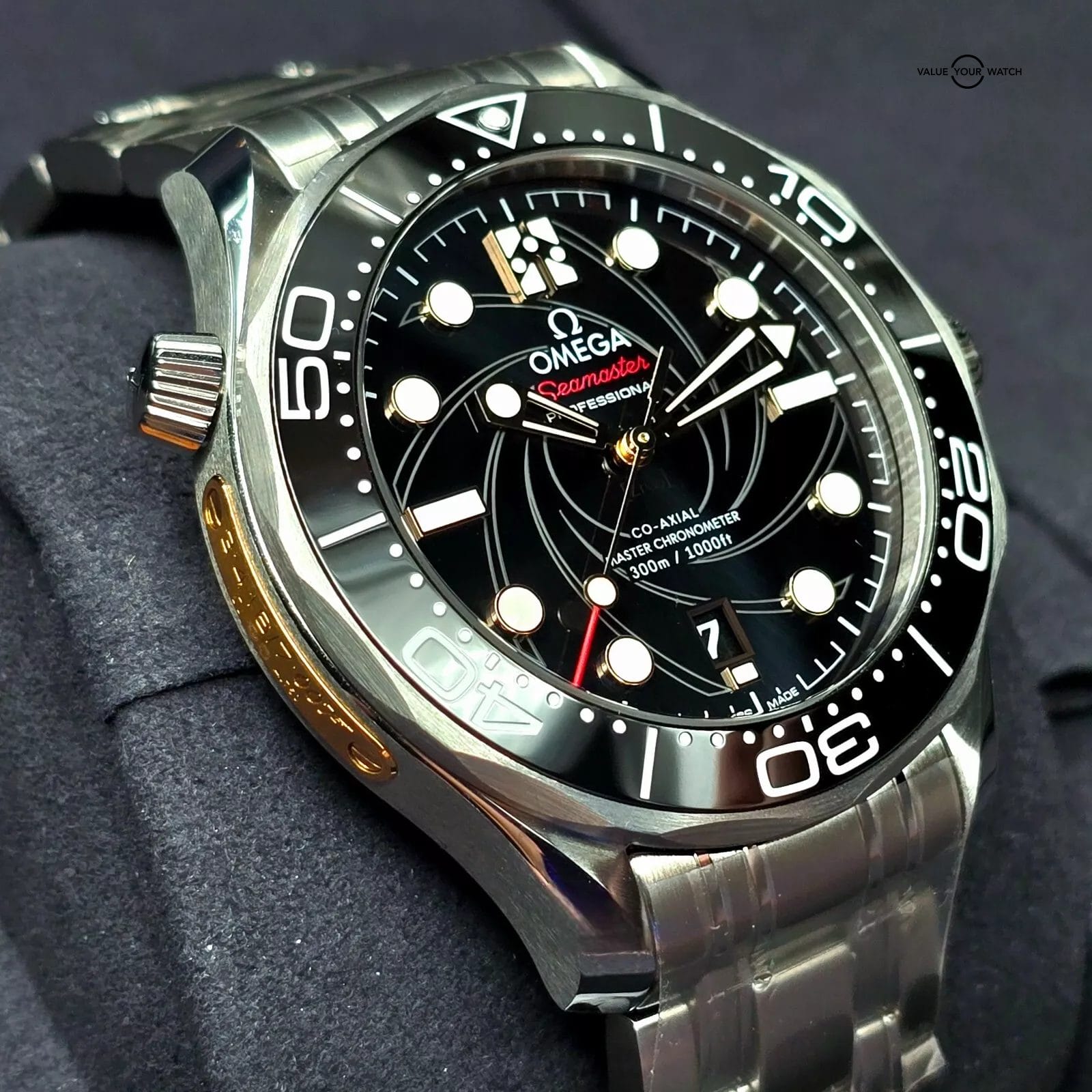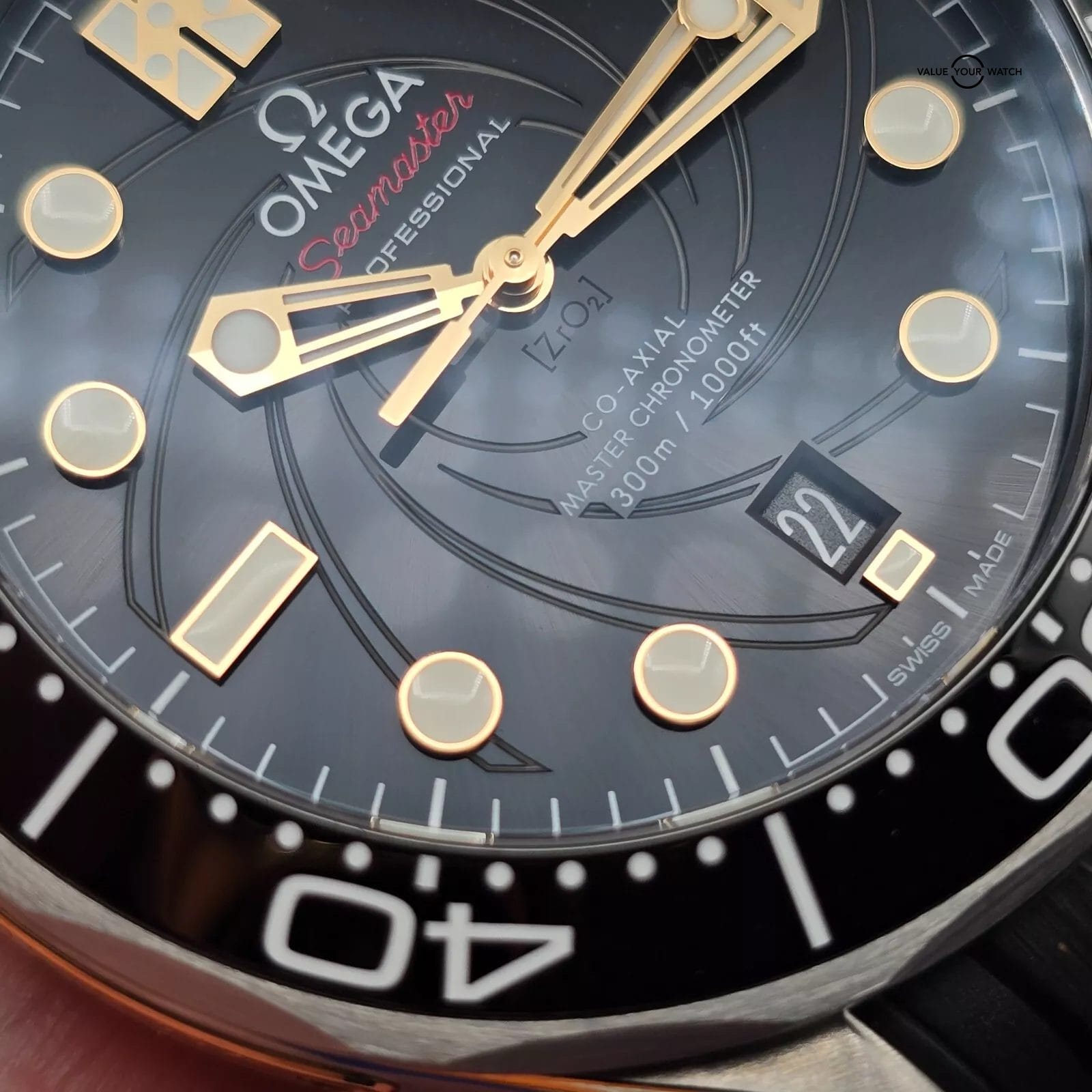 Up for sale here is my favorite of the James Bond Omega’s. There are a lot of 007 watches, but this one with the barrel rifling on the dial is a very cool addition to the lineup. Ref. 210.22.42.20.01.004