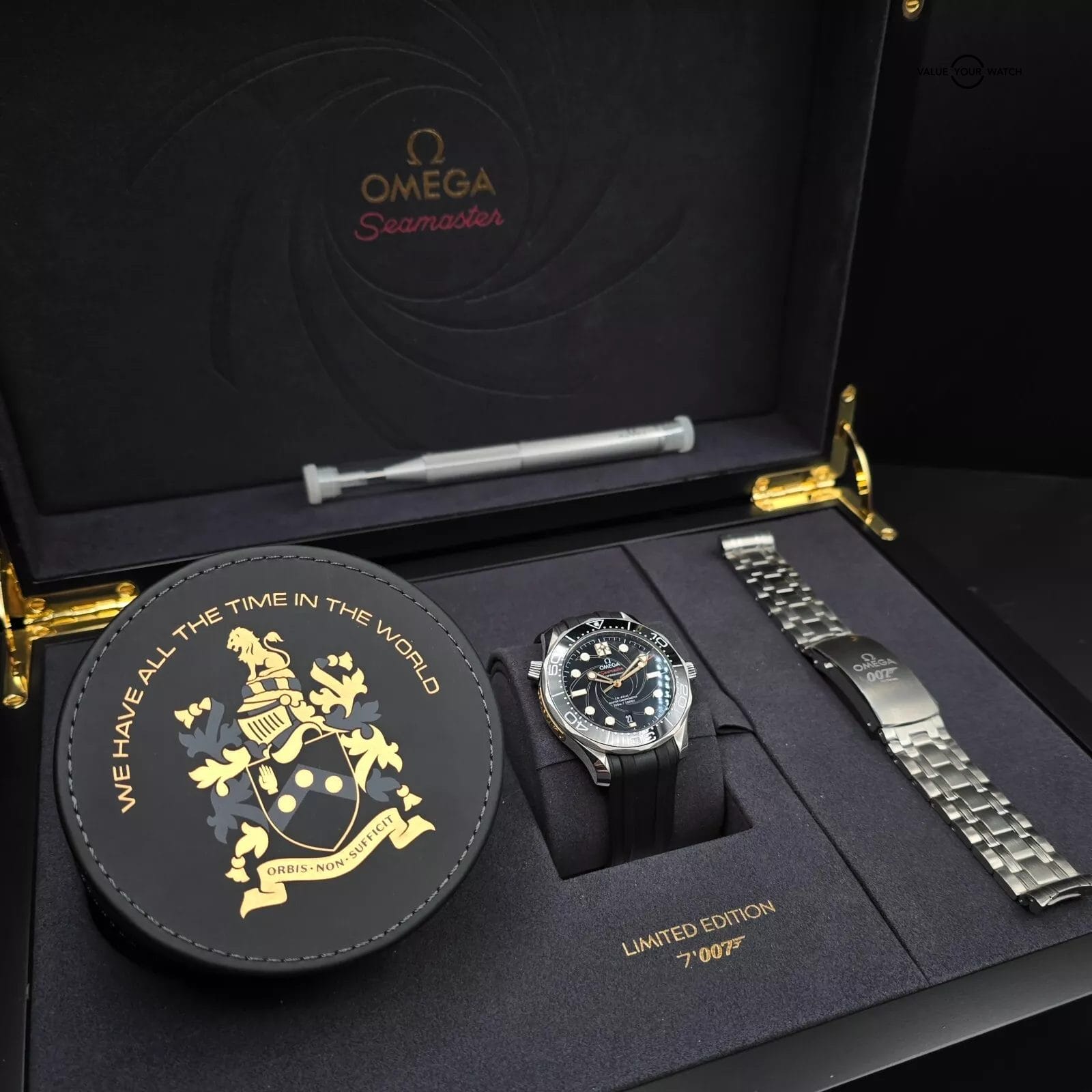 Comes as the full collector’s set in the big box with all 3 cards, both bracelets, an Omega spring bar tool, and a travel carrier with the bittersweet phrase “We Have All the Time in the World.”
