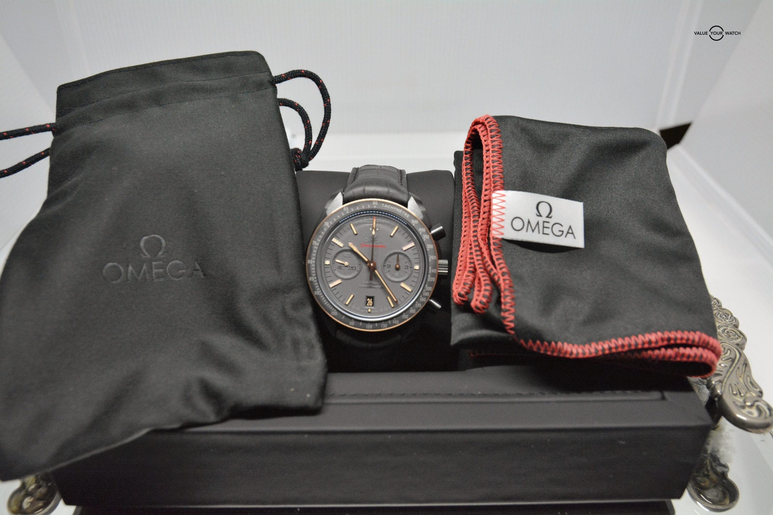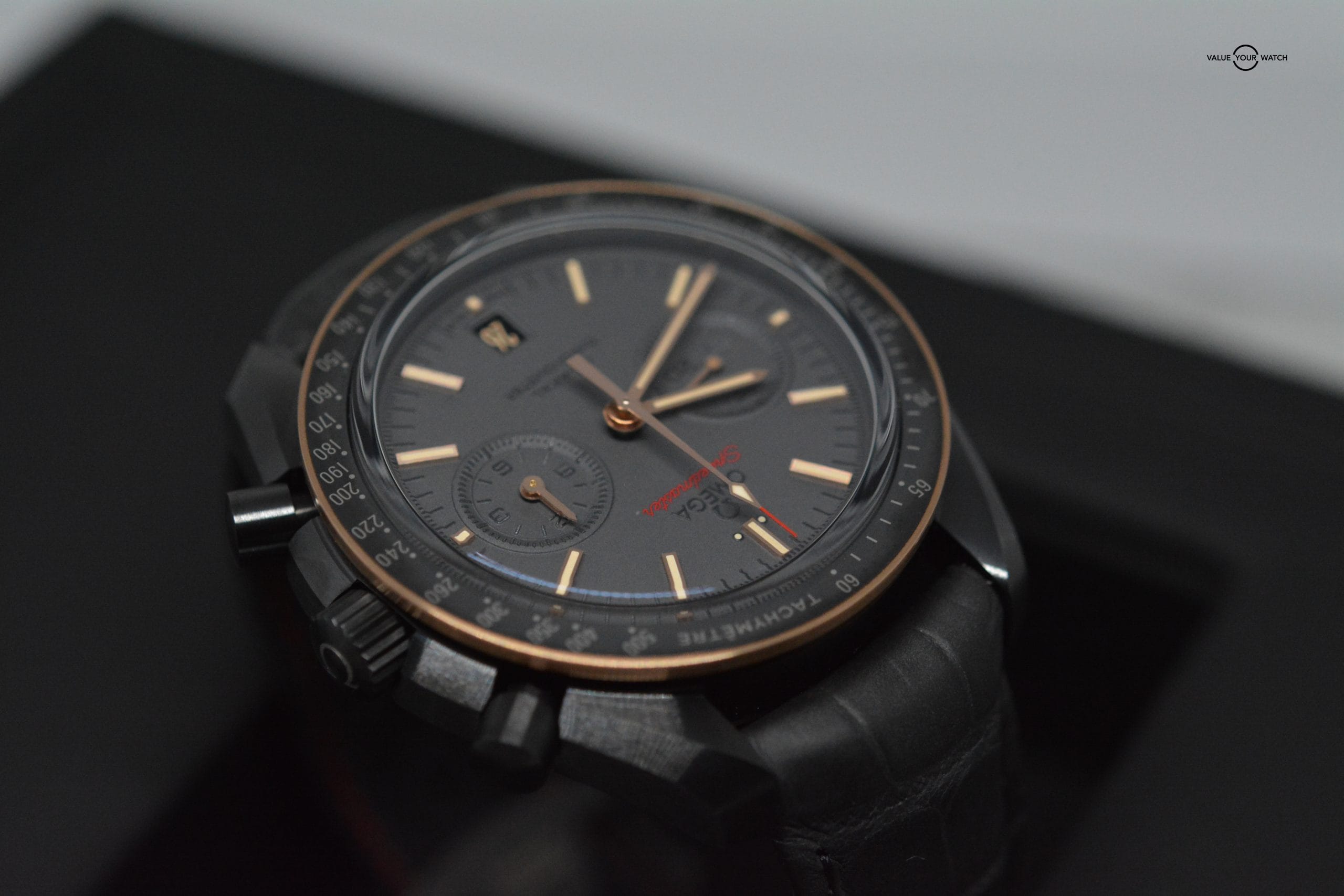 You are viewing a timeless timepiece that needs no introduction. The Omega Speedmaster “Dark Side of the Moon” (Sedna Gold)!!!