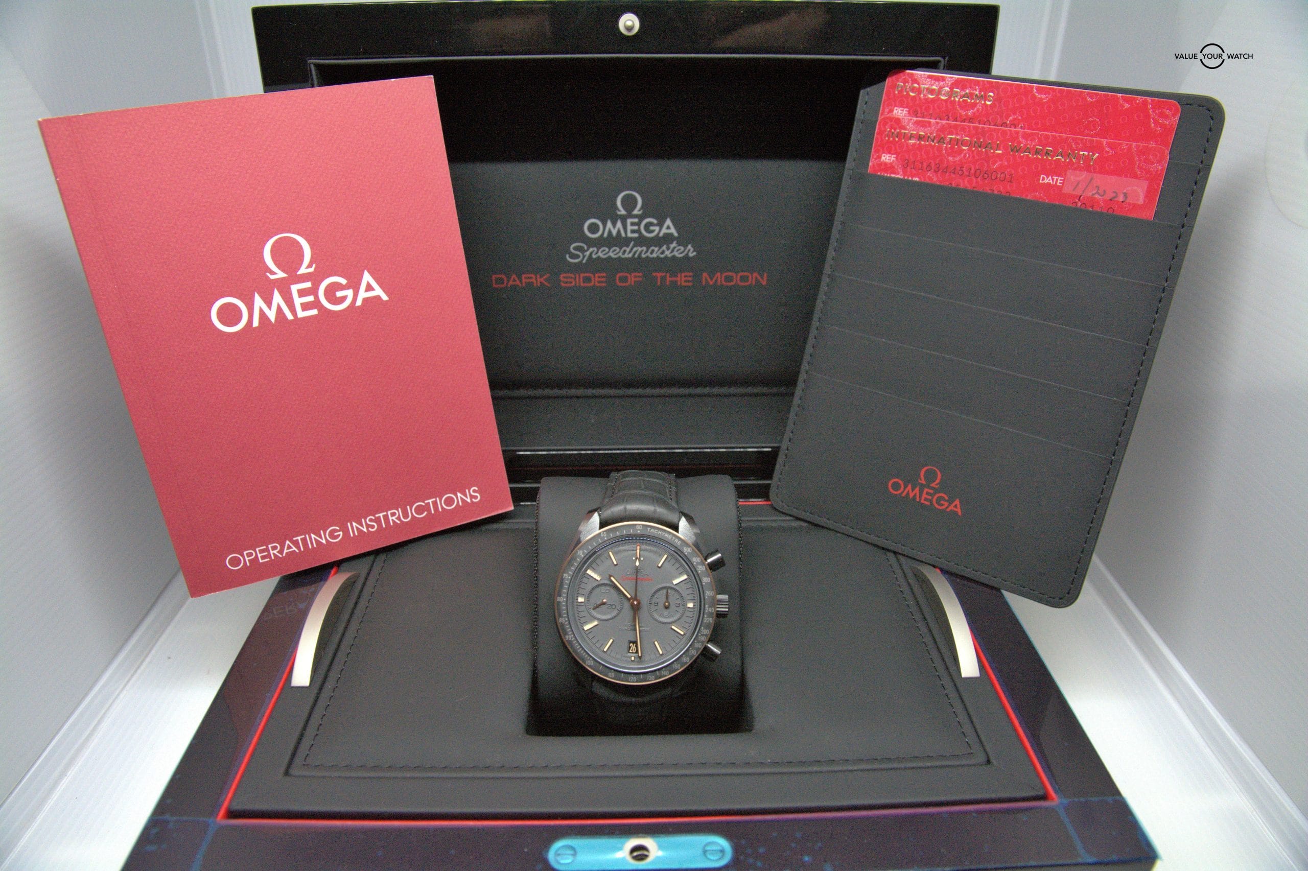 Full Kit: Original Omega Dark Side of The Moon presentation watchbox, papers, and an international warranty card dated 2023.
