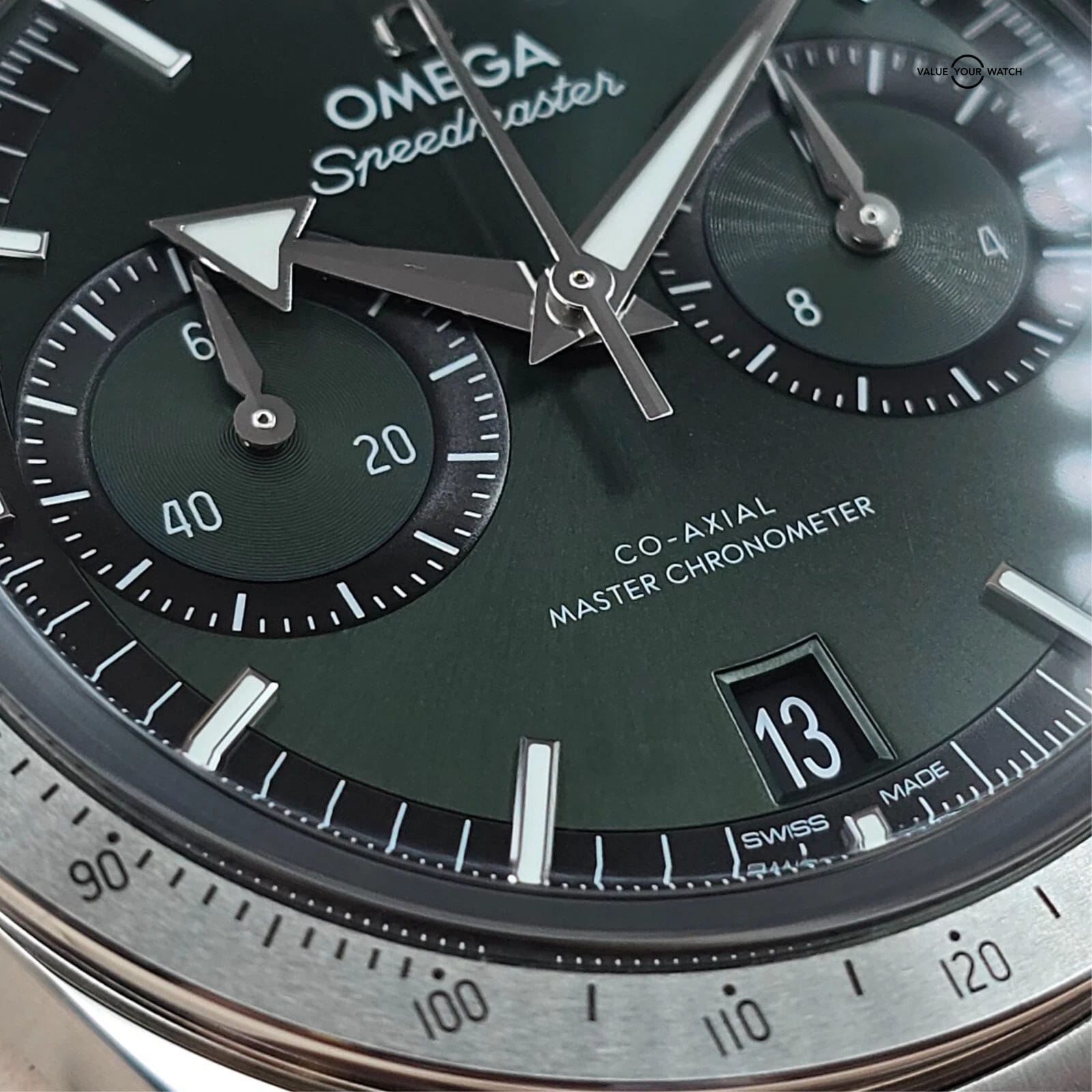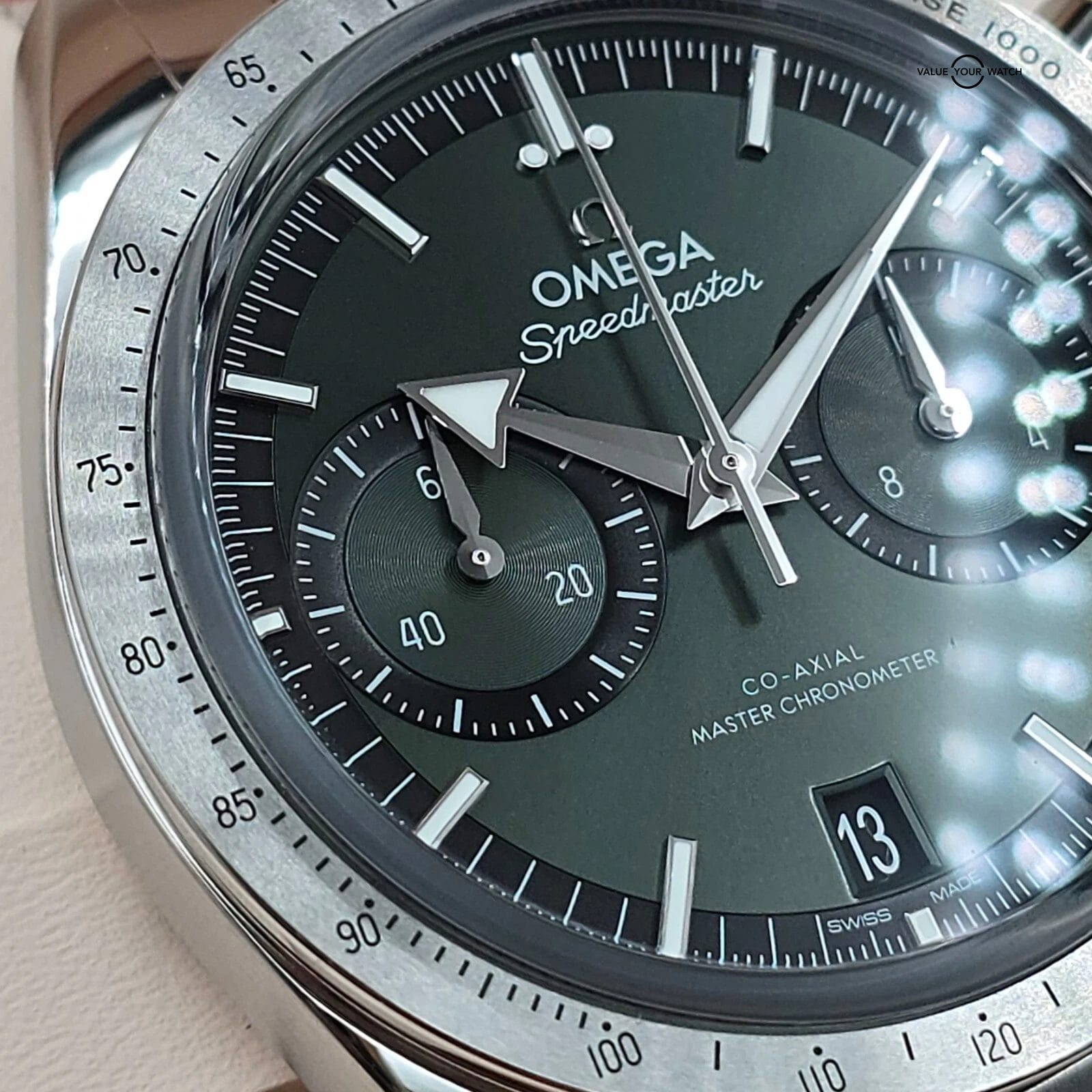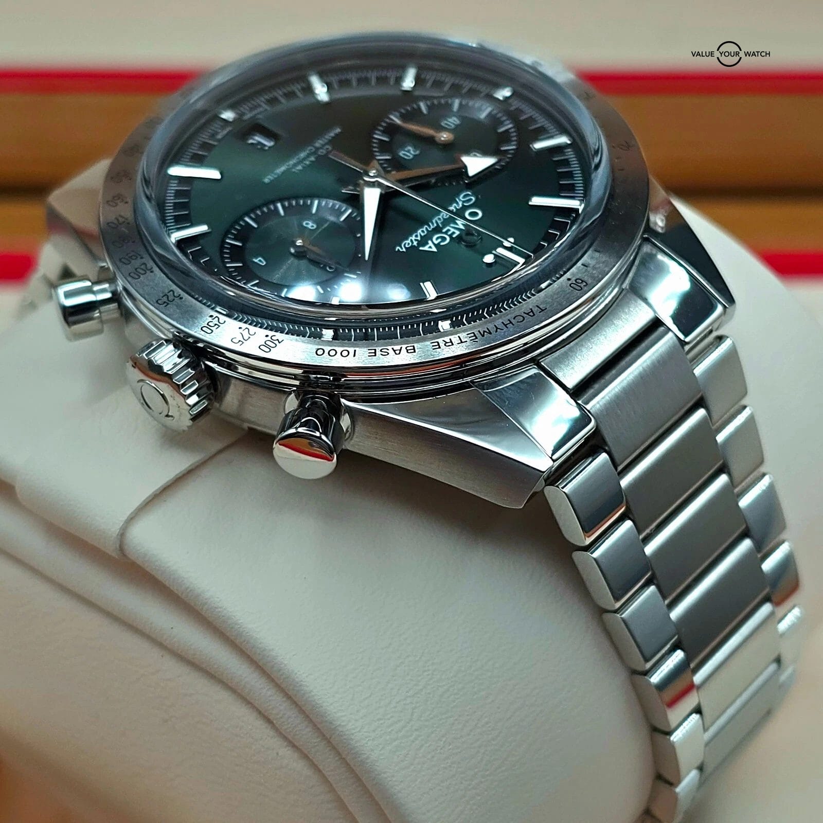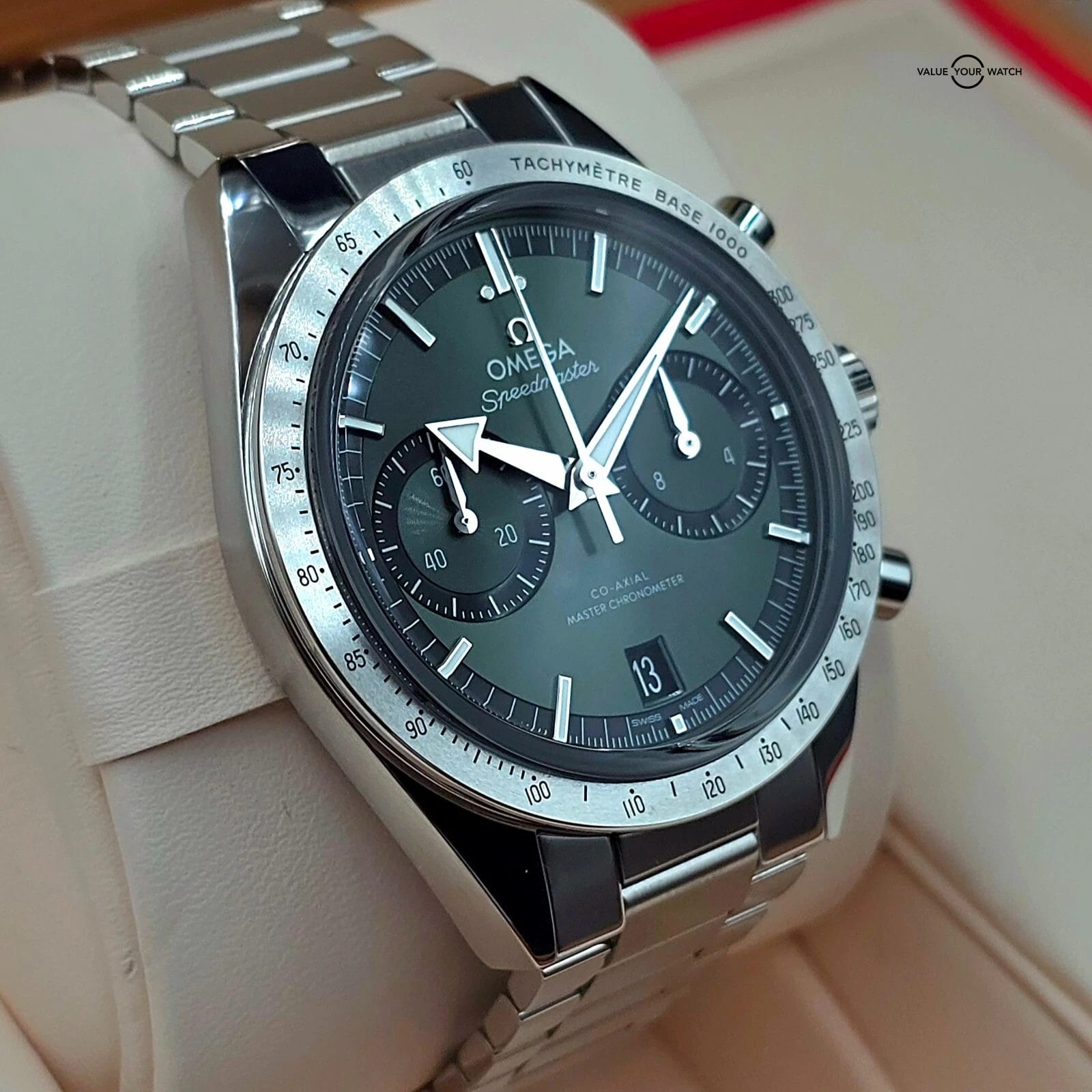 Up for sale here is a very nice example of the Omega Speedmaster ‘57, cased in 40.5mm of stainless steel and sporting a fantastic green dial.