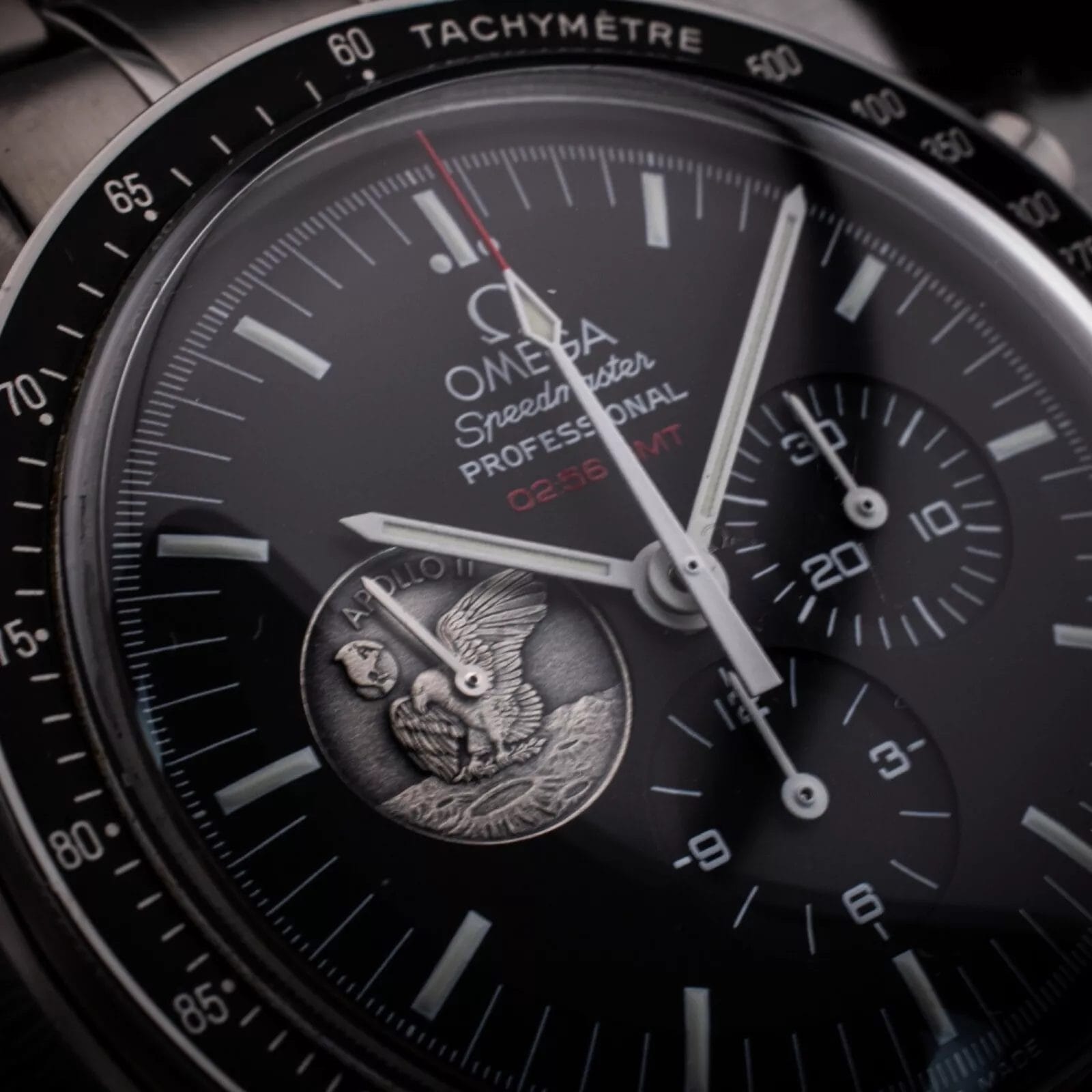 Dial: Black dial featuring a unique 02:56 GMT engraving in red, marking the exact time of the moon landing, complemented by small seconds sub-dial, 30-minute recorder, and 12-hour recorder along with a central chronograph hand.