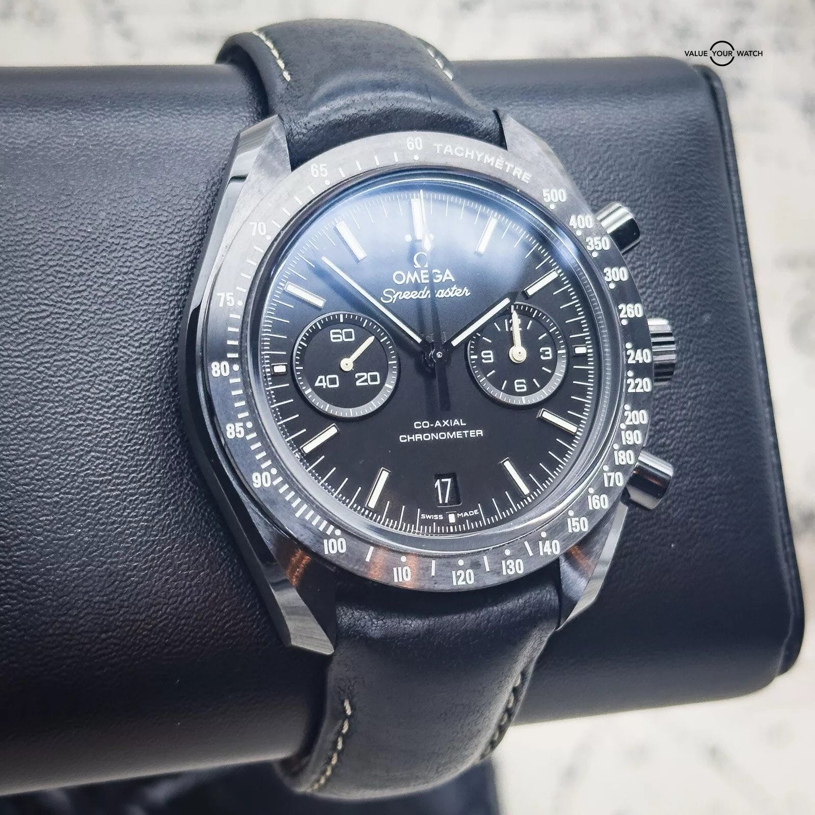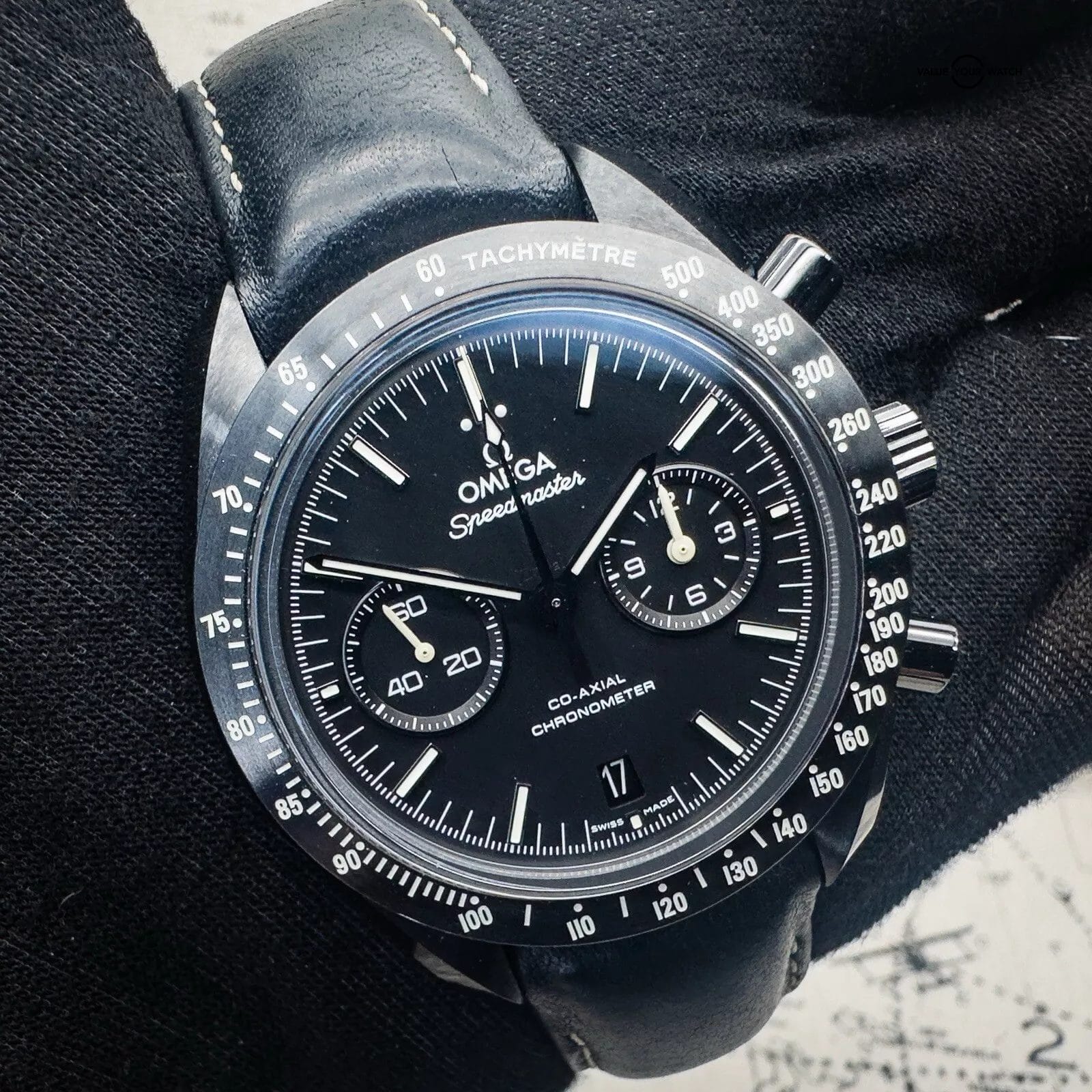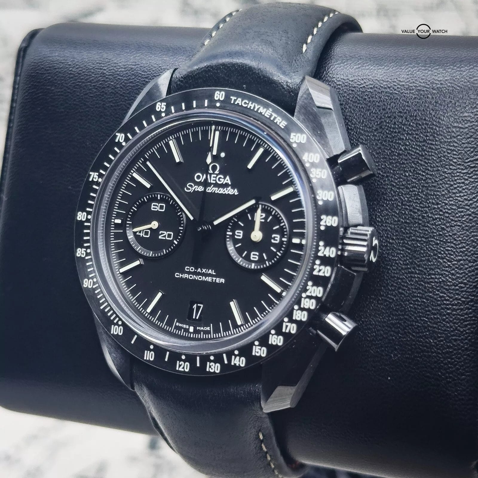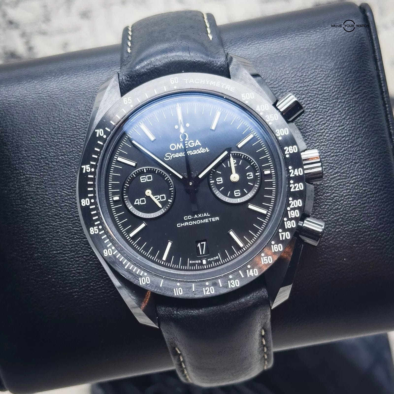 For sale is my Omega Dark Side of the Moon Pitch Black edition, a Complete Set with papers dated 12/2019. The DSOTM is a self-winding automatic watch featuring a 44mm polished and brushed black ceramic case, surrounding a black dial, fitted to a leather strap, with a ceramic/ titanium deployant buckle. The white hands, markers, and tachymeter scale are filled with Super-LumiNova to ensure clear visibility in the dark and the deep – water resistant up to 50 metres.