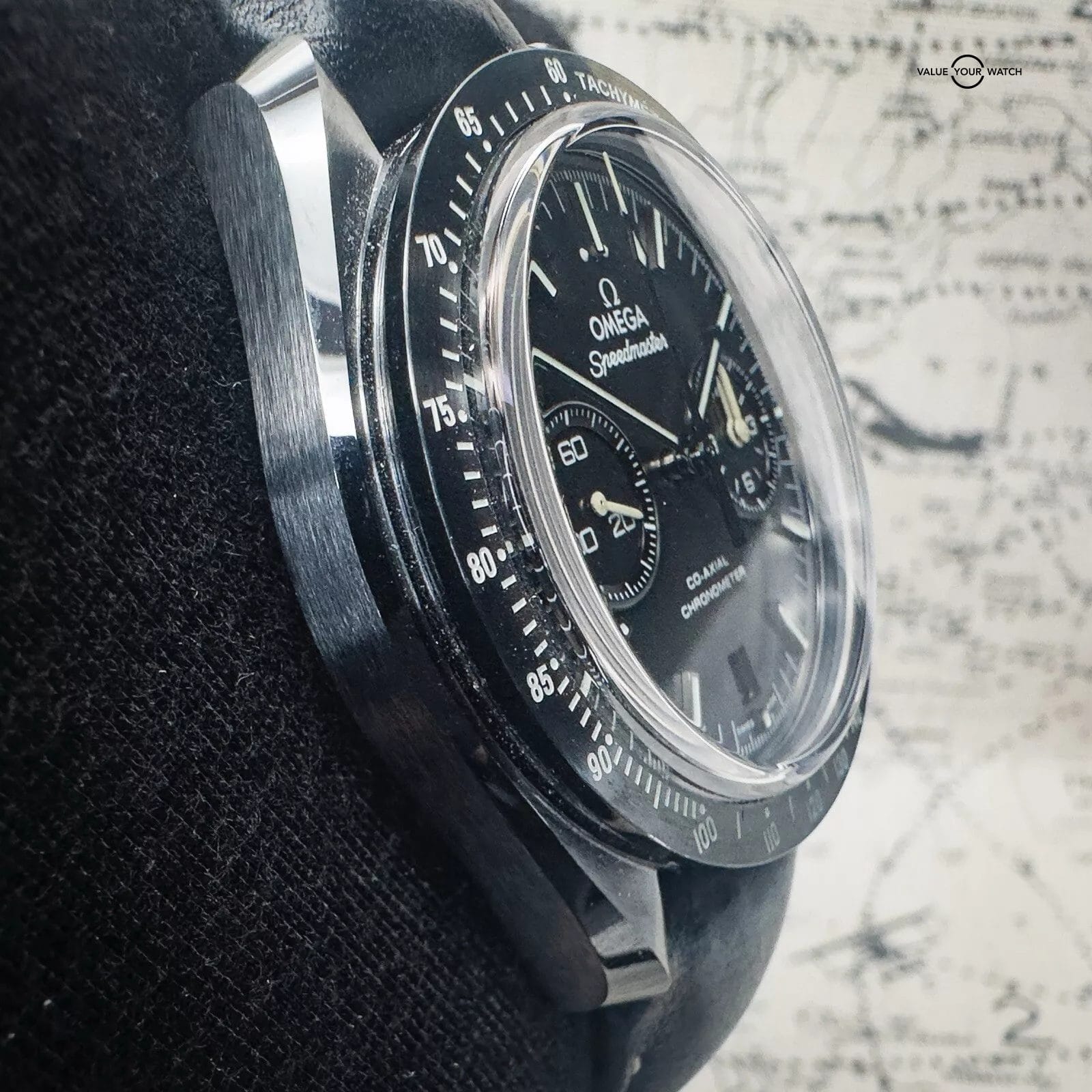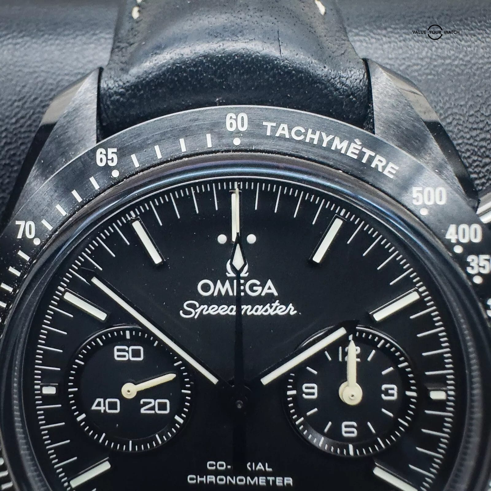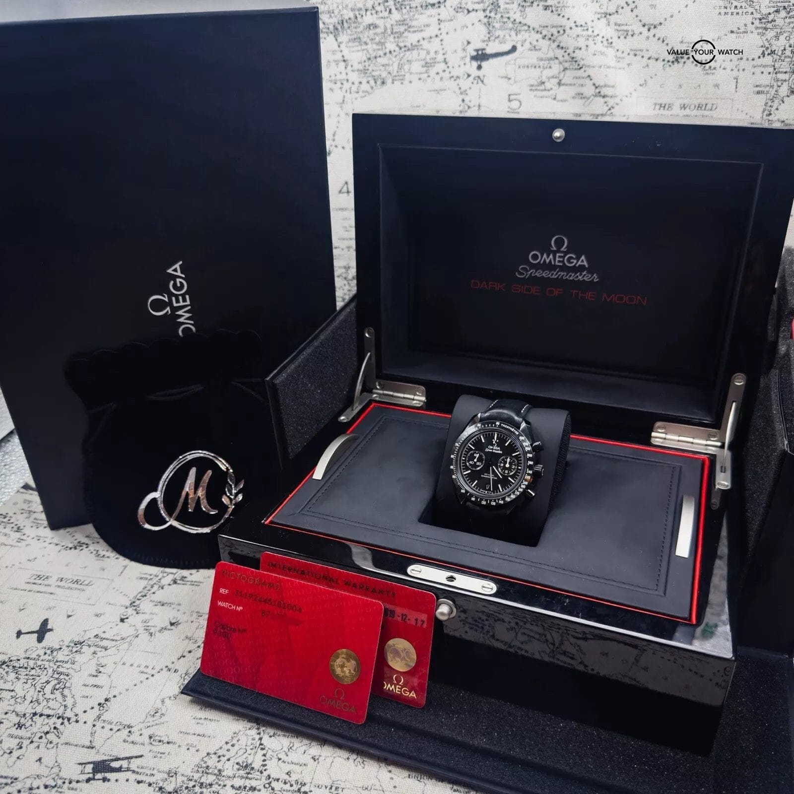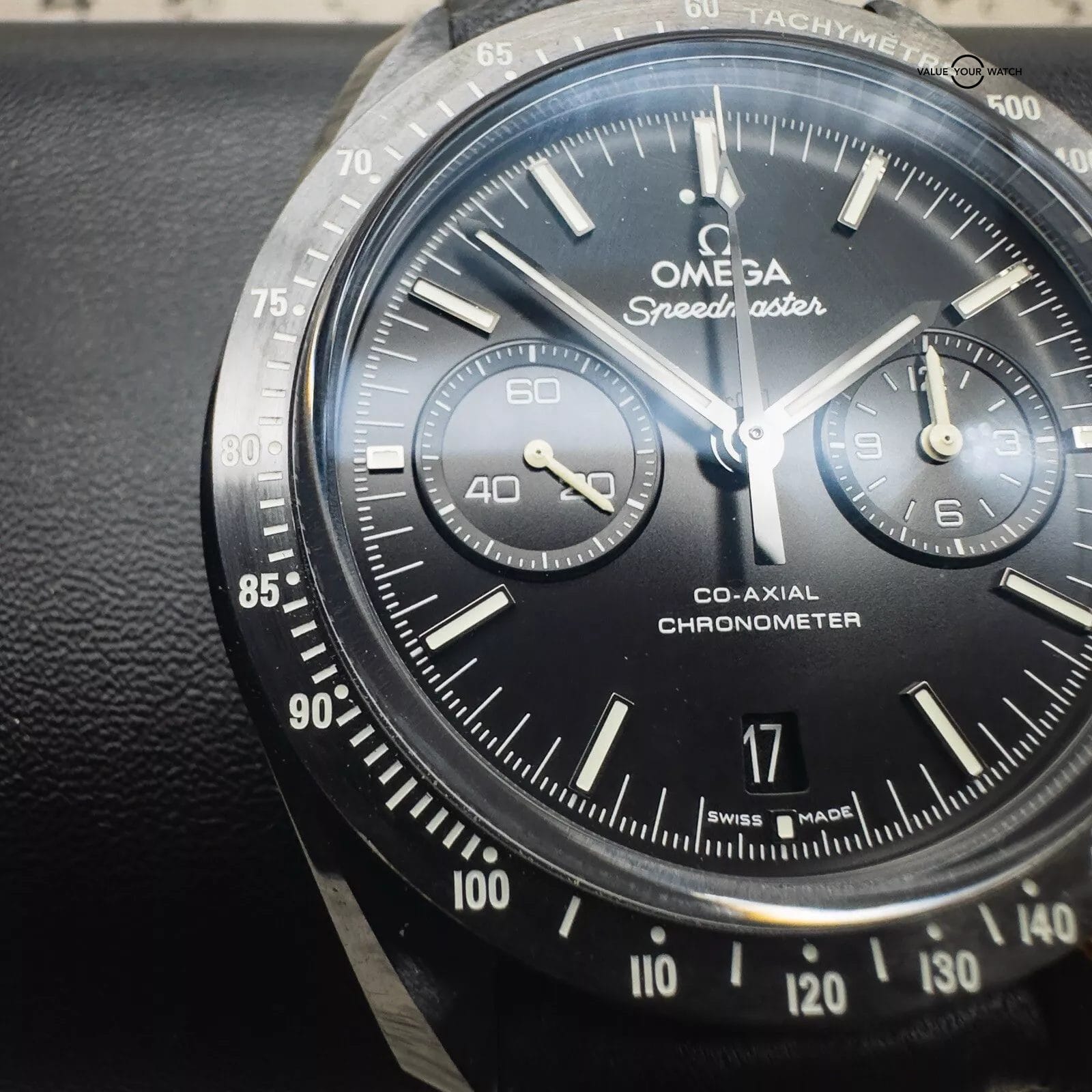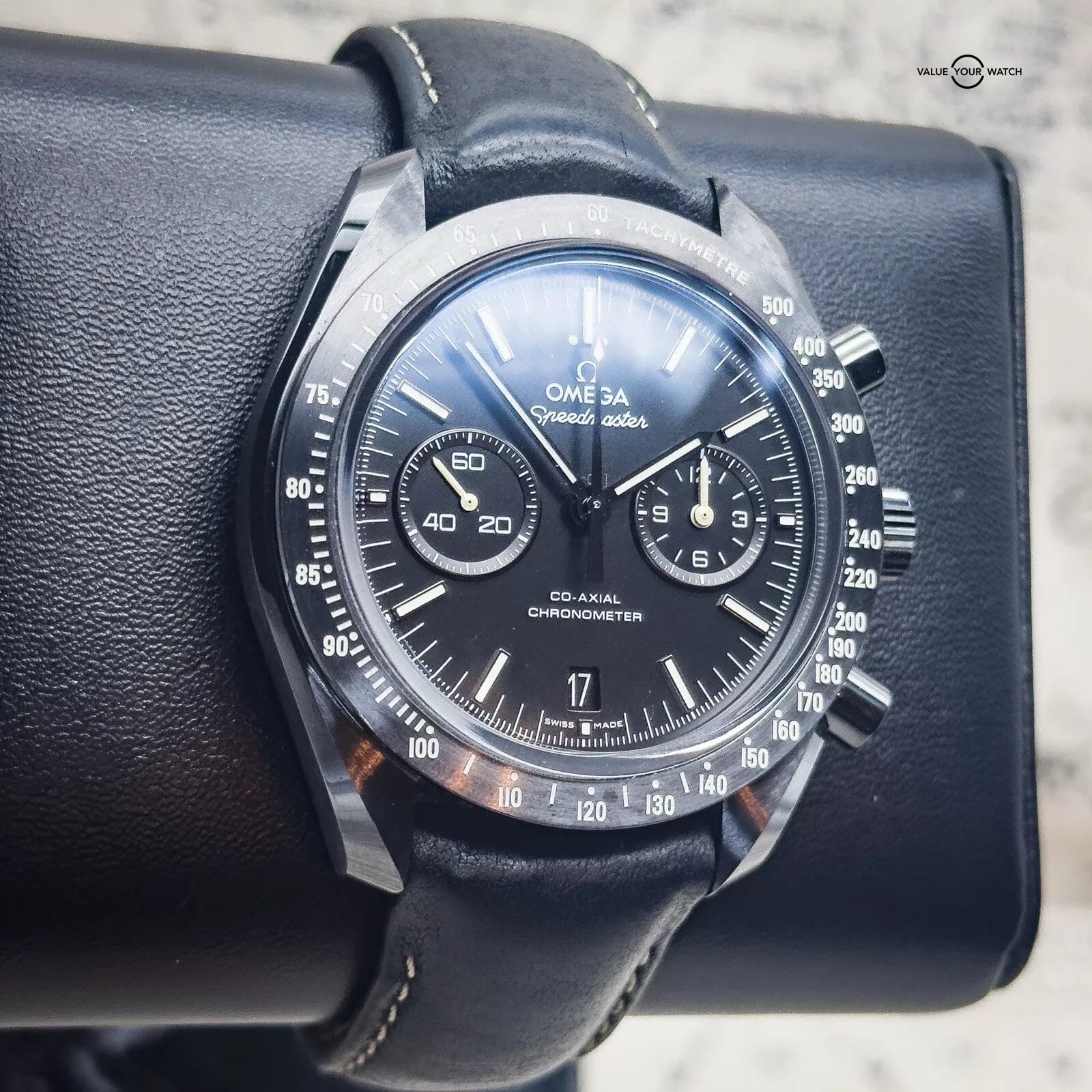 For sale is my Omega Dark Side of the Moon Pitch Black edition, a Complete Set with papers dated 12/2019. The DSOTM is a self-winding automatic watch featuring a 44mm polished and brushed black ceramic case, surrounding a black dial, fitted to a leather strap, with a ceramic/ titanium deployant buckle. The white hands, markers, and tachymeter scale are filled with Super-LumiNova to ensure clear visibility in the dark and the deep – water resistant up to 50 metres.