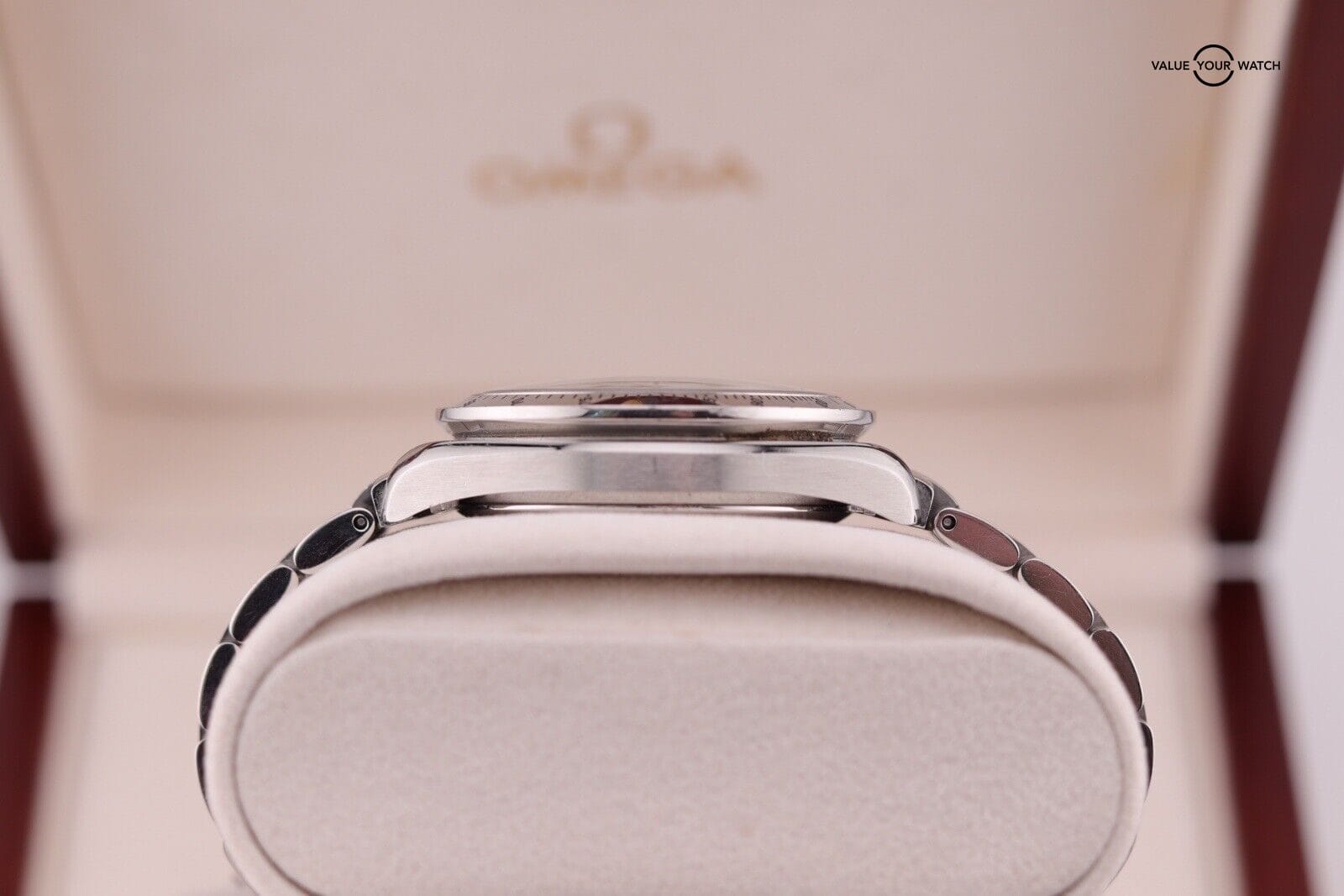 Dial has signs of water damage, but watch was completely serviced since and runs great! SS throughout watch is in your usual preowned condition with a handful of smaller dings and scratches.