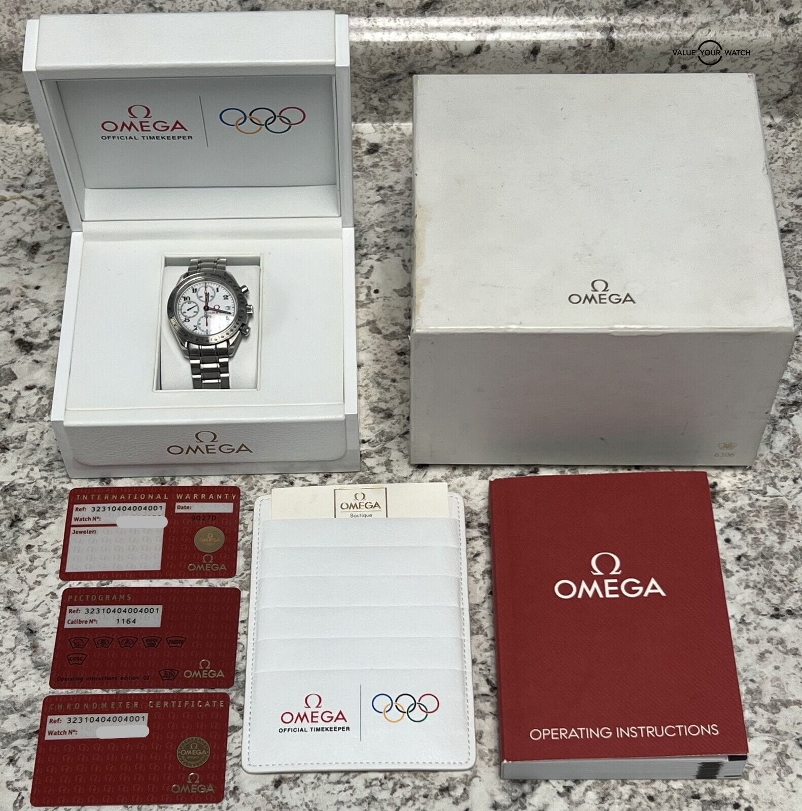 This timepiece comes with the outer white box, inner white Olympic box, instruction manual, all 3 cards (pictogram, chronometer, and warranty card). The warranty card was not stamped or dated at time of purchase. If you are reading this AD, you know the rarity and exclusivity of this model. The watch is in nice pre-owned condition. The watch will accommodate up to a 7.5” wrist. Do not miss your chance to own this illustrious timepiece! This piece was commissioned for Omega’s partnership with the Olympic games. Mechanically the watch is functioning well. Serial numbers & names are blurred in photos only for privacy reasons.