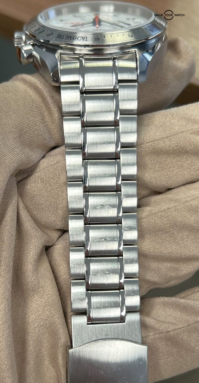 The watch features a 40mm stainless steel case with a polished finish, lending it a classic and sophisticated look. The white dial is adorned with contrasting black hour markers and hands, providing excellent legibility. The fixed black aluminum bezel features a tachymeter scale, allowing for precise timing measurements.