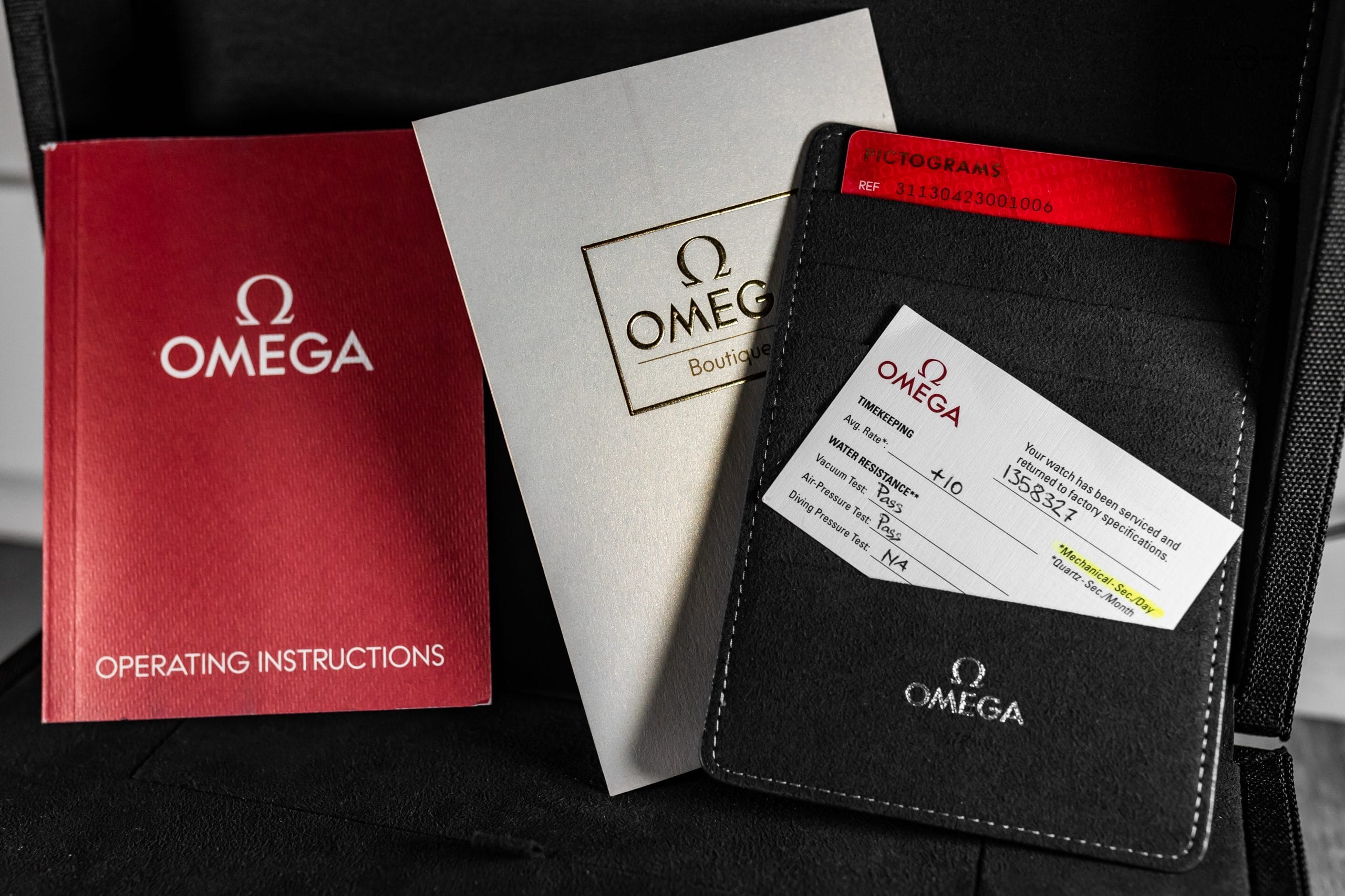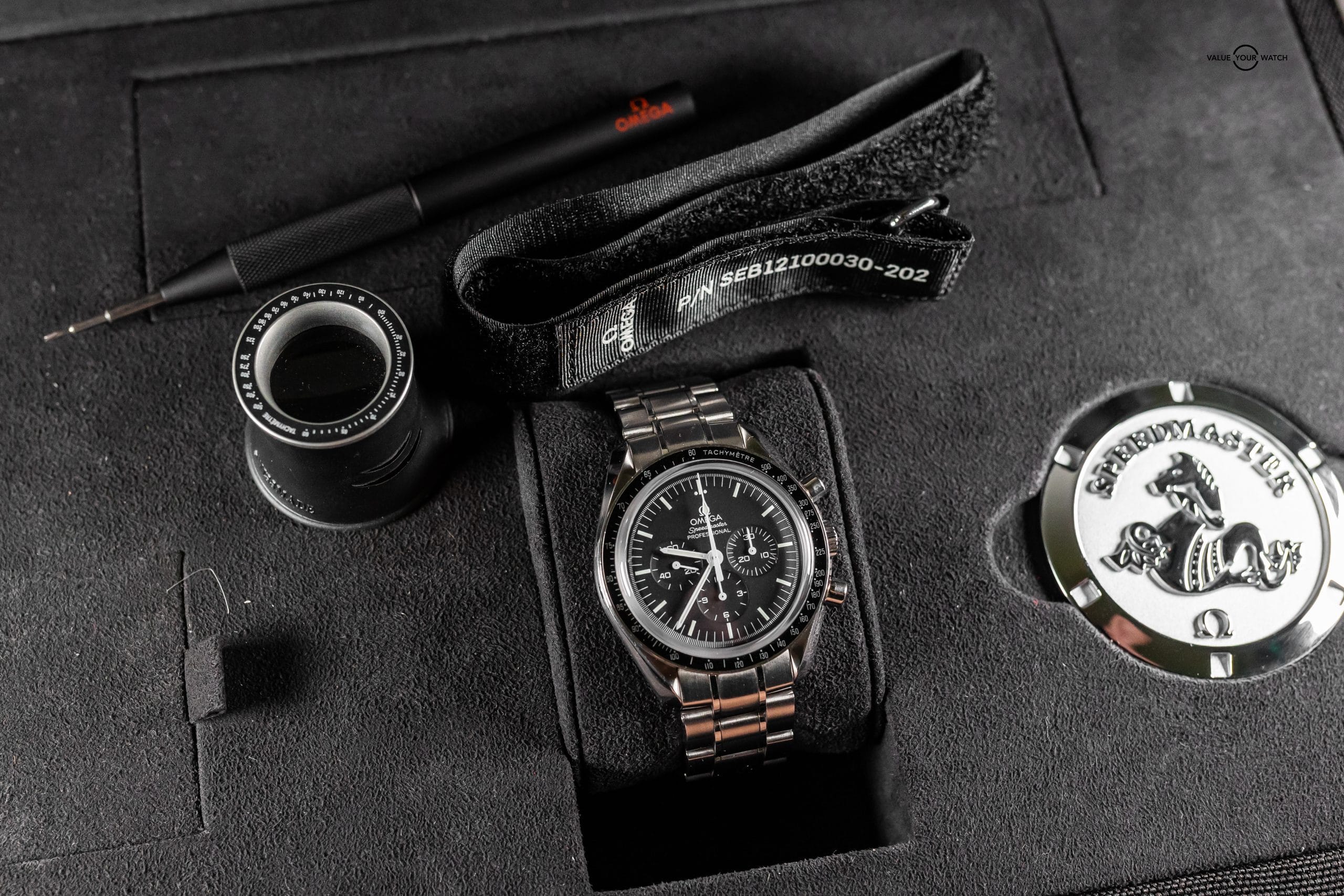 The watch will come double big box, the collector’s edition, with paper weight, jewelers loupe, NATO Omega Strap, Omega watch tool, receipt of purchase, pictogram, manual and most recent service card from 2019.
