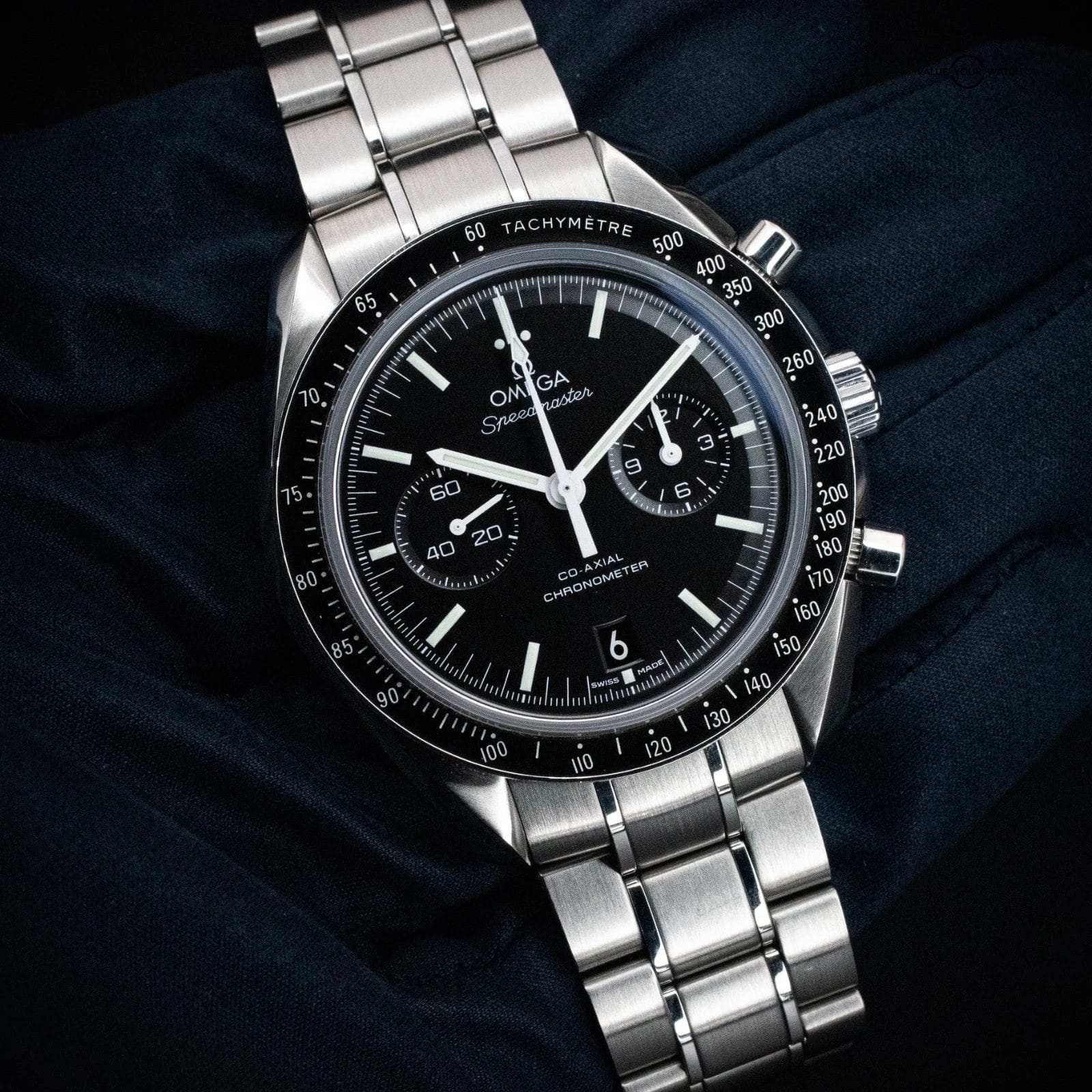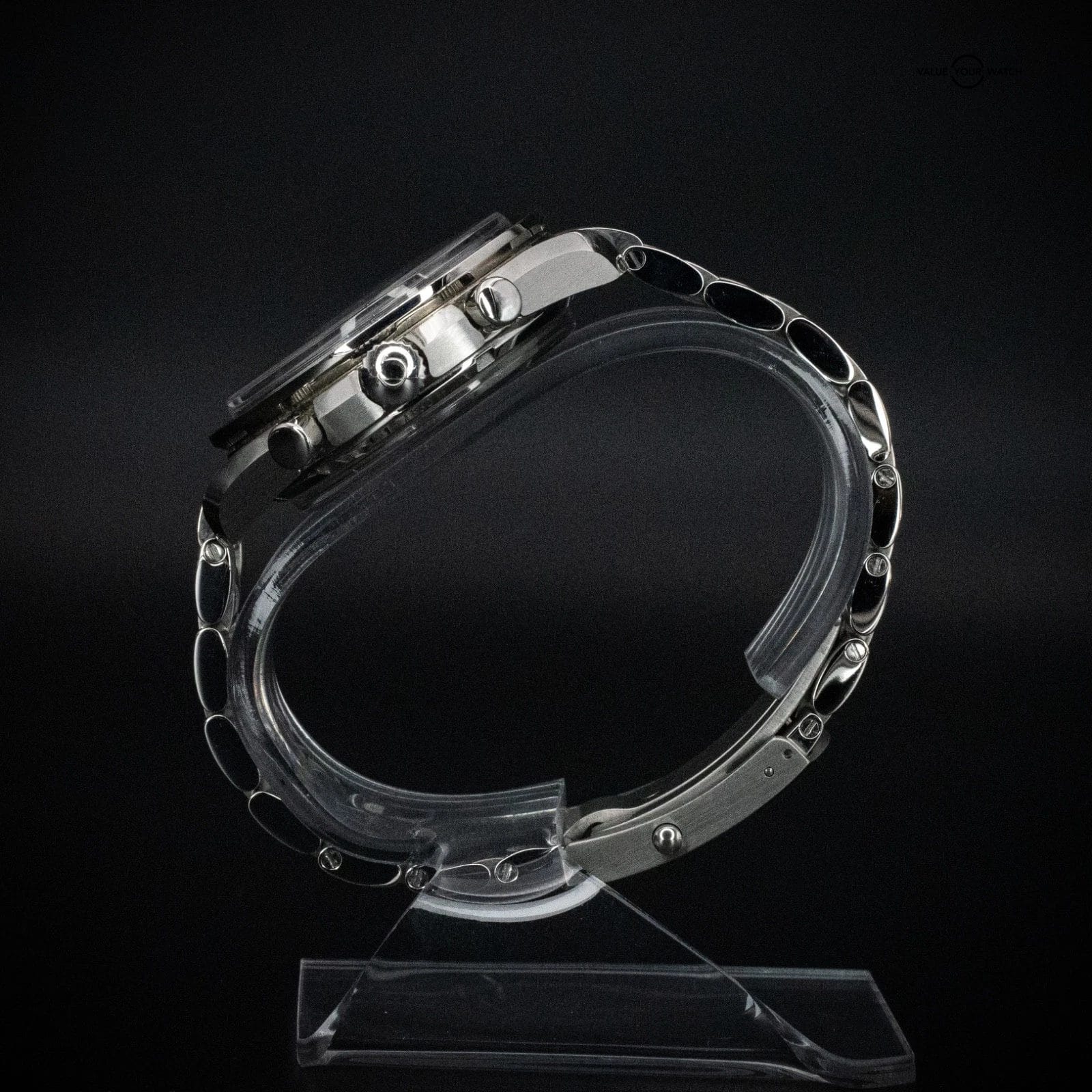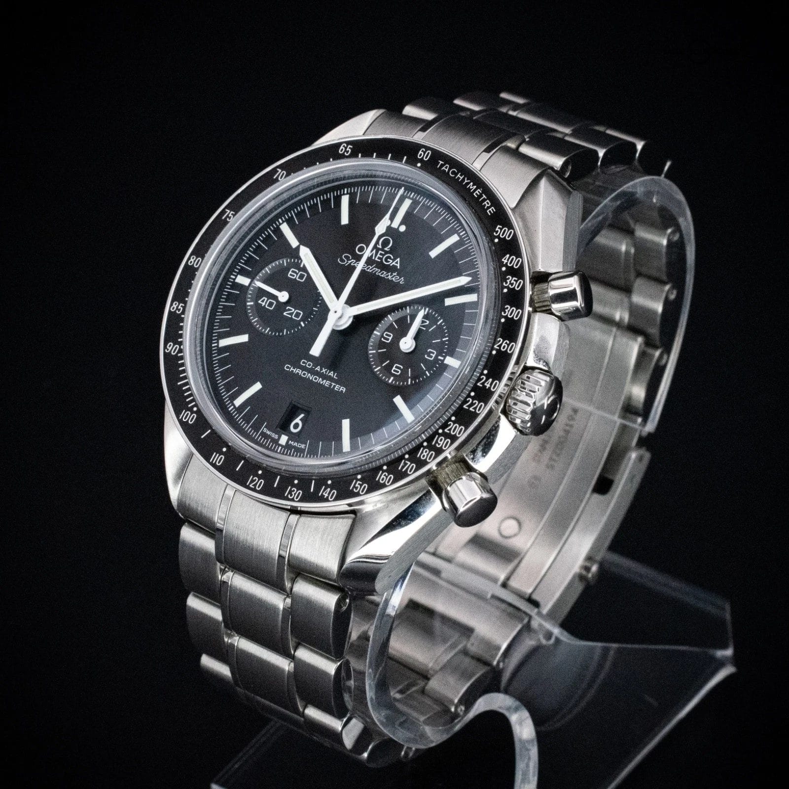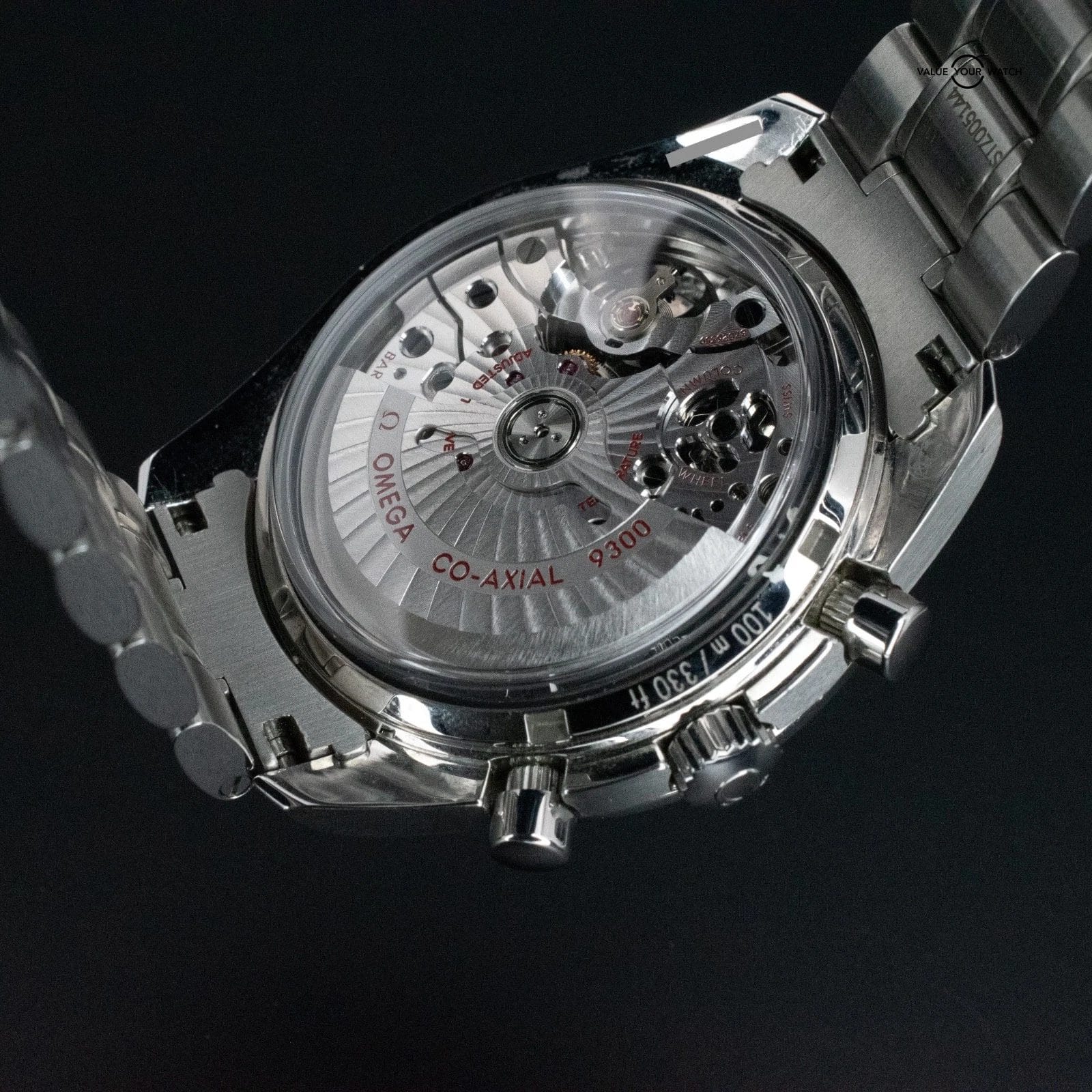 The Speedmaster Two Counters is recognized for its clean two-register layout and use of the Omega Caliber 9300, a column wheel chronograph with Co-Axial escapement developed entirely in-house. The larger 44.25mm case provides strong wrist presence while maintaining legibility and balance. This reference is well regarded for its robust construction, modern movement architecture, and everyday wearability on the steel bracelet.