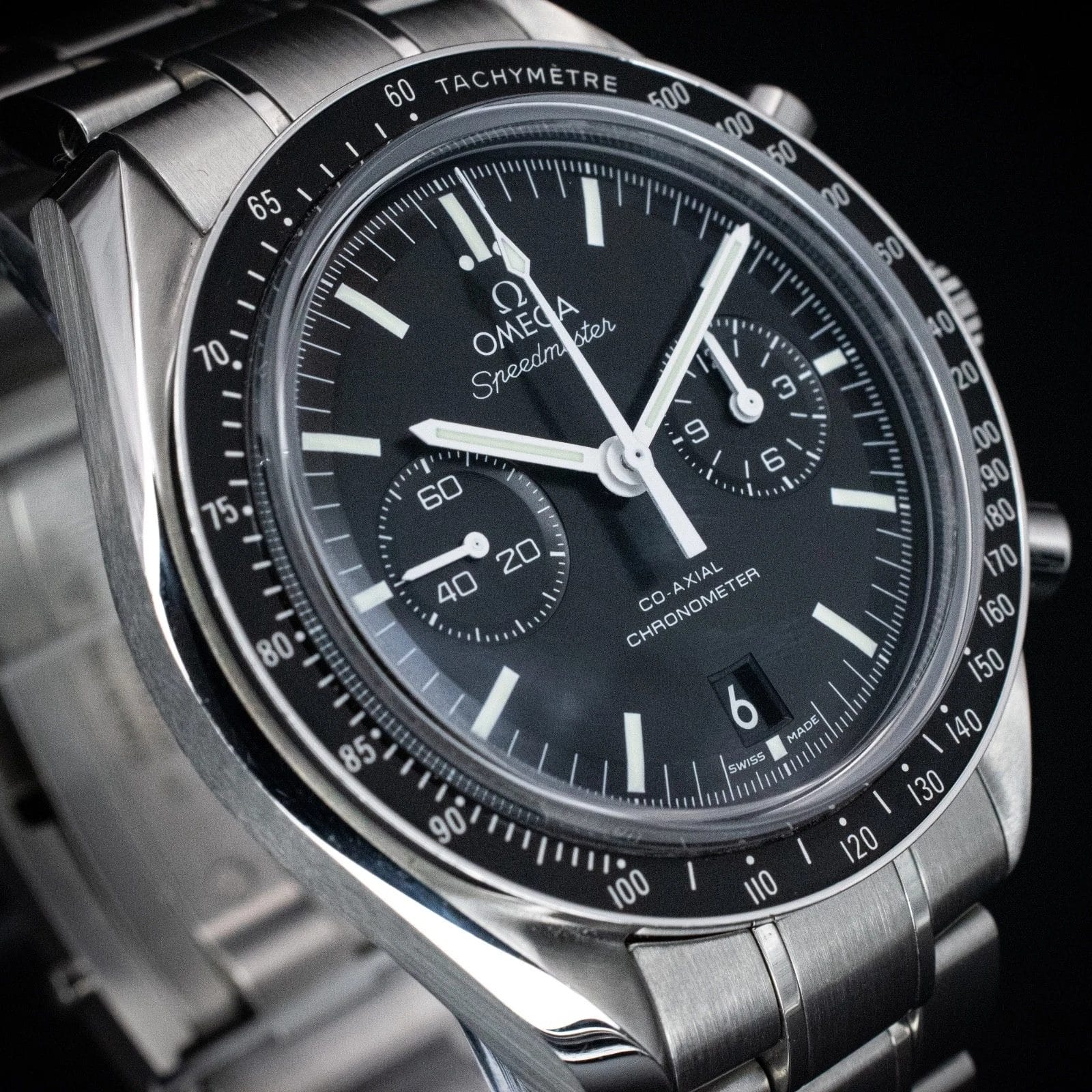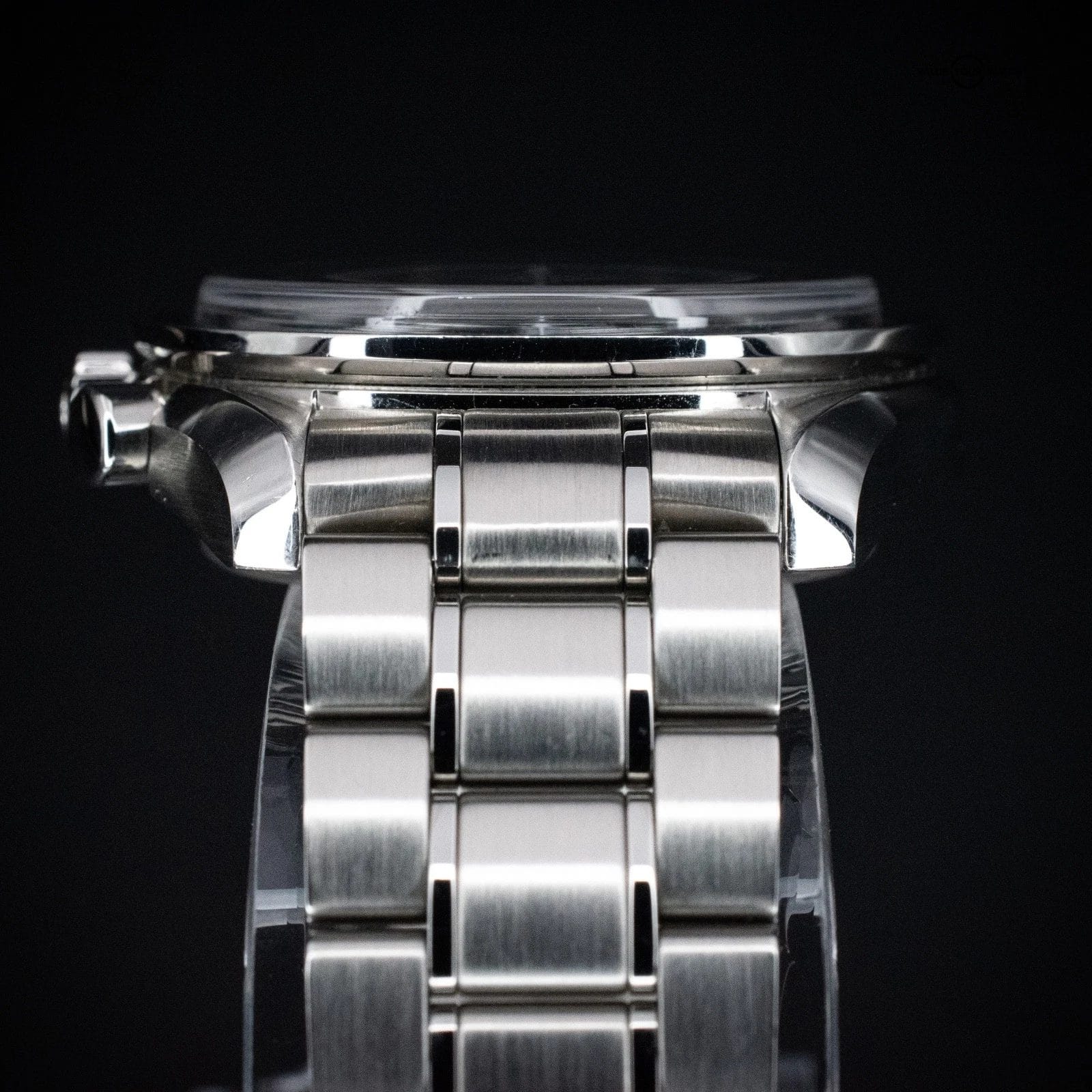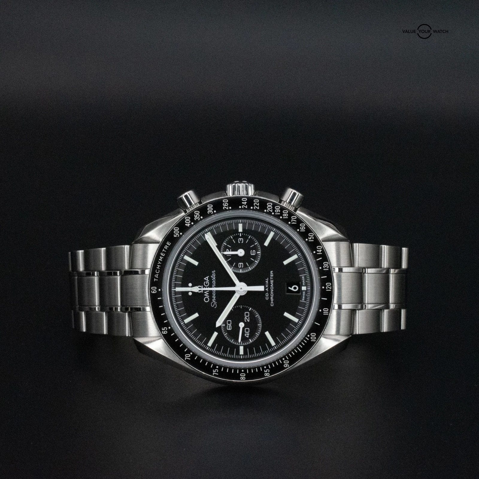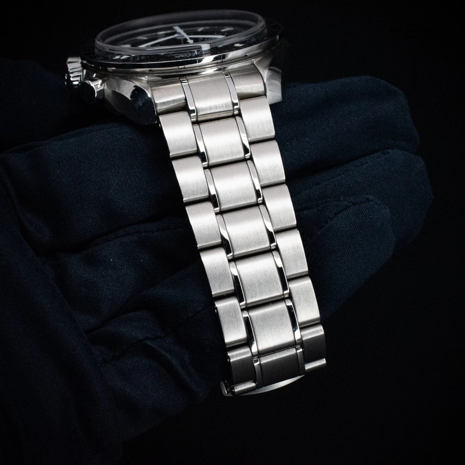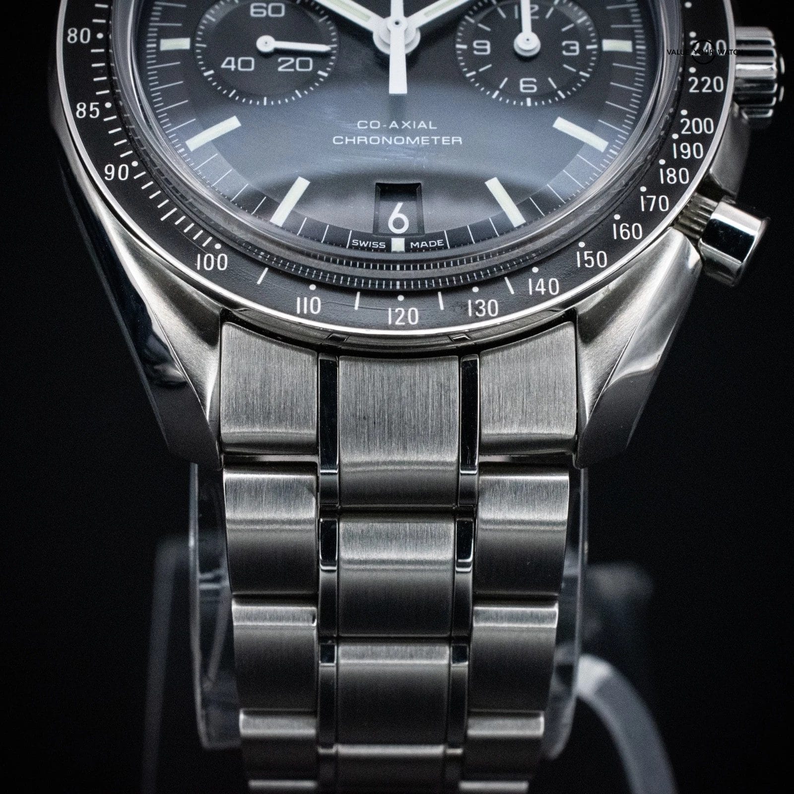 The Speedmaster Two Counters is recognized for its clean two-register layout and use of the Omega Caliber 9300, a column wheel chronograph with Co-Axial escapement developed entirely in-house. The larger 44.25mm case provides strong wrist presence while maintaining legibility and balance. This reference is well regarded for its robust construction, modern movement architecture, and everyday wearability on the steel bracelet.