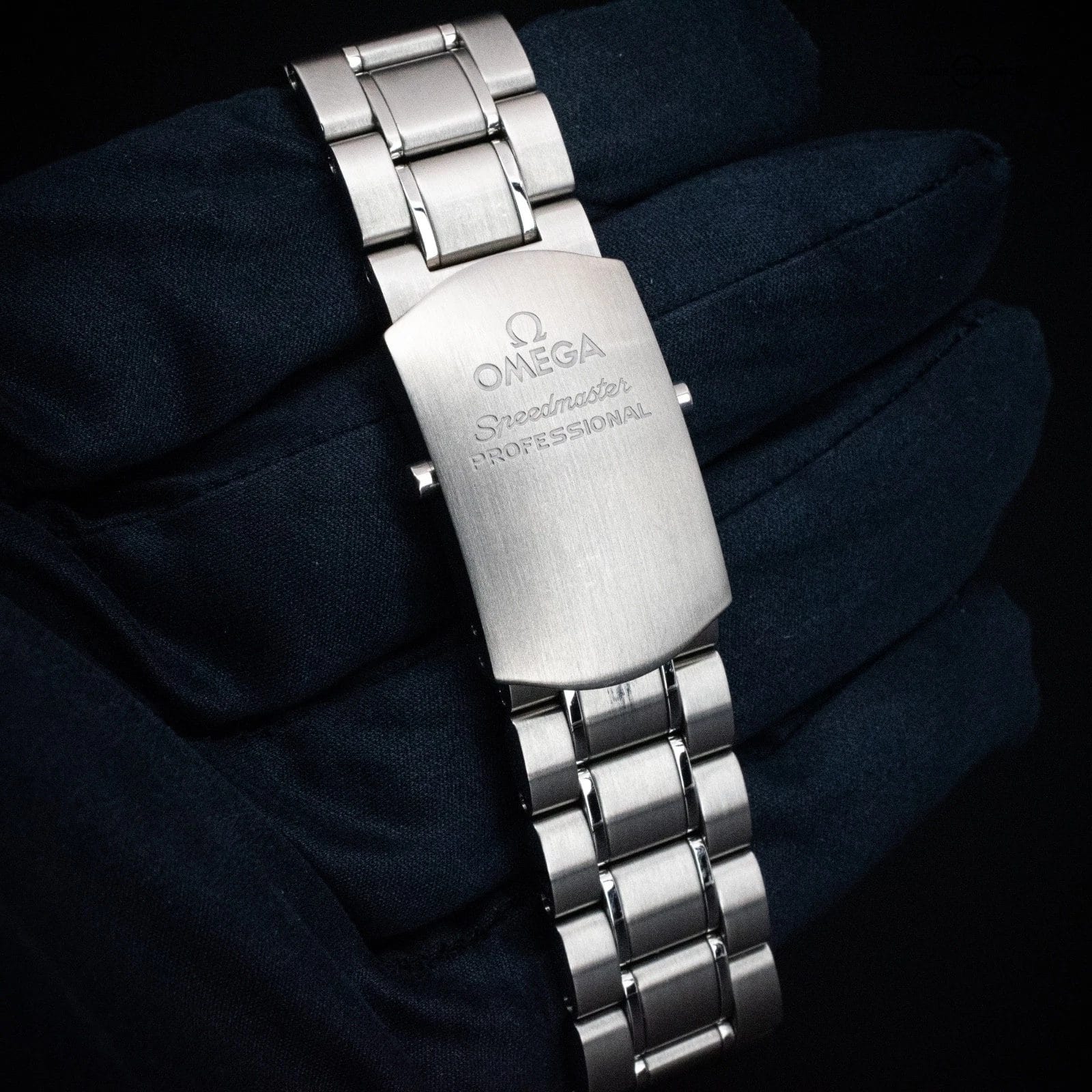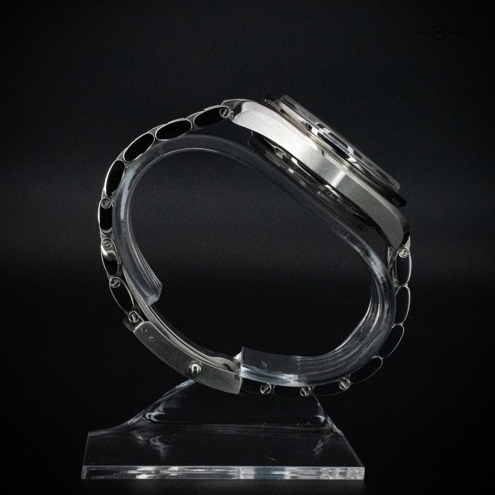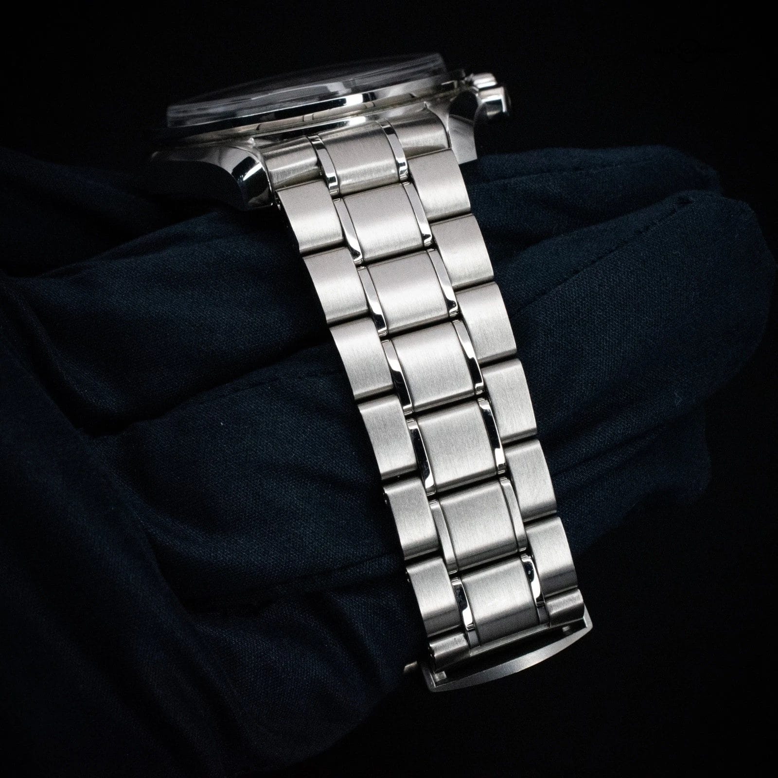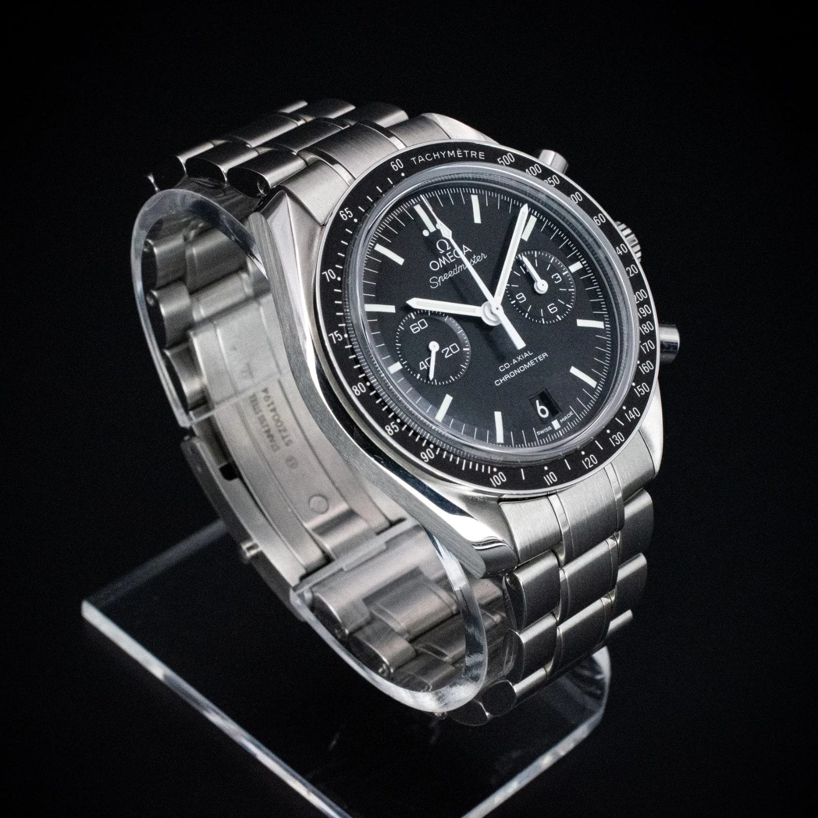 The Speedmaster Two Counters is recognized for its clean two-register layout and use of the Omega Caliber 9300, a column wheel chronograph with Co-Axial escapement developed entirely in-house. The larger 44.25mm case provides strong wrist presence while maintaining legibility and balance. This reference is well regarded for its robust construction, modern movement architecture, and everyday wearability on the steel bracelet.
