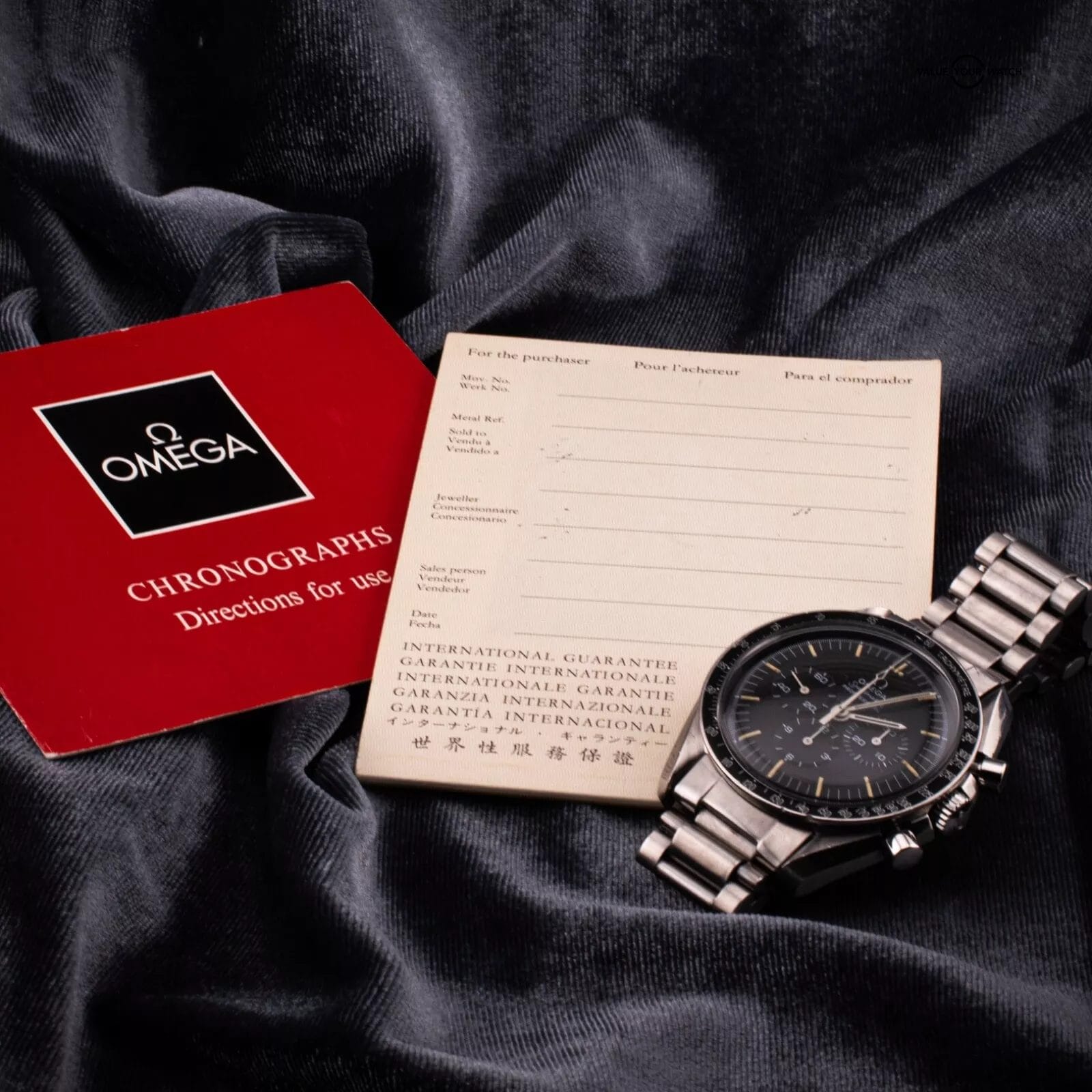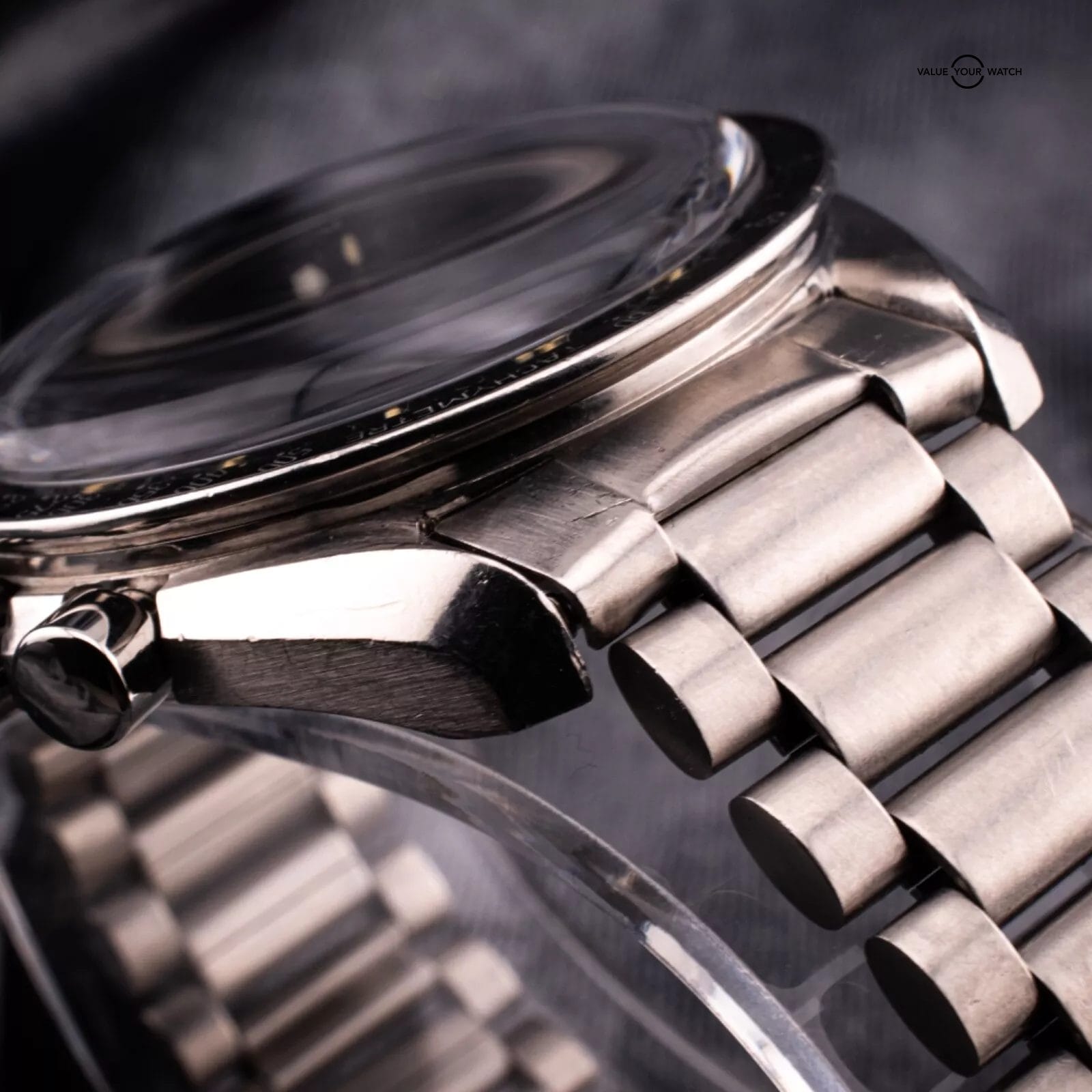 Caseback: Pre-moon engraving with the seahorse medallion, confirming its status as one of the last Speedmasters before the Moon landing caseback was introduced.