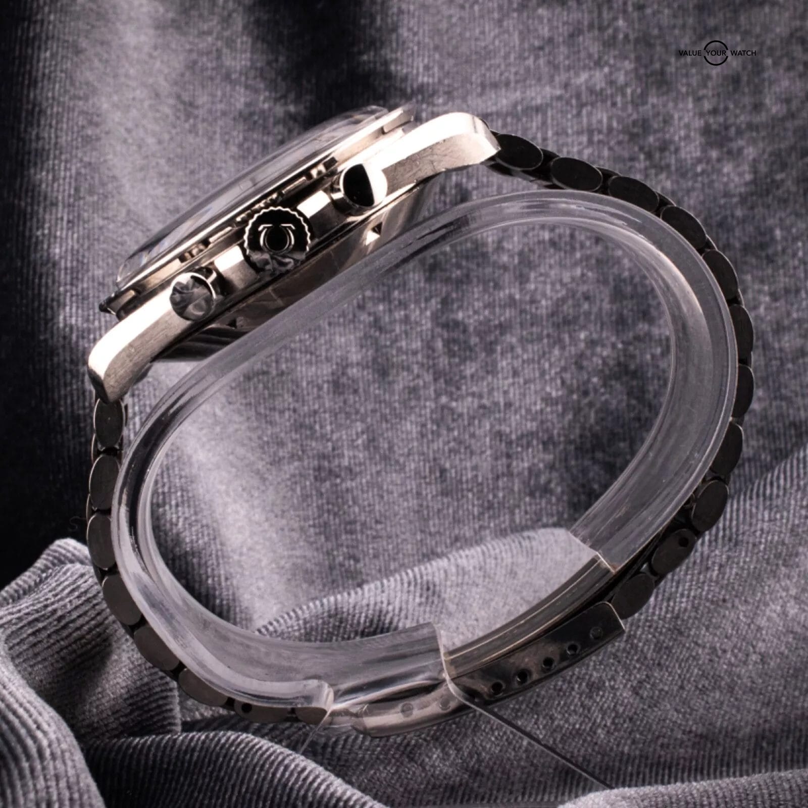 Case: 42mm stainless steel case, sharp lyre lugs, and the signature asymmetrical design for added protection to the crown and pushers. Case appears to be unpolished.