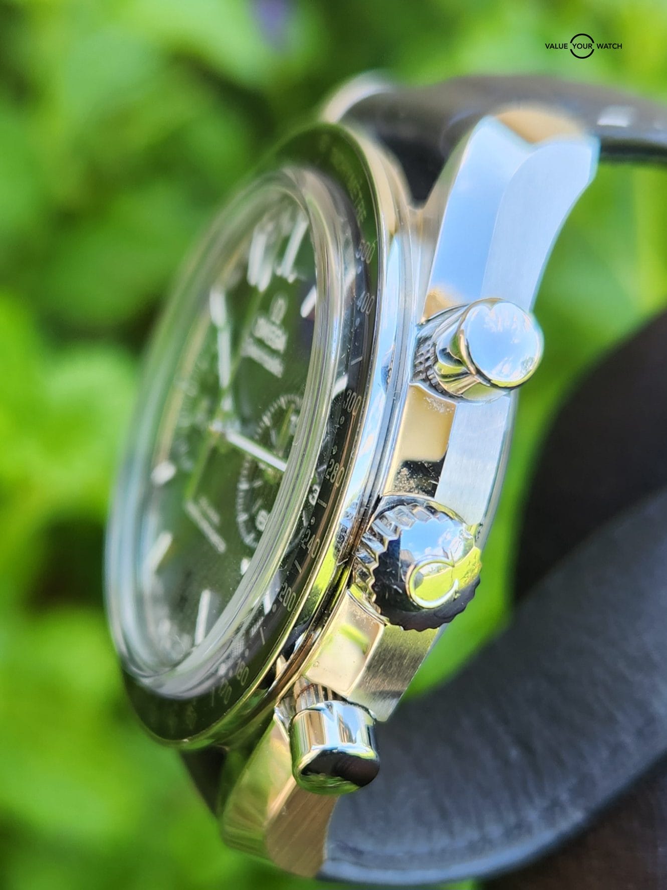 The watch showcases a sizable 44.25mm stainless steel case with a black dial, projecting a sophisticated and modern aesthetic. The dial is highly legible, with two subdials for the chronograph function and a date window at 6 o’clock.