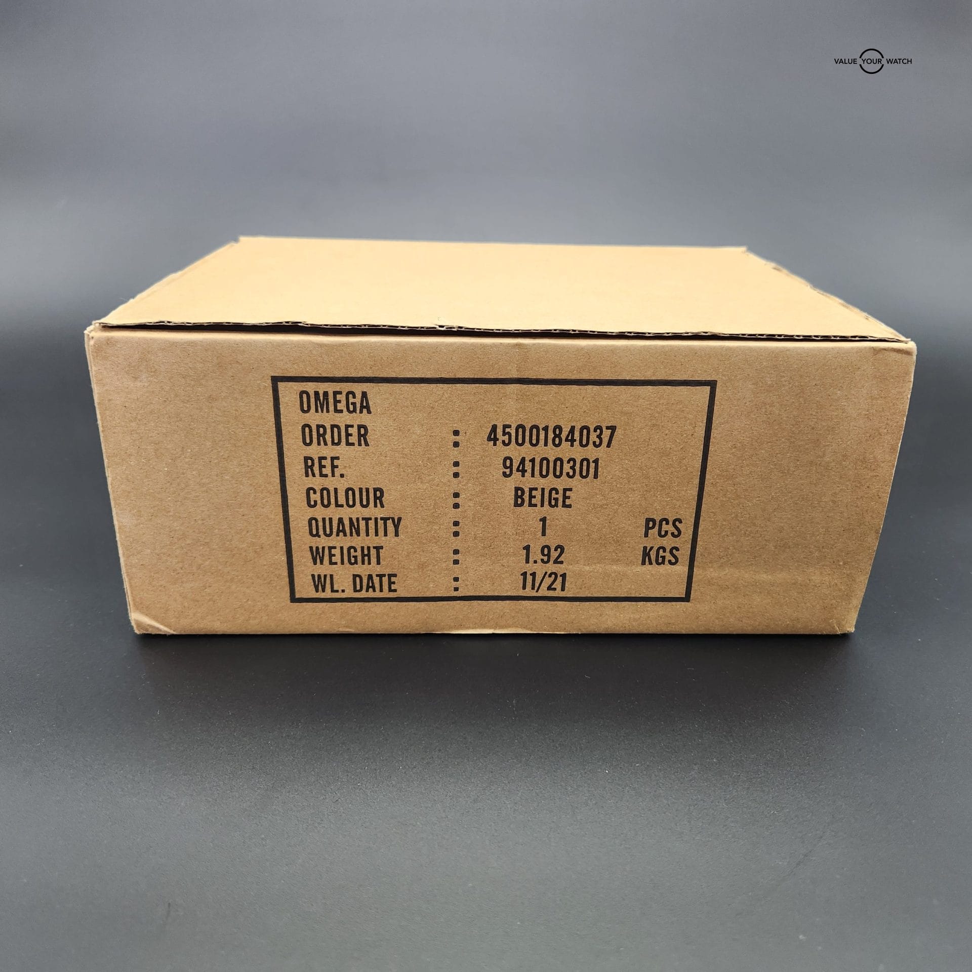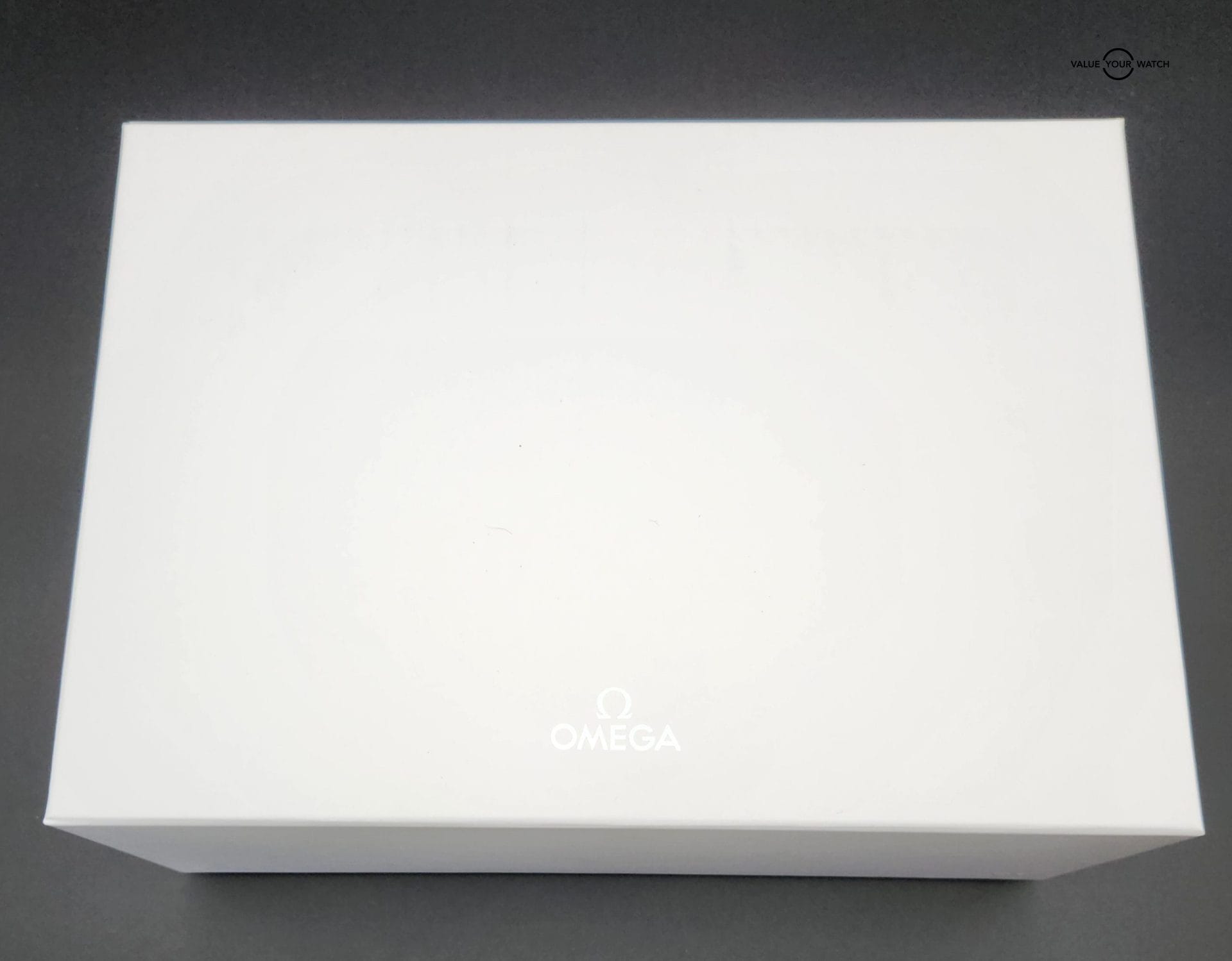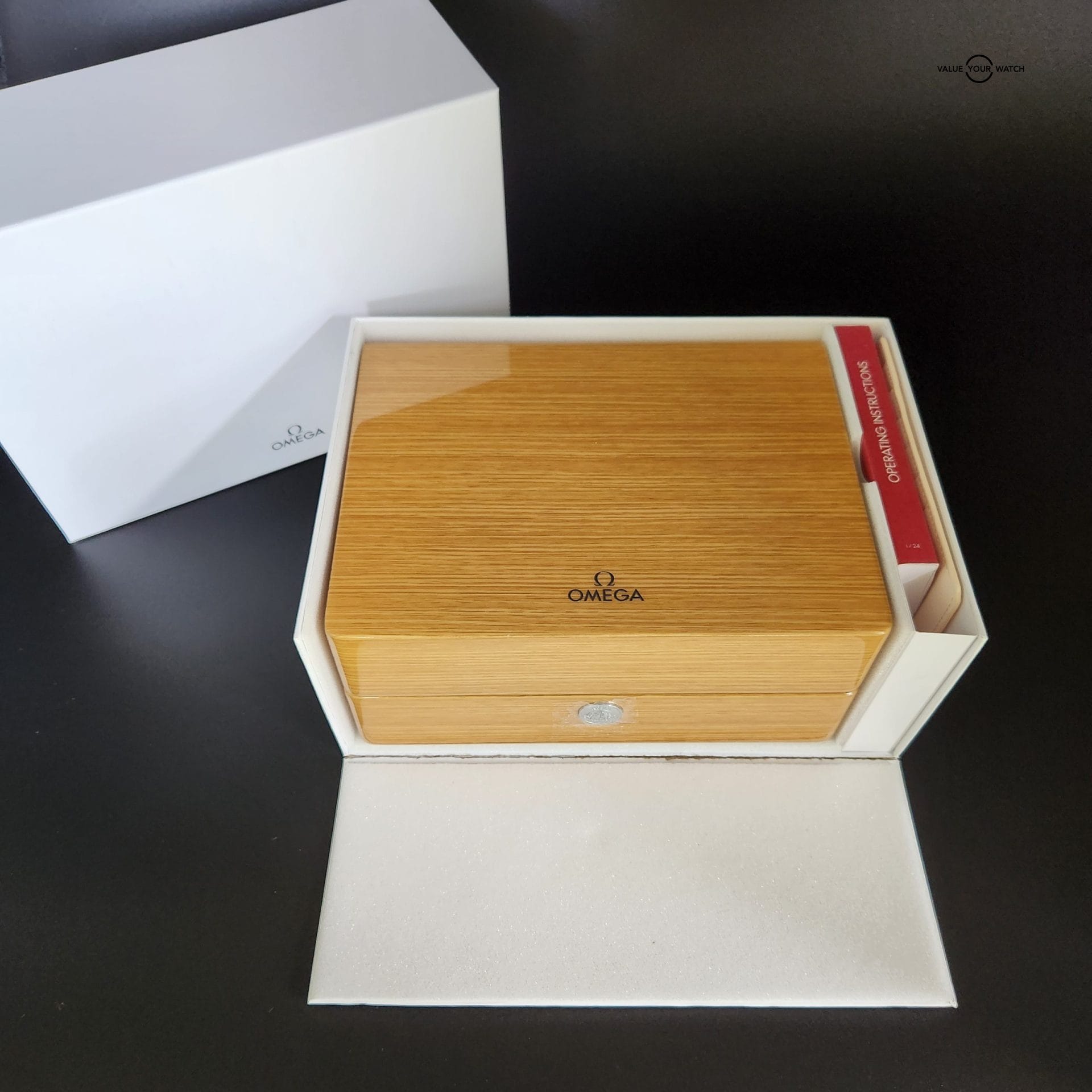 This timepiece is in unworn condition and is a complete set including outer and inner boxes, OMEGA wooden display box, international warranty card, pictograms card, master chronometer card, card holder, instruction manual and OEM cloth travel bag.