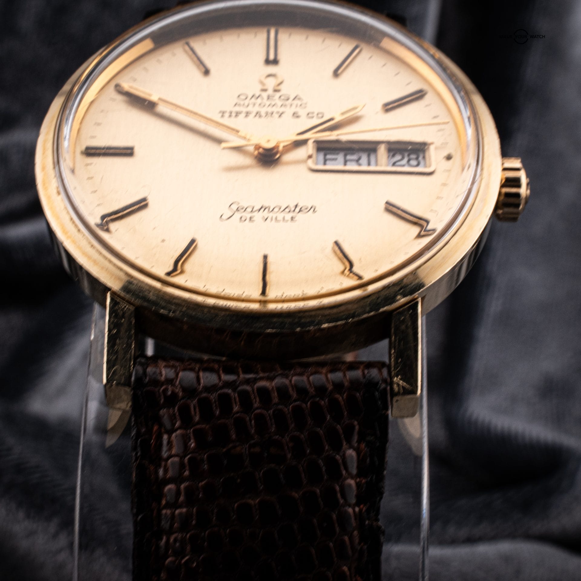 The Omega Seamaster C6865 with a Tiffany dial is a distinctive and rare timepiece that represents the pinnacle of luxury and precision. Featuring a 14k yellow gold case, this watch boasts a unique champagne dial co-signed by Tiffany & Co., adding an extra layer of exclusivity and elegance. The domed acrylic crystal and luminous hands and markers enhance its classic aesthetic, while the stainless steel bracelet with a folding clasp ensures both style and comfort.