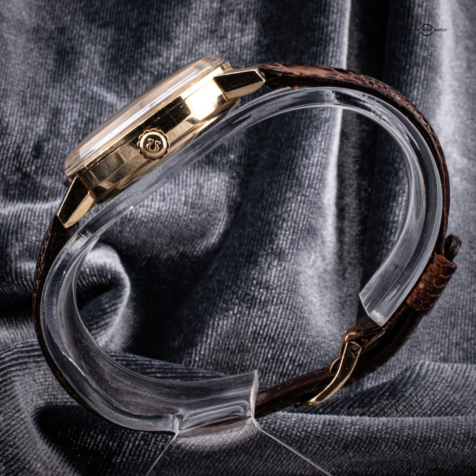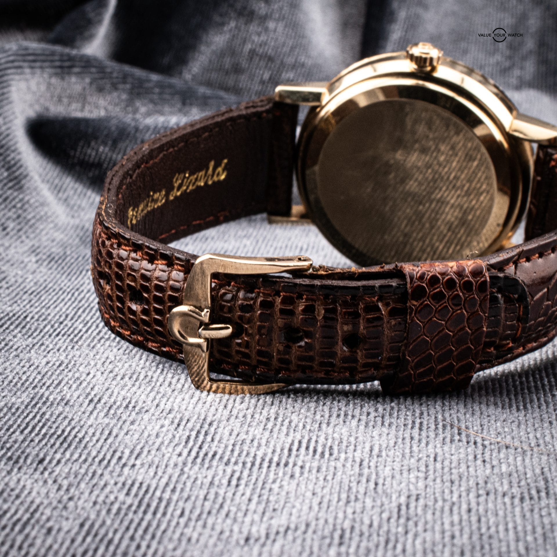 Contents: Watch only on AM lizard skin strap with gold Omega buckle.