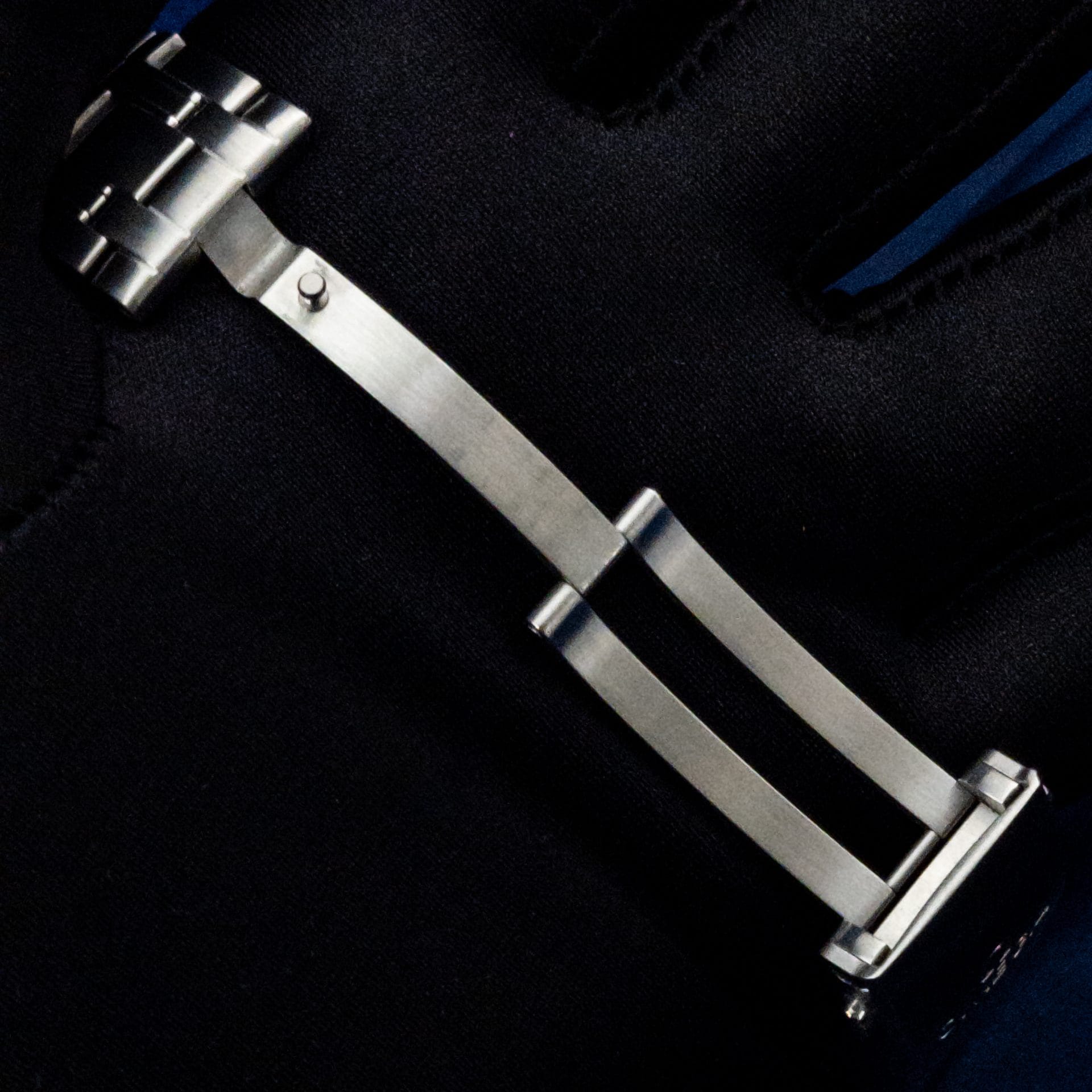 Bracelet: Tight and secure. Clasp features the ingenious “rack-and-pusher” micro-adjustment for instant sizing. Fits up to a 7 1/2″ but three additional links are included.