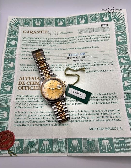 1995 Rolex Datejust 16233 50th Anniv Jubilee dial watch. Collector’s set!