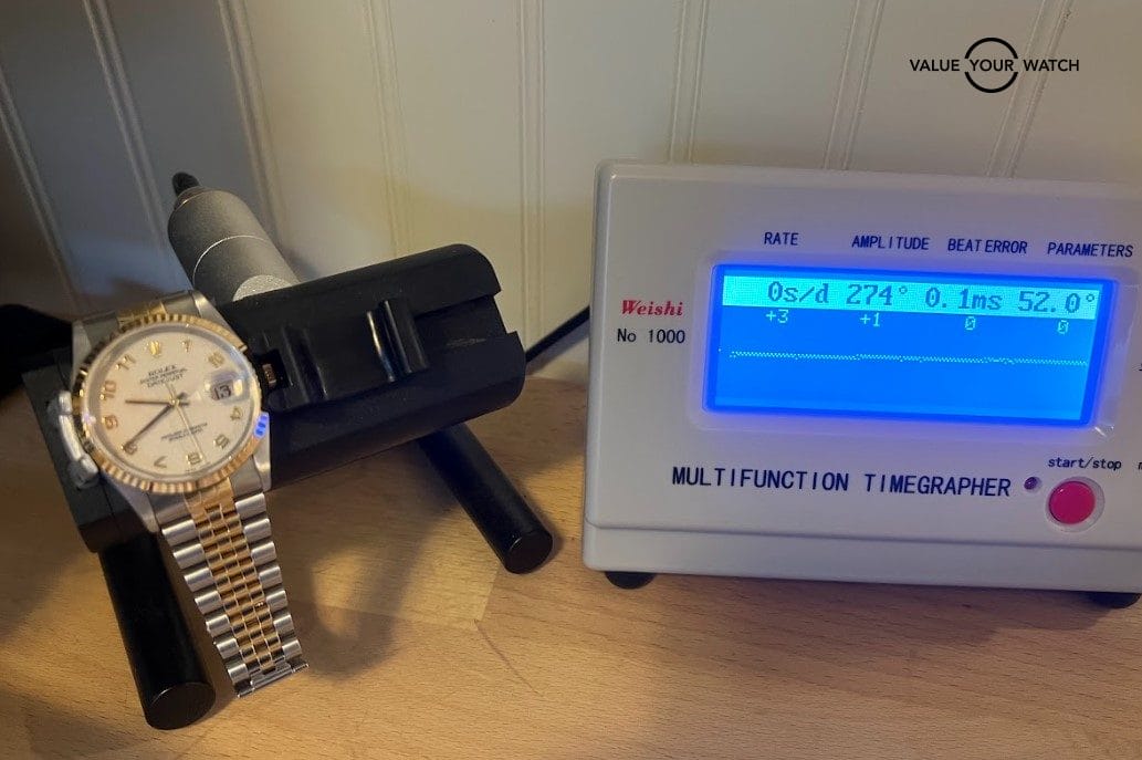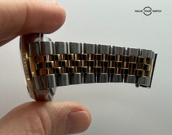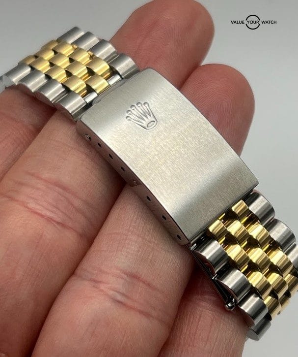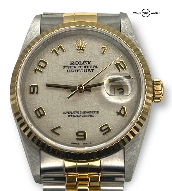 This is an exceptional 1998 Rolex Datejust 16233 with a rare and highly desired Arabic Ivory Jubilee Anniversary dial. The watch is running very accurately, with 0 to +3 seconds of deviation per day, strong amplitude, and a 0.0 to 0.1 beat error. These readings are well within COSC specifications, indicating that the watch won’t need servicing for at least a few years. It’s also in excellent cosmetic condition, with an expert polish making it look almost new. The dial and hands are original, and the bracelet will fit a wrist of roughly 7.5 inches, with more links available if needed.