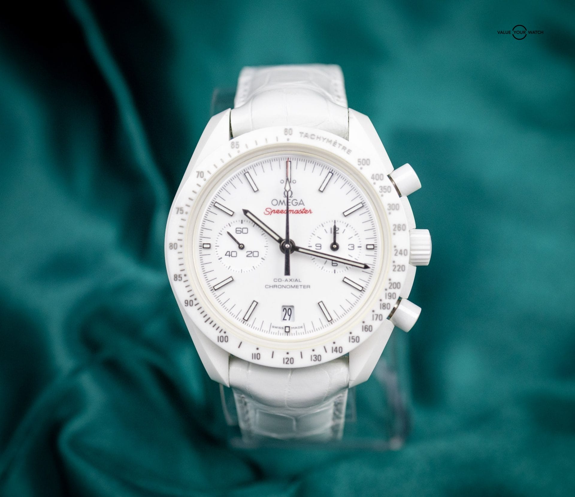 Experience the elegance of space exploration with the Omega Speedmaster “White Side of the Moon” (Ref. 311.93.44.51.04.002). Inspired by the bright, illuminated surface of the Moon, this timepiece stands out with its pristine white zirconium oxide ceramic case, making it a bold yet refined statement for collectors and enthusiasts alike.