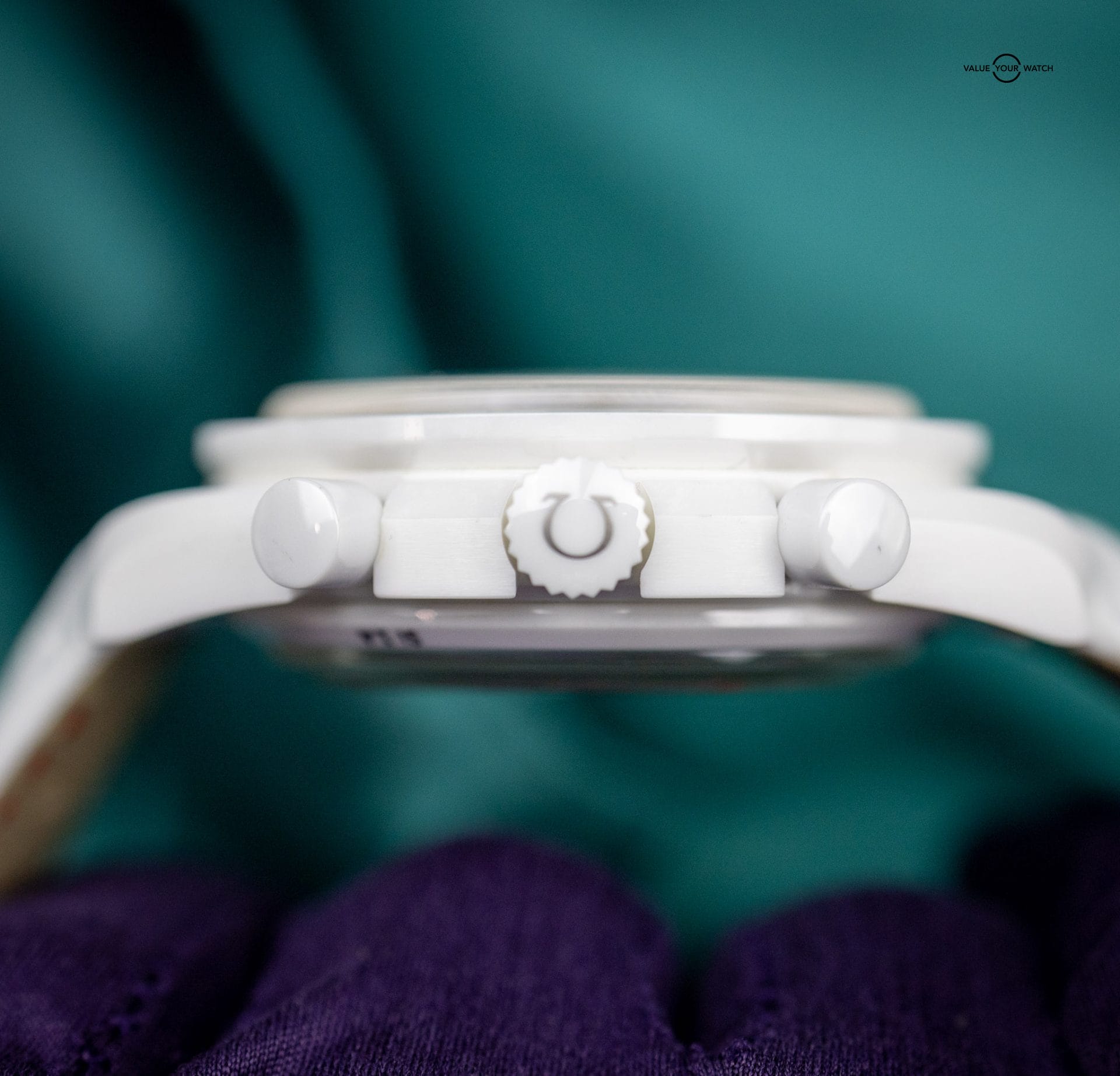 ✔ White Ceramic Bezel with Tachymeter Scale – A signature Speedmaster feature for precise timing.