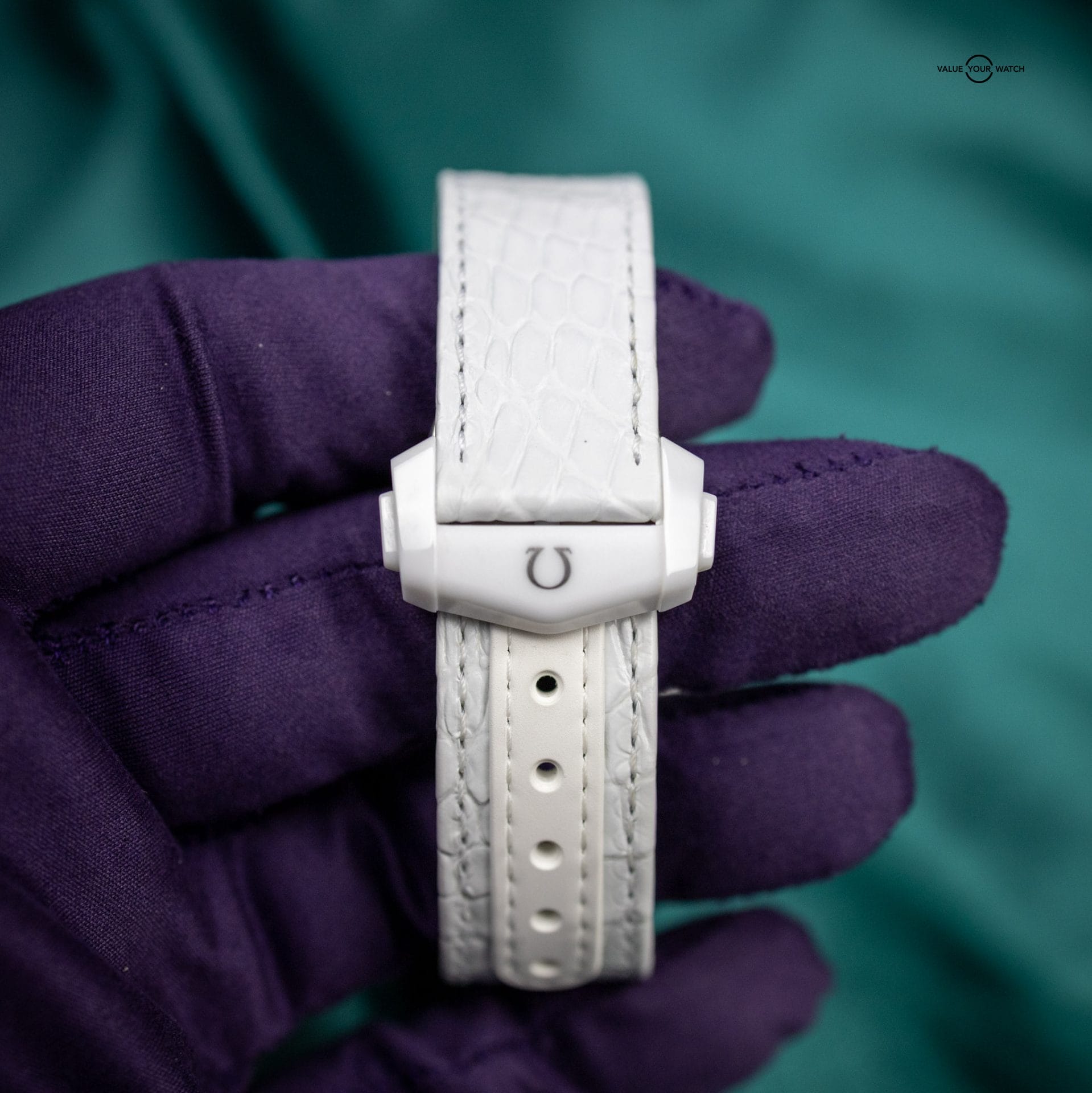 ✔ White Leather Strap with Ceramic Folding Clasp – A refined, comfortable fit with a touch of luxury.