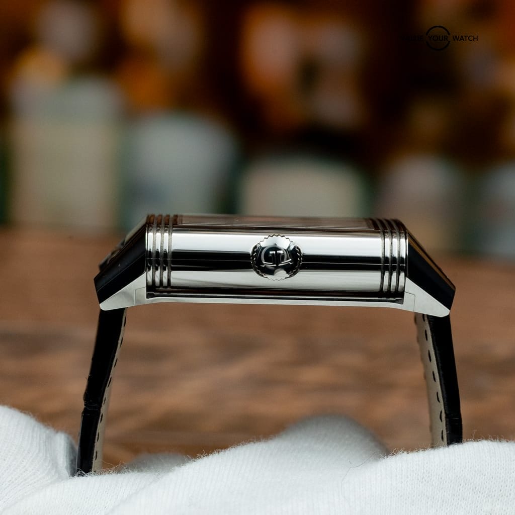 The reversible case design originated in 1931 for polo players needing to protect crystals during matches. Today, the Duoface serves a more practical purpose: quickly checking two time zones by flipping the case rather than reading a GMT hand. At 47mm x 28.3mm, the rectangular case appears substantial but wears elegantly thanks to Art Deco proportions and slim profile. This 2021 example shows minimal wear consistent with three years of careful ownership.