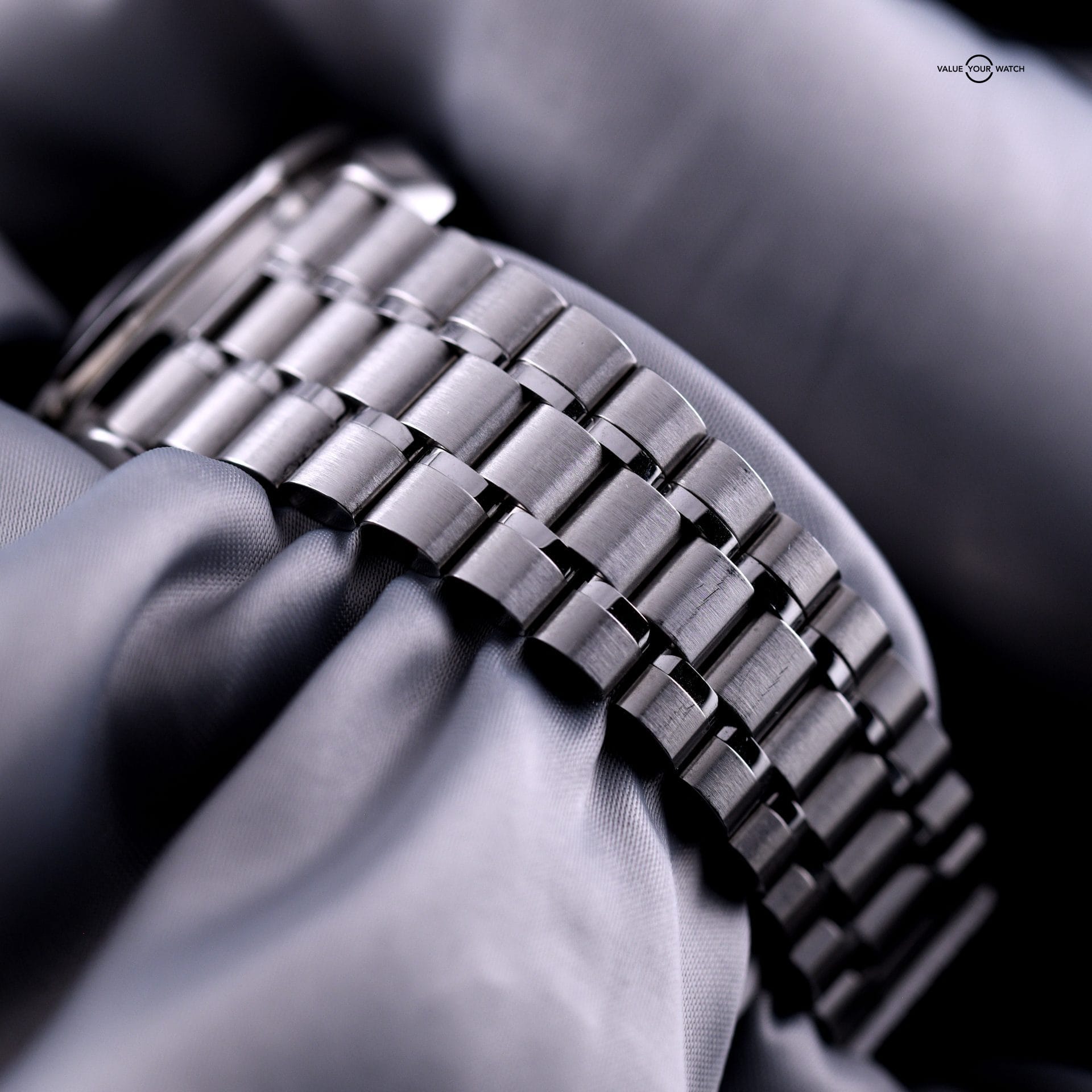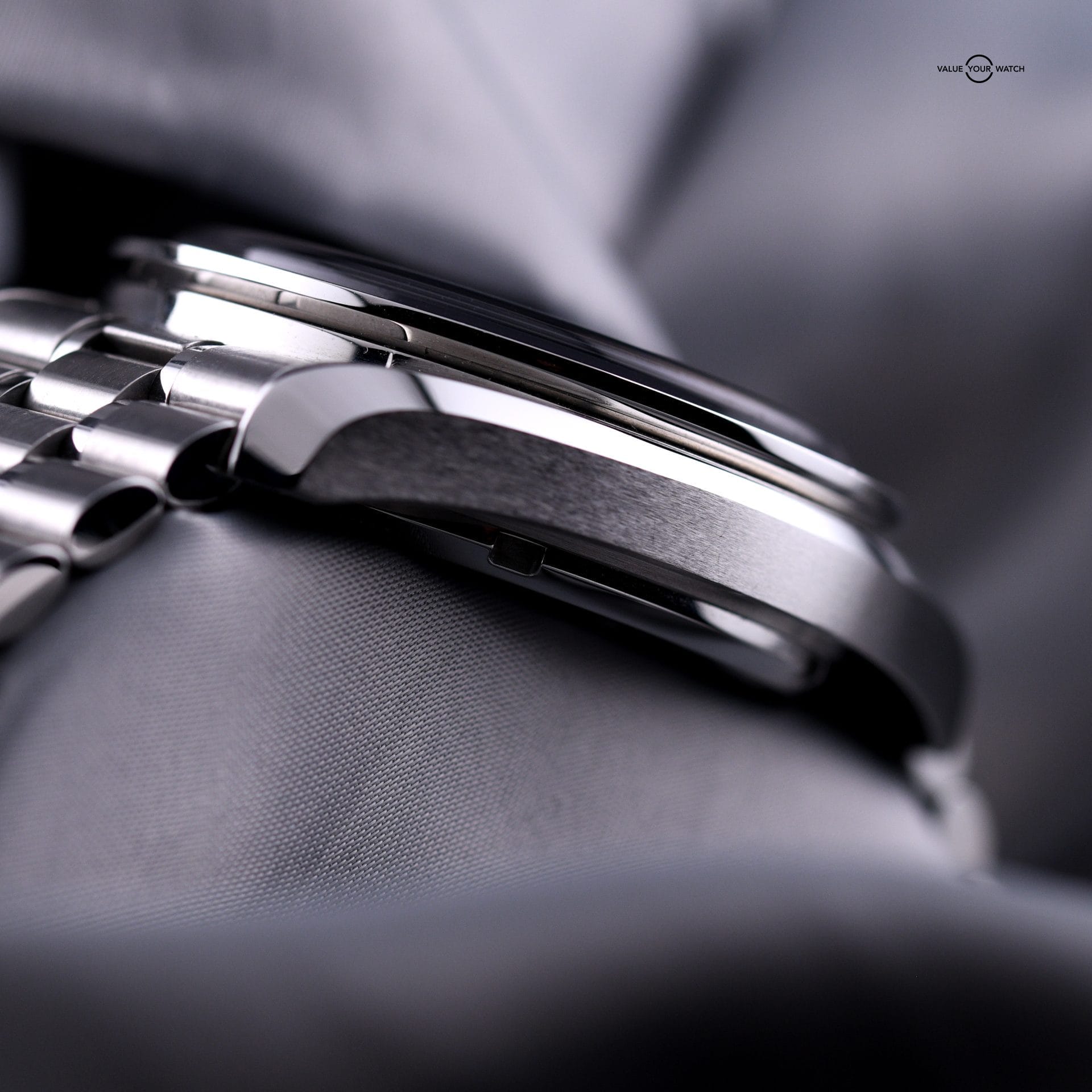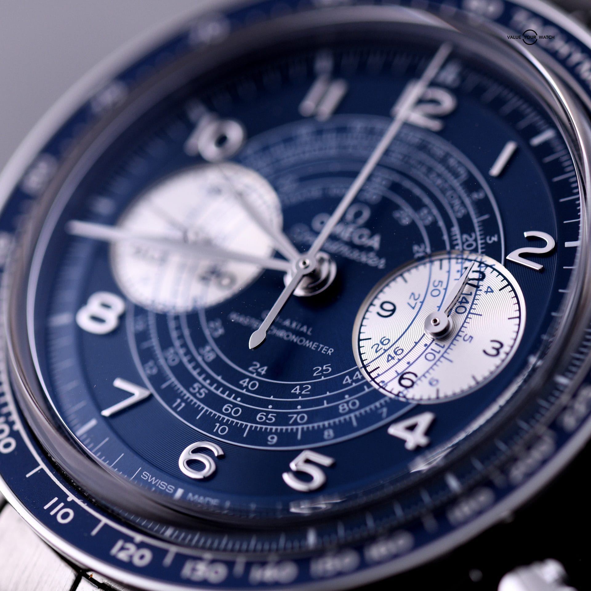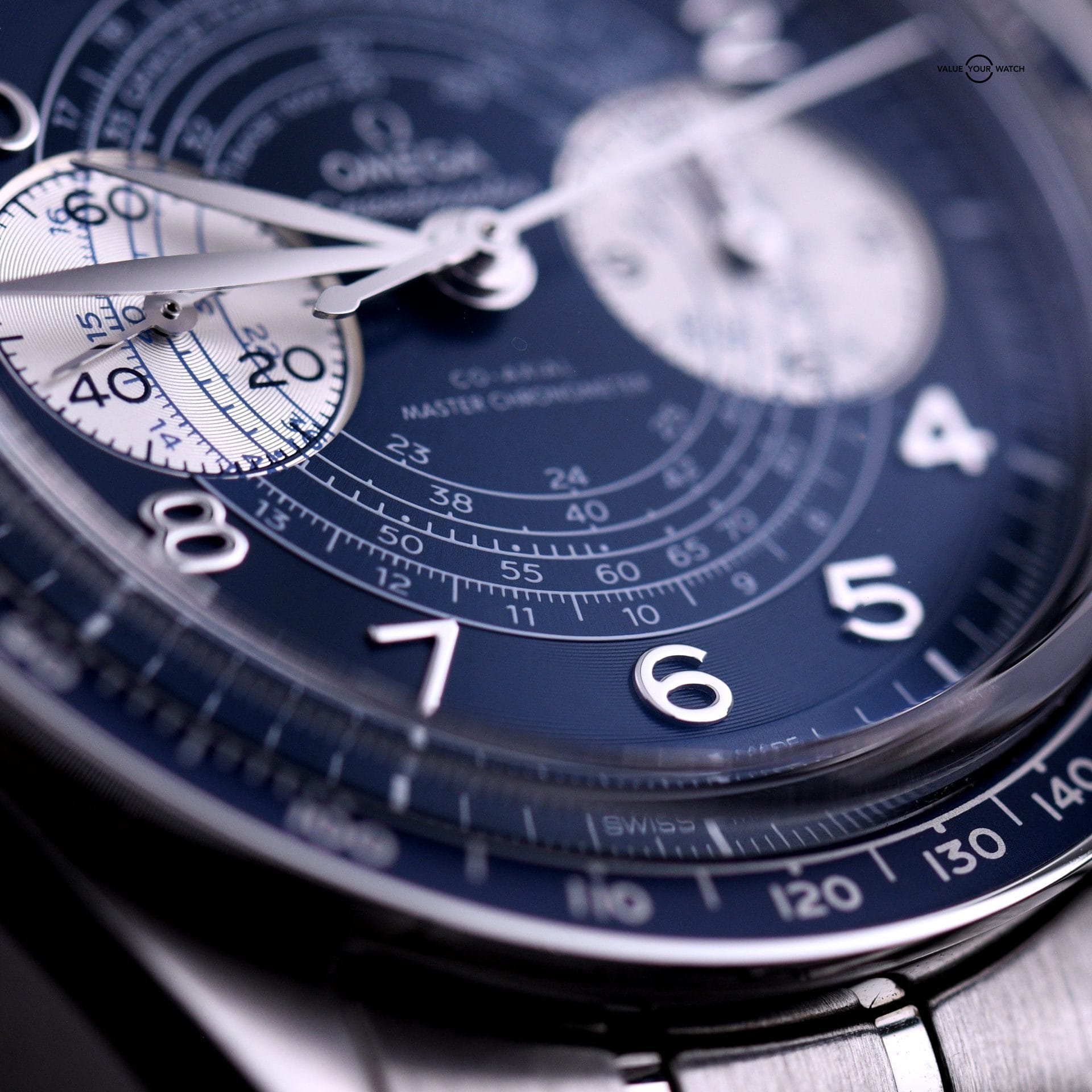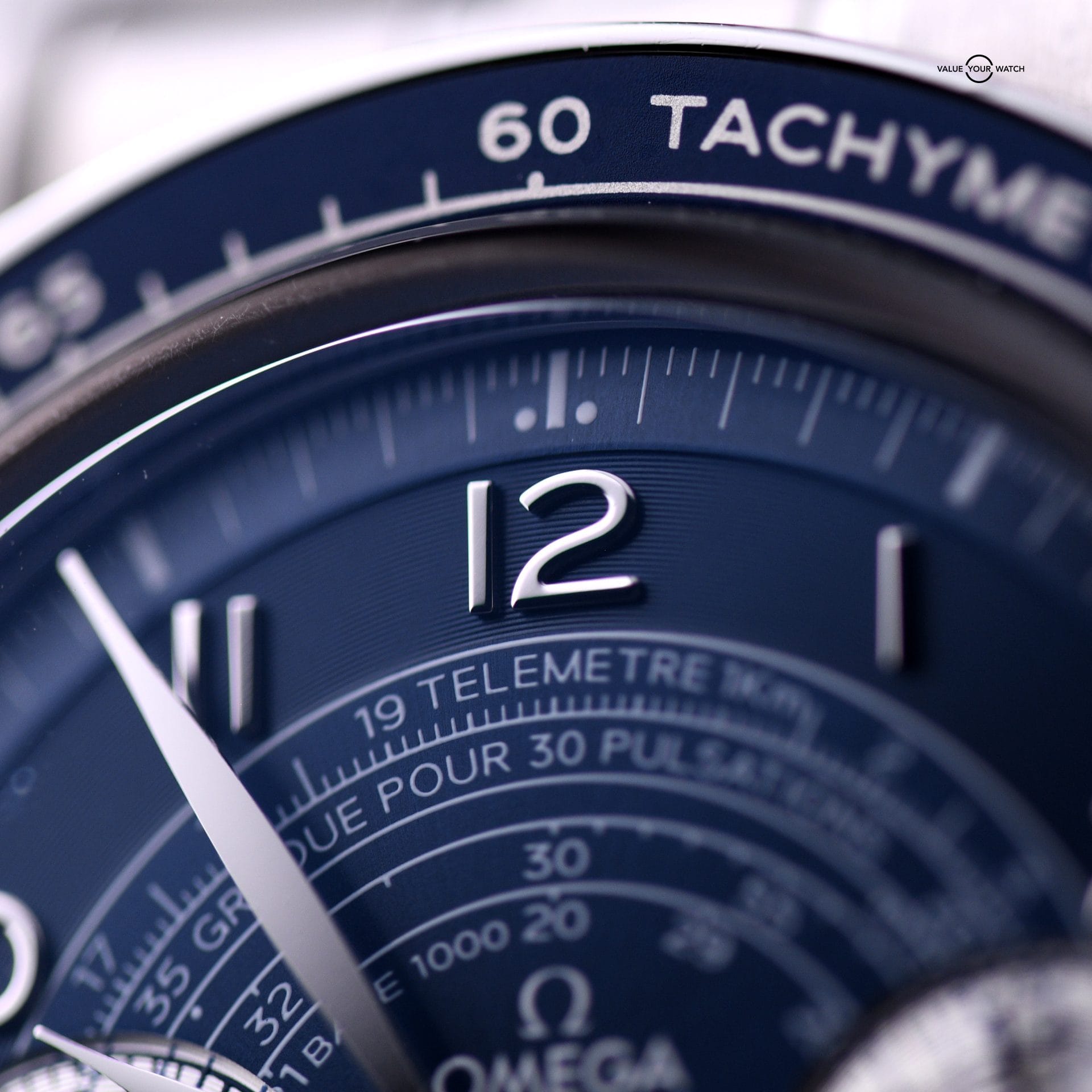 At 43mm, the case has a presence, but the slim profile and beautifully tapered lugs give it a sleek, tailored feel. The sunburst blue dial is really the star here — deep and dynamic in the light, with a vintage-style printed triple-scale layout: tachymeter, telemeter, and pulsometer. It’s a throwback to classic chronographs of the 1940s, brought into the modern age with Omega’s clean execution and attention to detail.