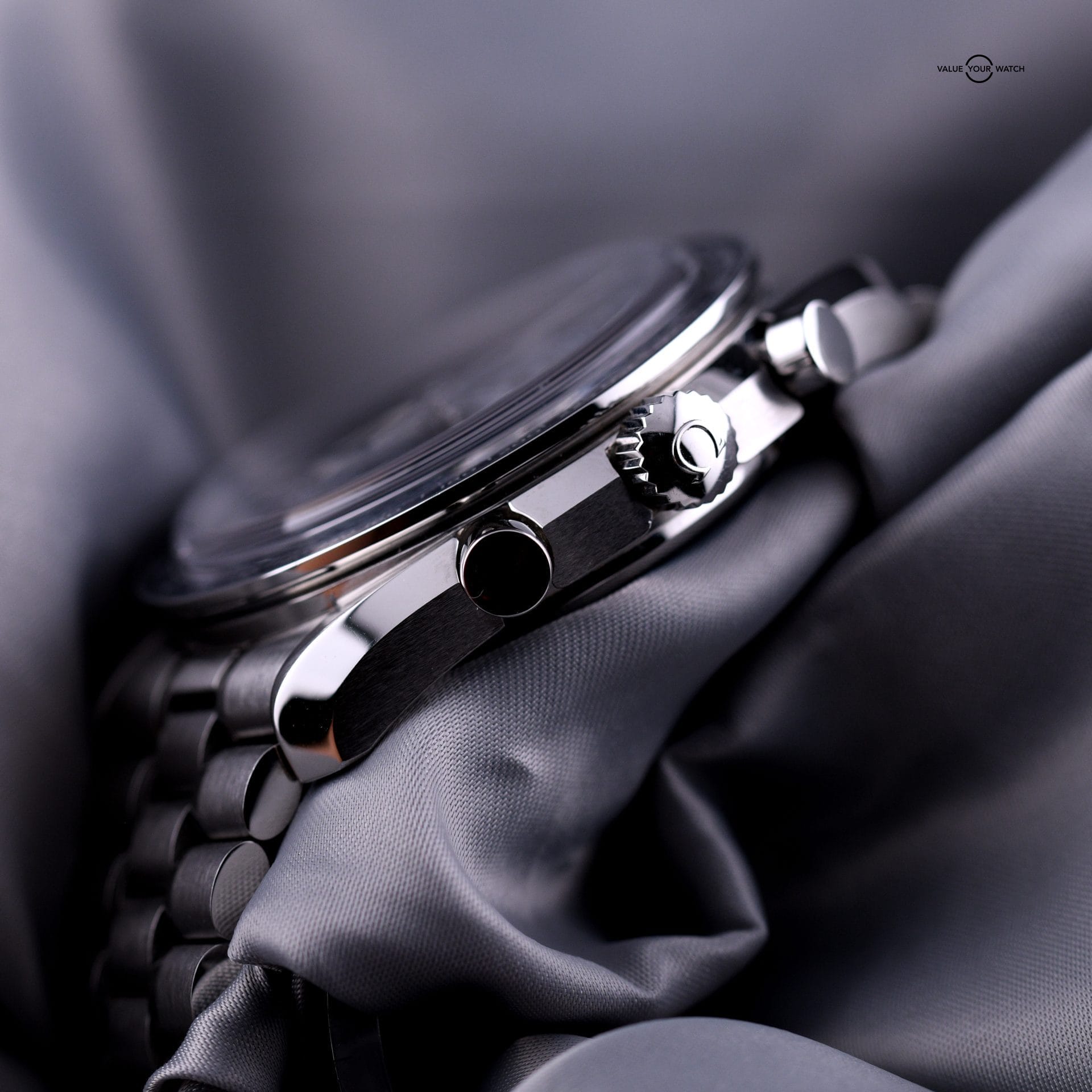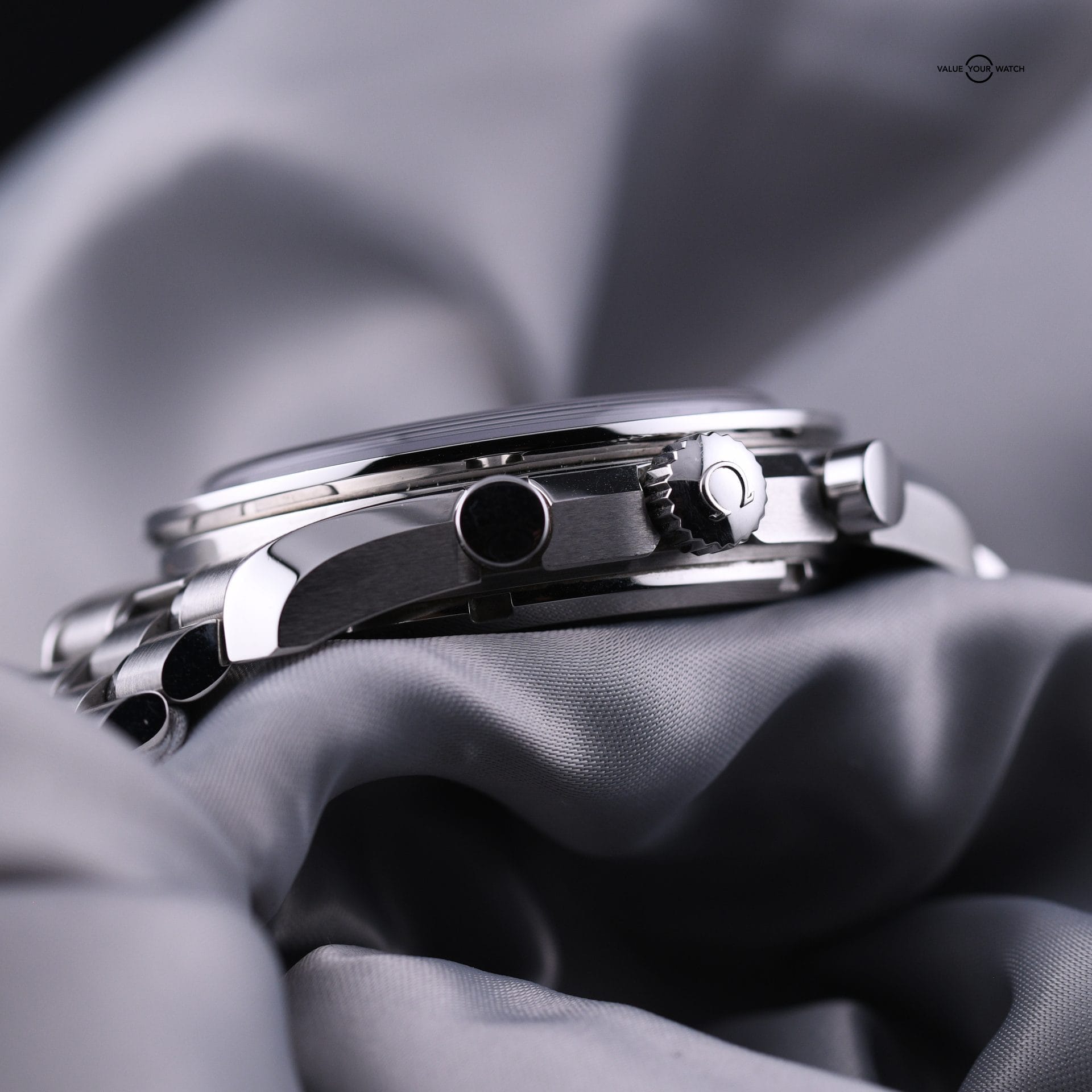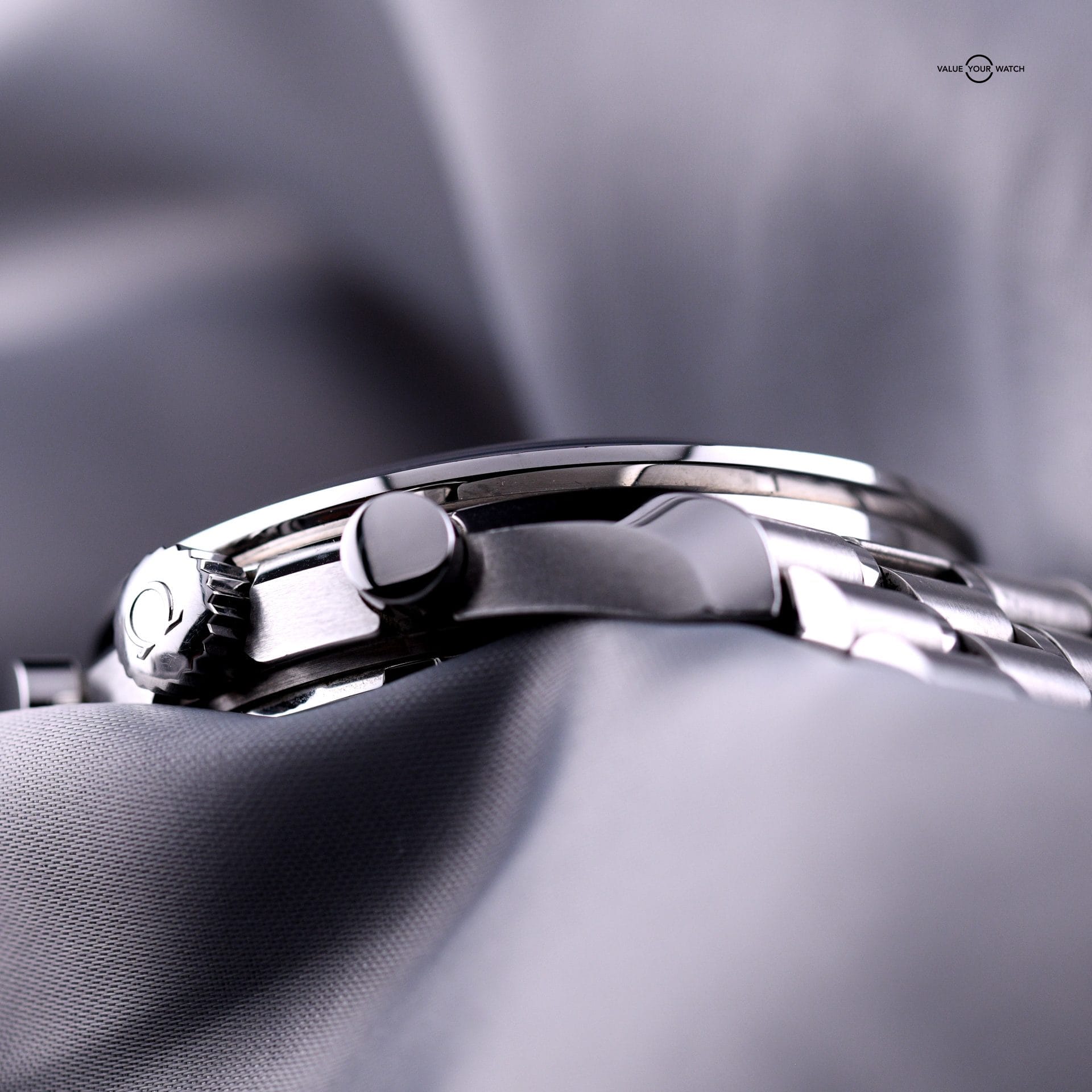 This watch is a full set, including the original box, warranty card, instruction manual, and pictogram card. It shows very minimal signs of wear and is in excellent condition throughout. Still under Omega factory warranty.