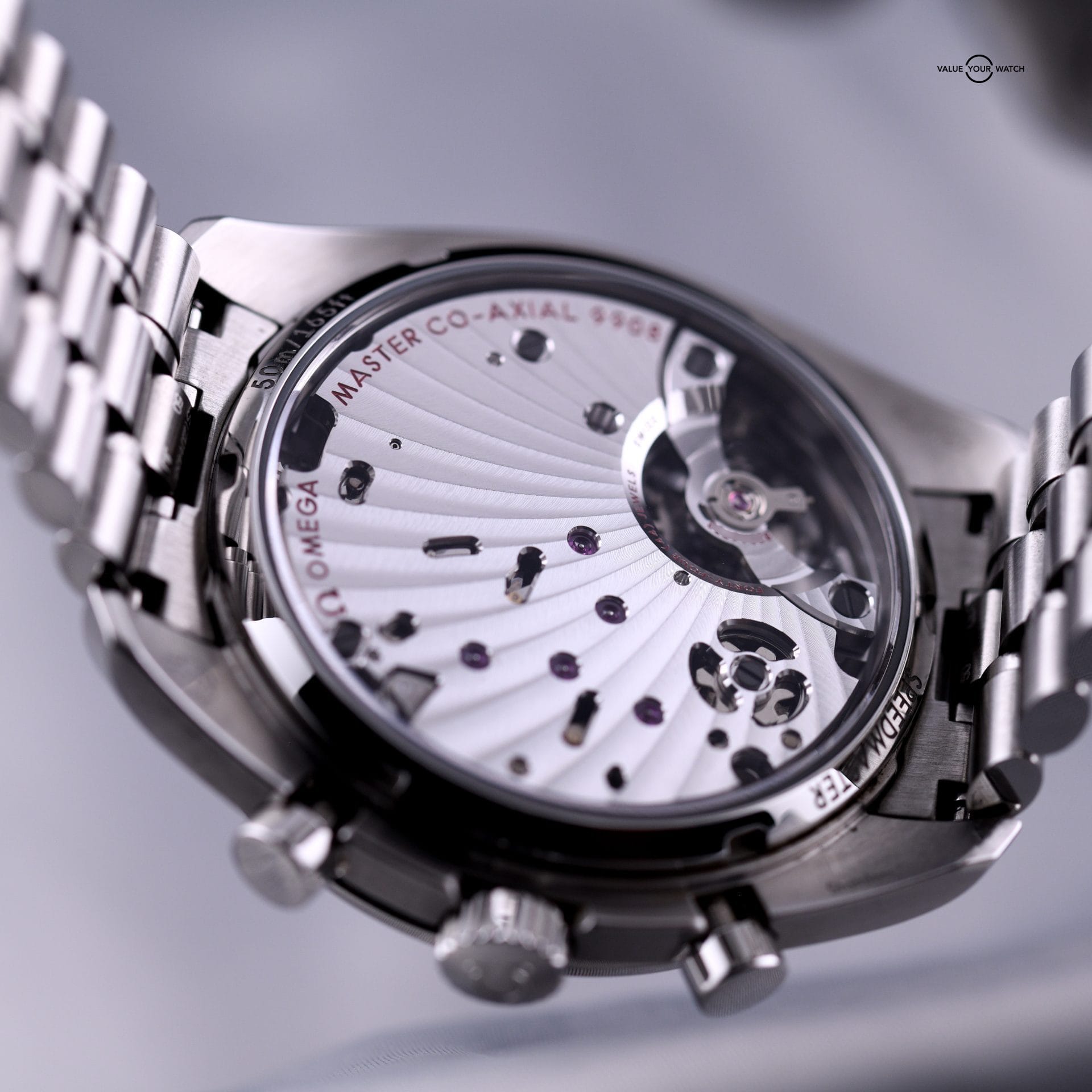 Inside, you’ve got the Omega Co-Axial Master Chronometer Caliber 9908, a hand-wound movement with a column wheel chronograph, METAS certification, and anti-magnetic protection. It’s finished with Geneva waves in arabesque and fully visible through the sapphire caseback. Power reserve is 60 hours.