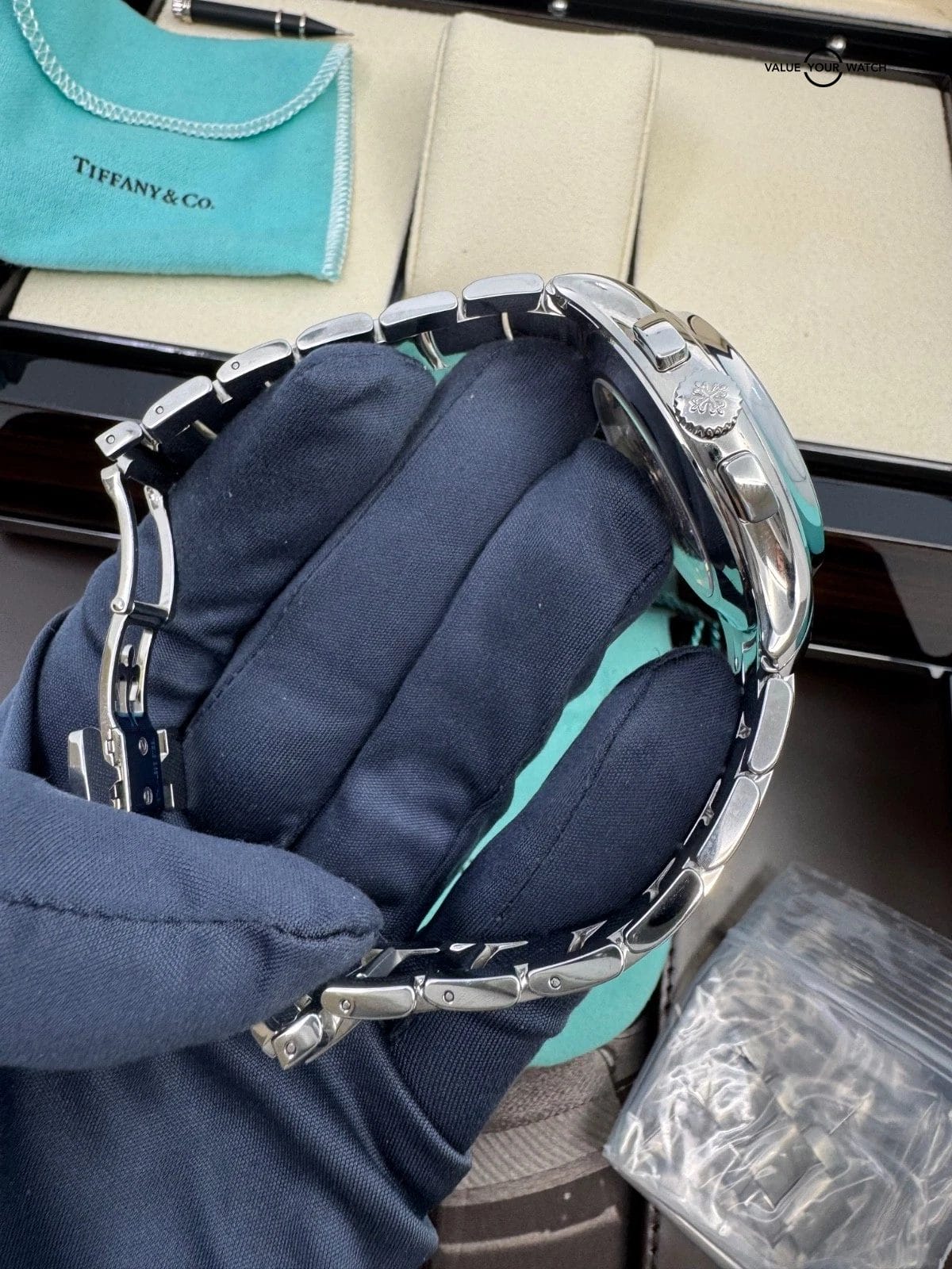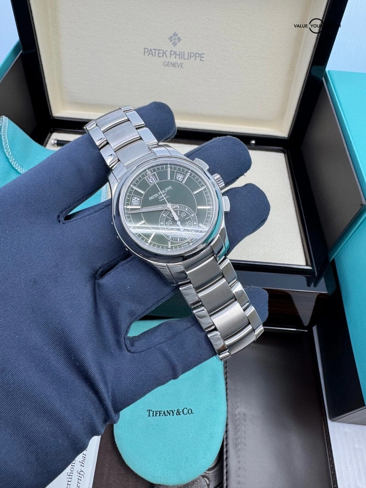 Specification: 2021 Tiffany & Co Stamp MINT Unpolished Green Dial Steel Annual Calendar Flyback