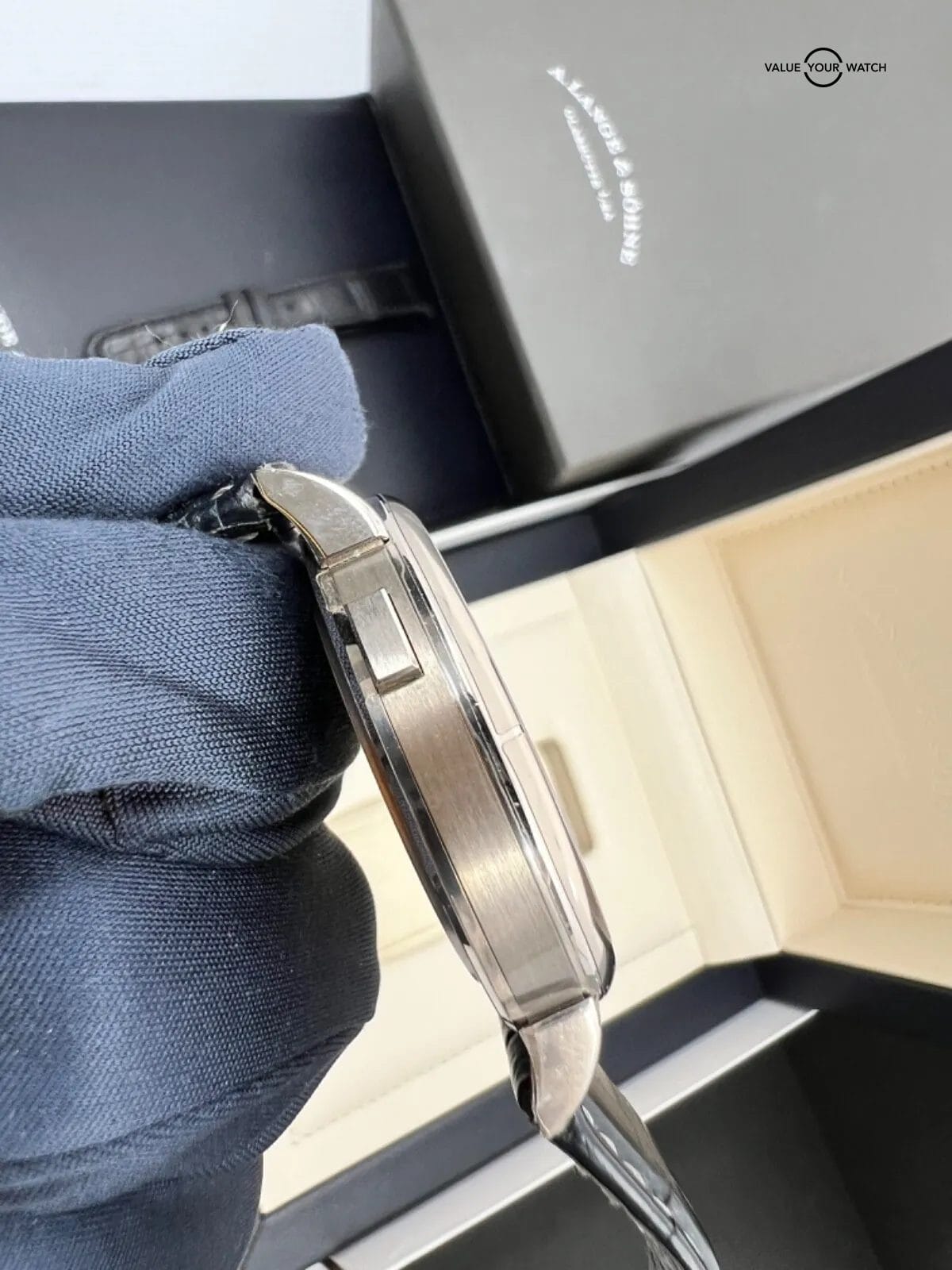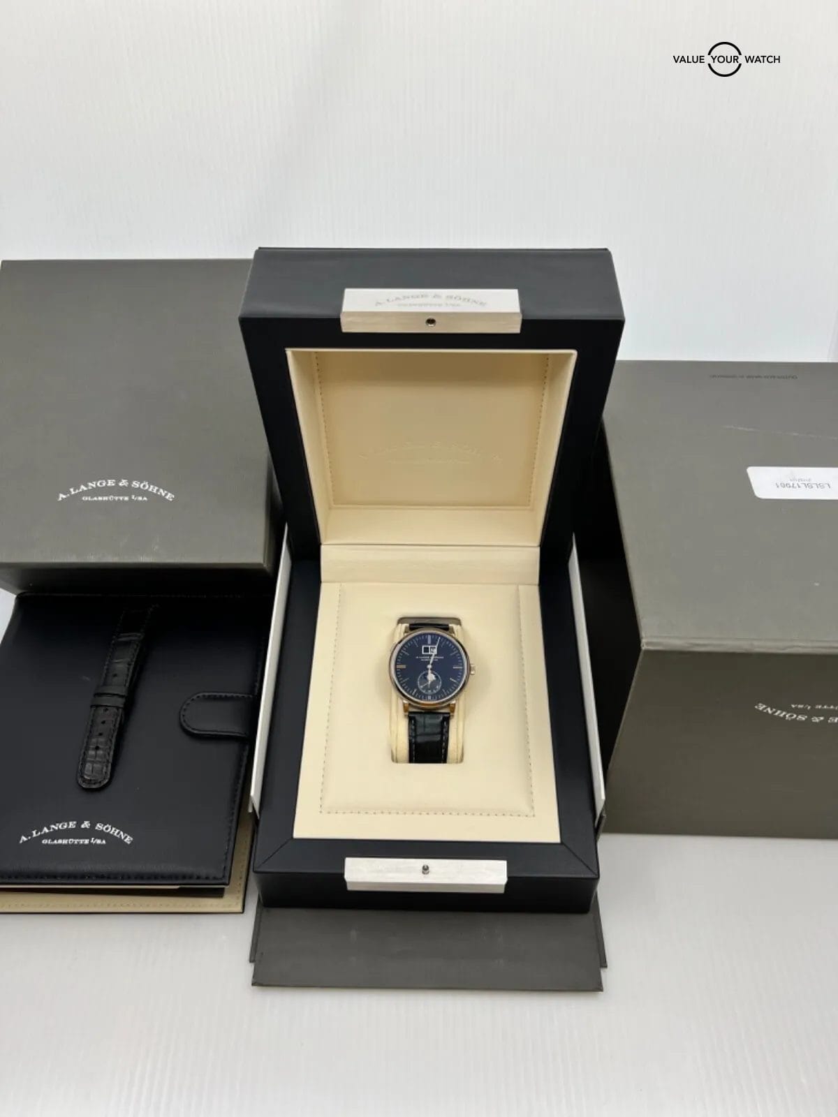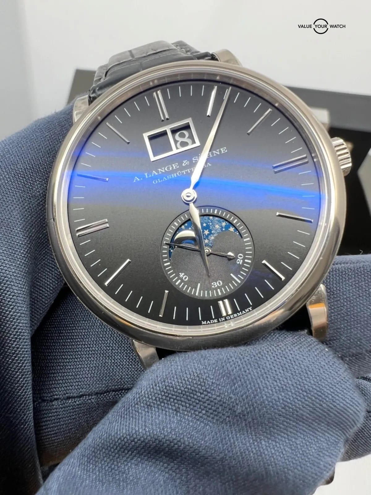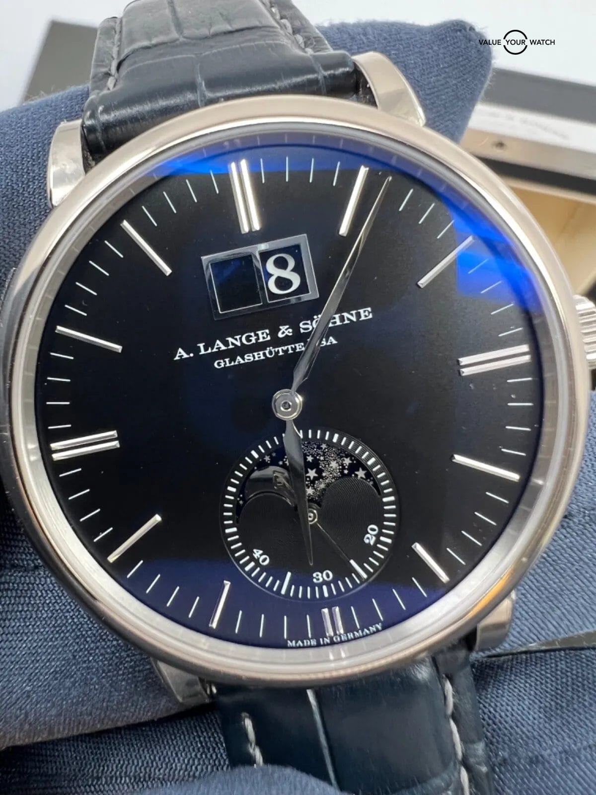 This gorgeous piece has most of the case stickers still intact and an extra Lange strap in excellent condition. The moonphase disc is beautiful, changes from a stunning blue at certain angles to a glossy black when staring at it straight on