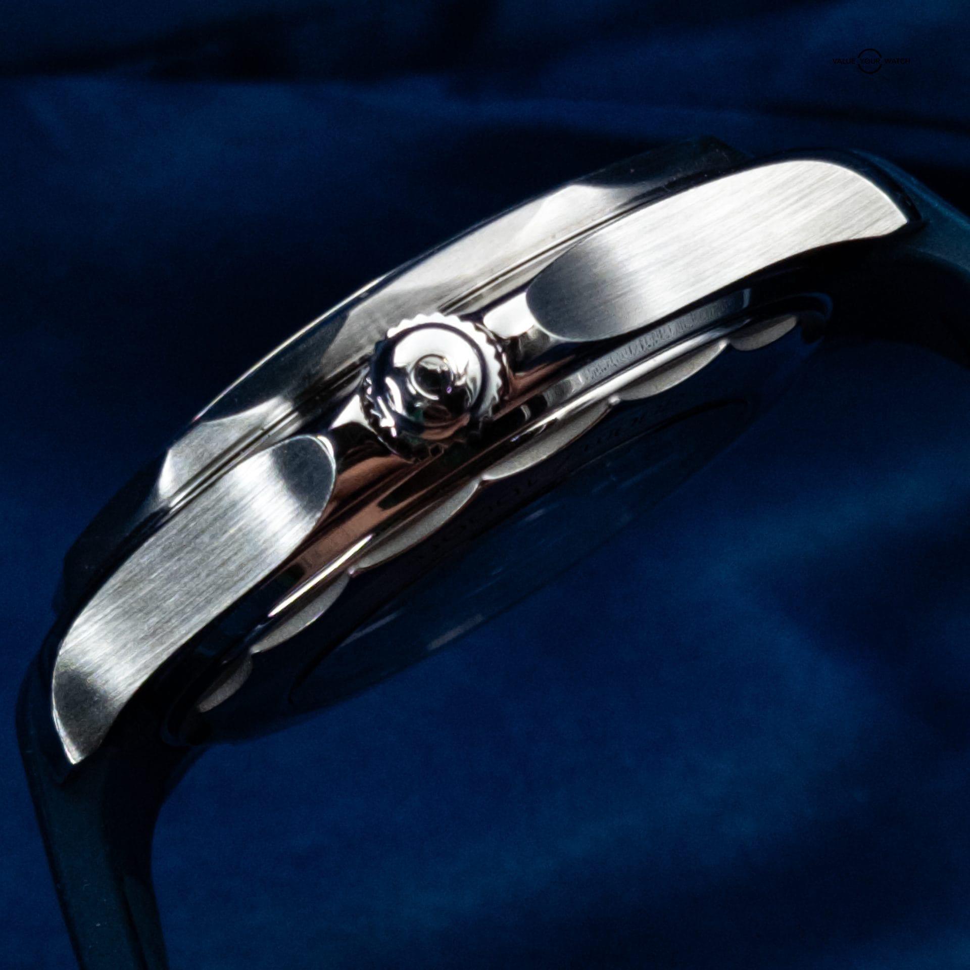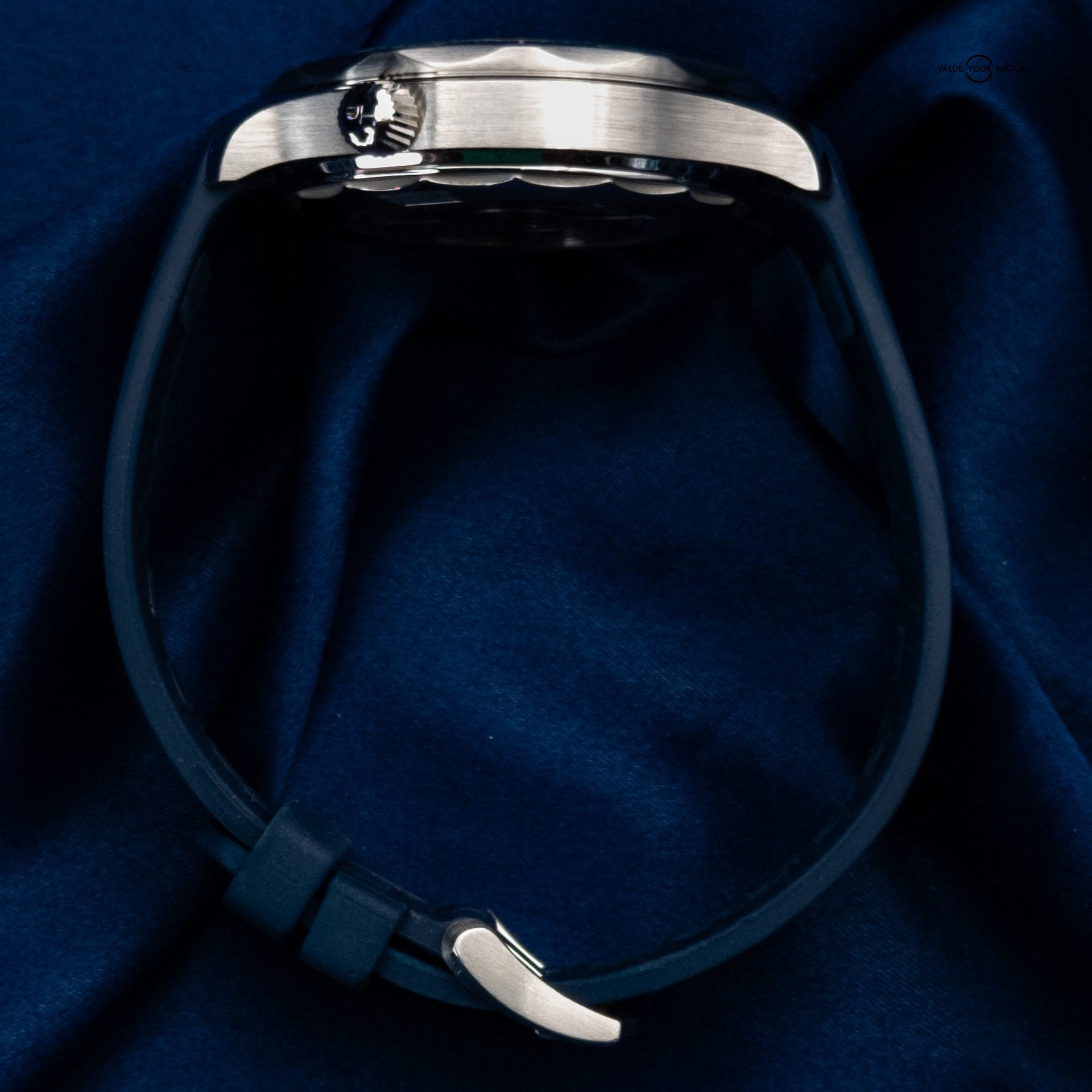 Built to go deep yet polished enough for daily wear, this watch boasts a screw-down crown, helium-escape valve, and 300-metre (30-bar) water resistance. The movement inside is Omega’s in-house calibre 8800, visible via the exhibition case-back and certified to METAS standards for magnetic- and time-accuracy performance. With unique details like blued skeleton hands, raised indexes filled with white Super-LumiNova, and a date window at 6 o’clock, it’s both functional and stylish.