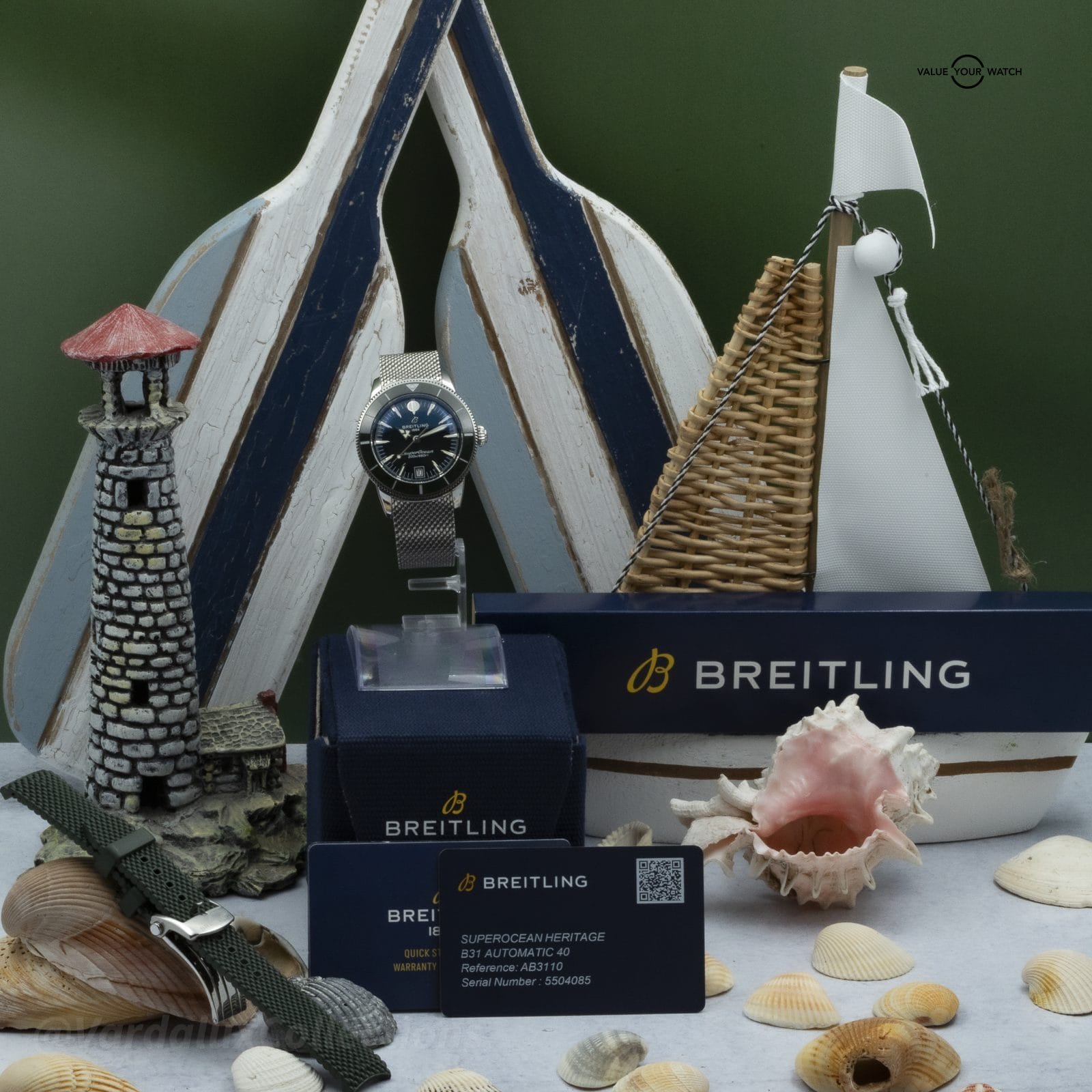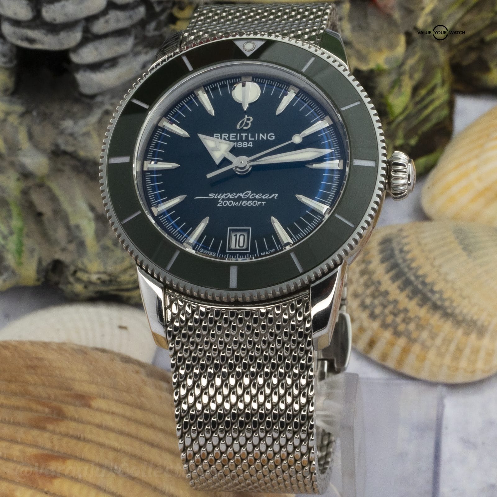 The Superocean Heritage B31 Automatic 40 is Breitling’s 40mm variant of the Heritage diver — sized for daily wear without sacrificing the specification that defines the line. The COSC-certified B31 caliber delivers approximately 120 hours of power reserve, and the green dial and matching rotating bezel make this a cohesive color execution that stands apart from the more common monochrome configurations.