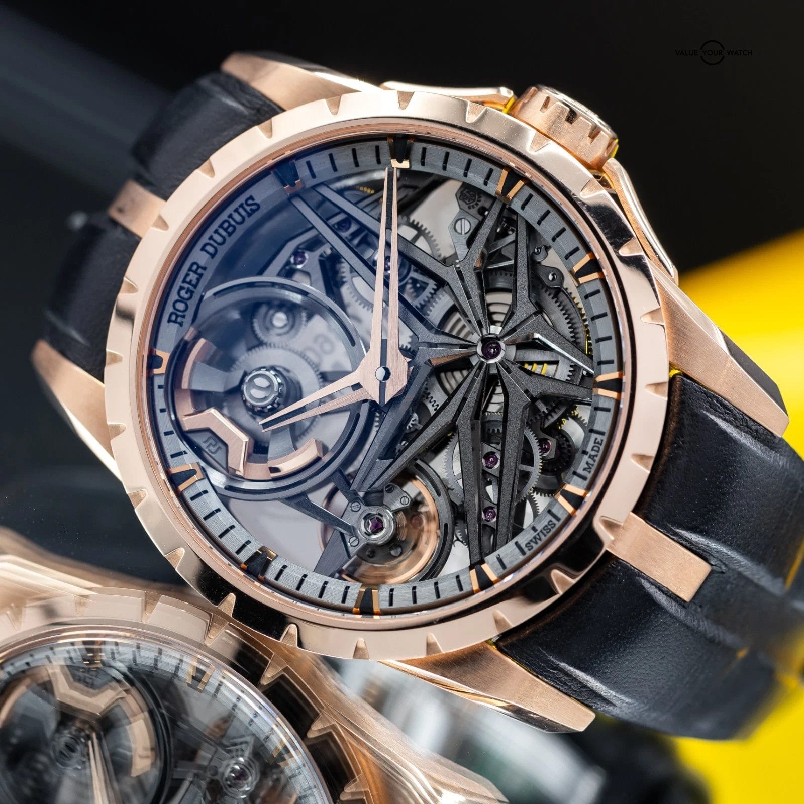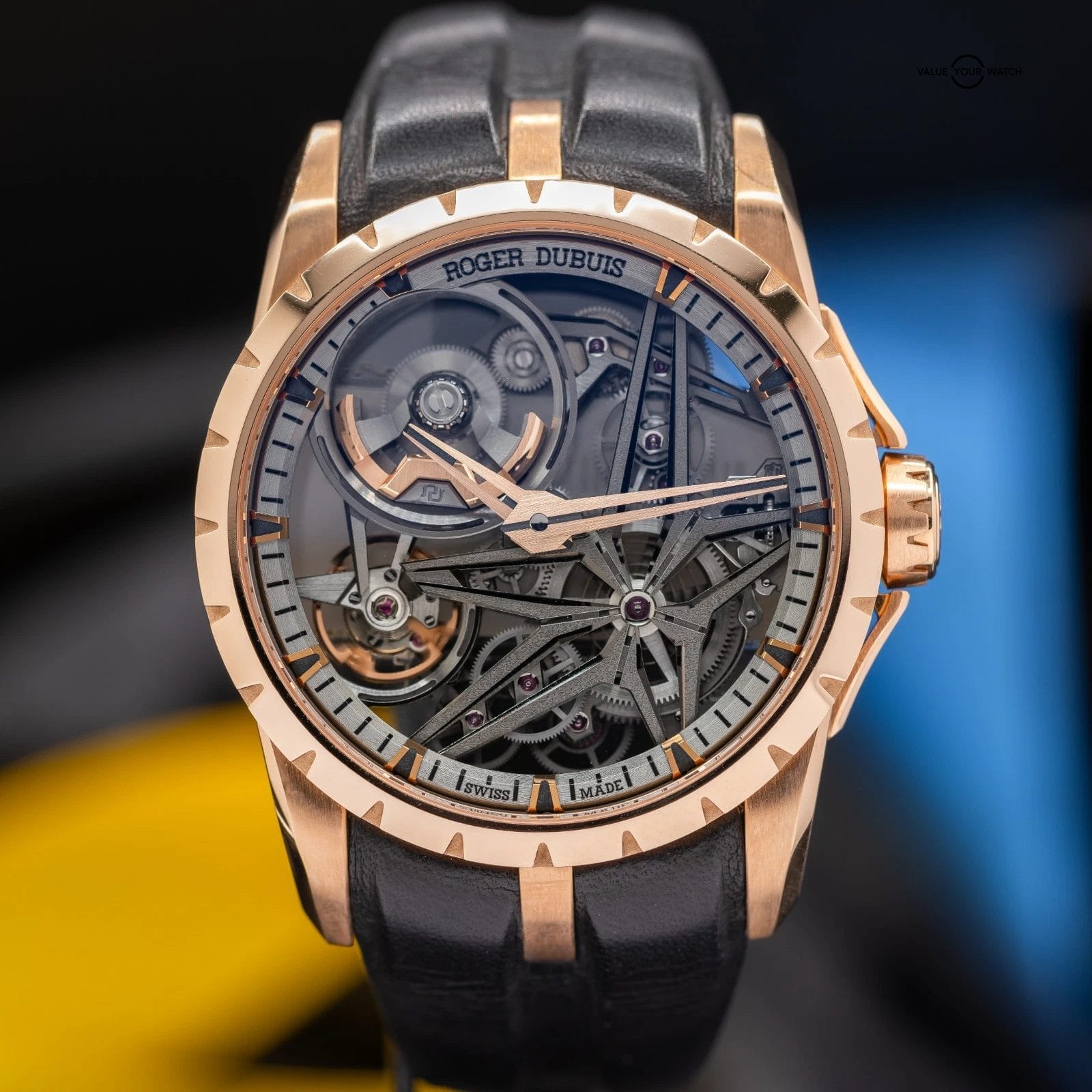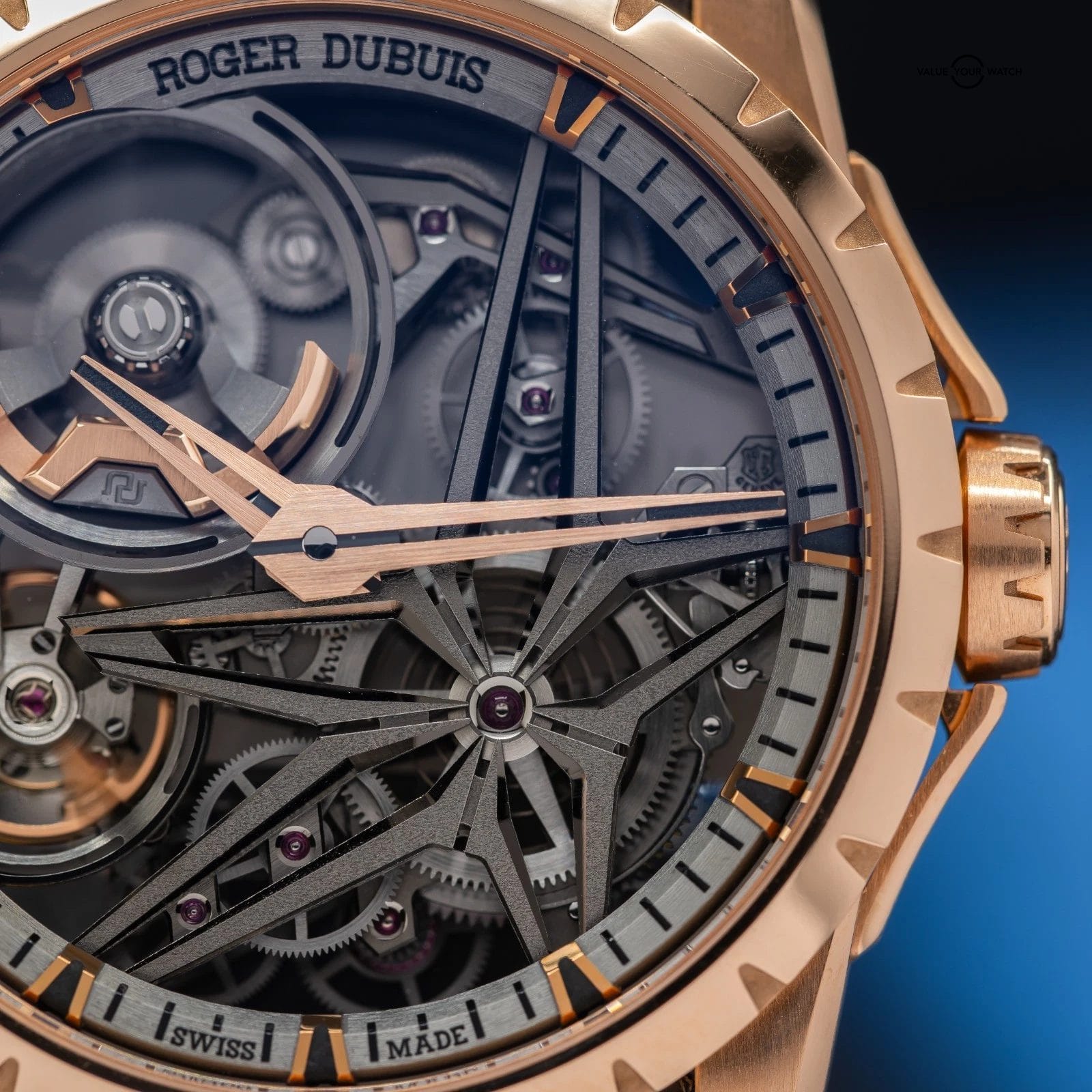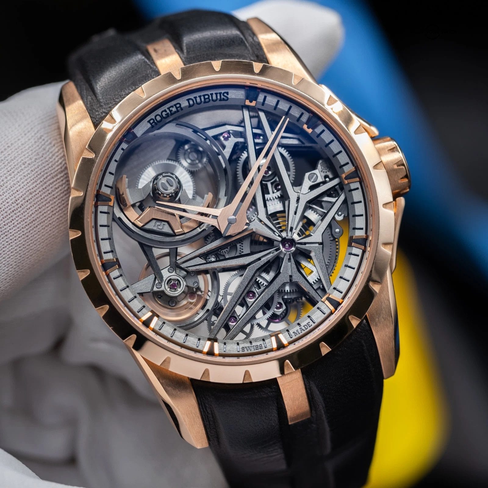 Bold, architectural, and utterly mesmerizing, the 2025 Roger Dubuis Excalibur Monobalancier Ref. DBEX0954 is a statement piece that pushes modern haute horology to its absolute limits. Featuring one of the most impressive skeleton dials on the market, this timepiece offers an unobstructed view of its hand-finished mechanics — a living, breathing work of art. The Maison’s signature star motif appears to levitate freely above the barrel, reinforcing the watch’s architectural depth and striking three-dimensional presence.