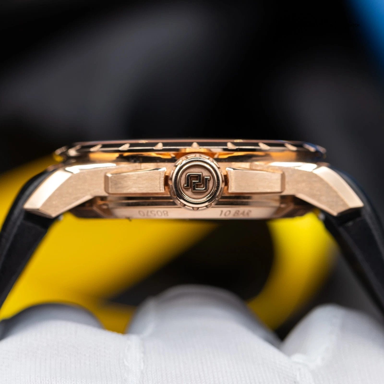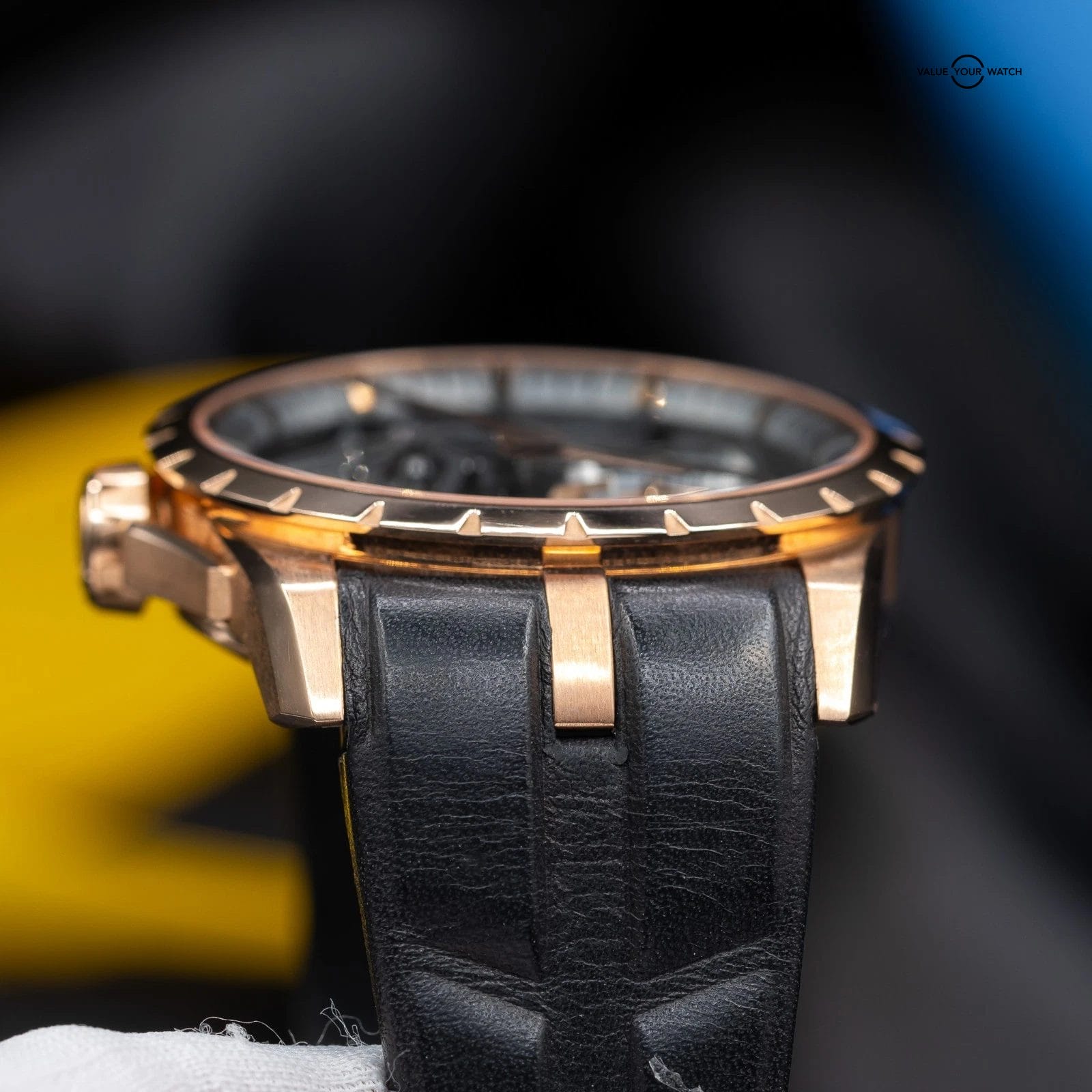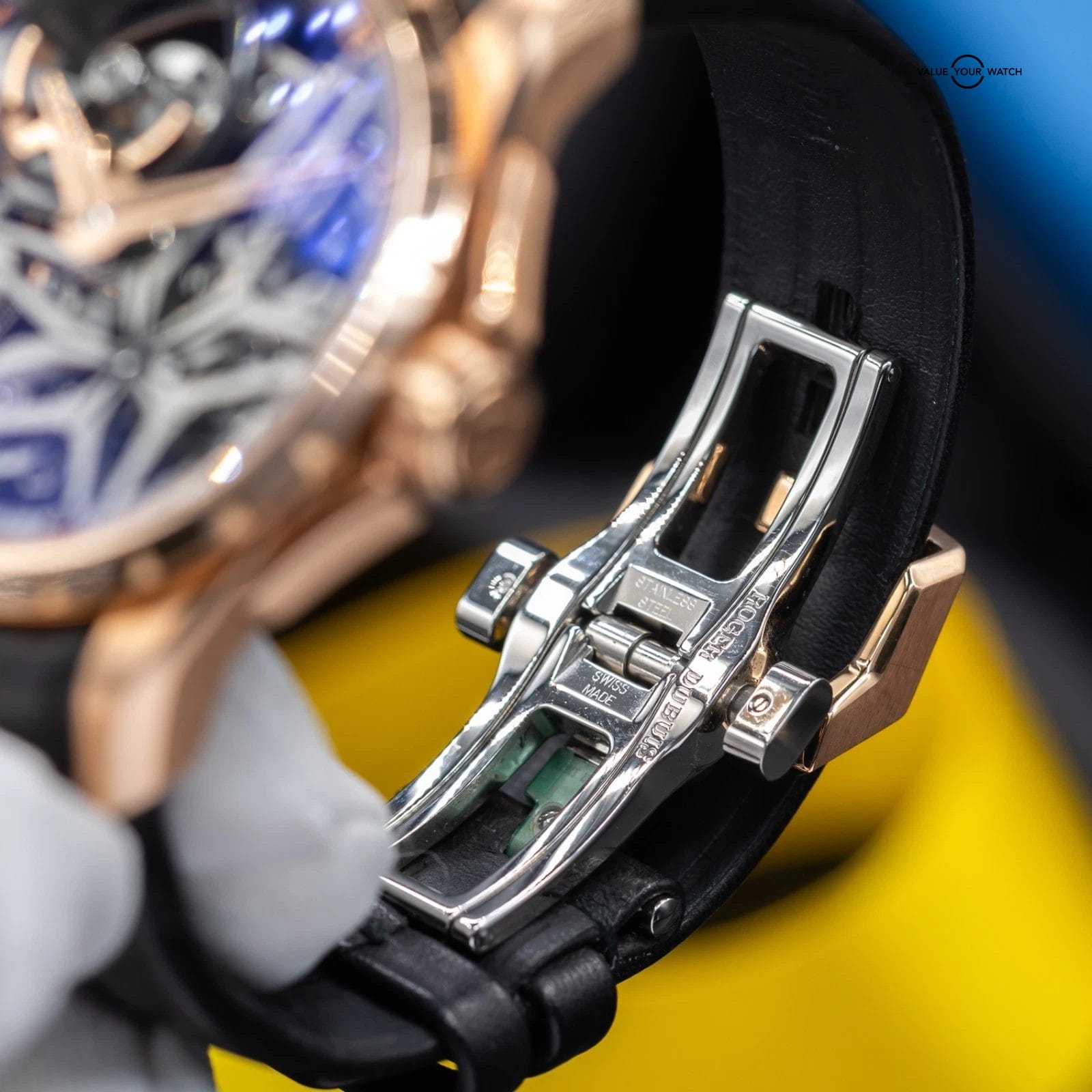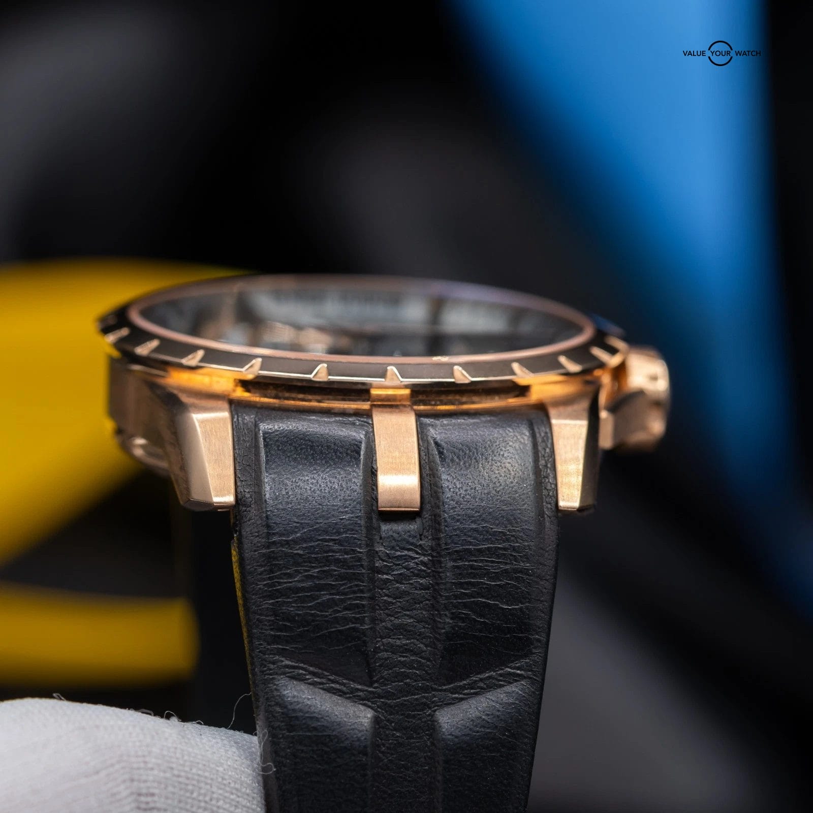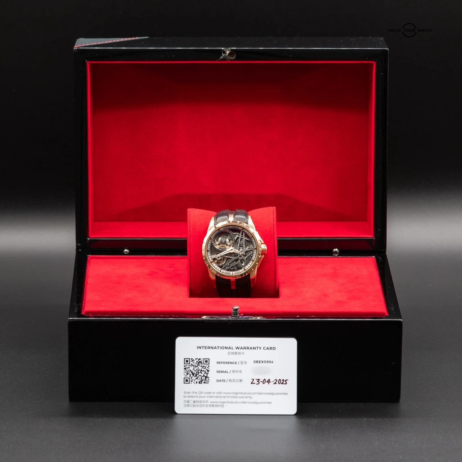 Crafted entirely in rose gold from case to crown to open caseback, the watch delivers exceptional wrist presence and avant-garde sophistication. Comprising 178 hand-finished and hand-assembled components, every element of the Excalibur Monobalancier is meticulously finished by hand — a rare distinction in modern watchmaking and a true testament to Roger Dubuis’ uncompromising standards.
